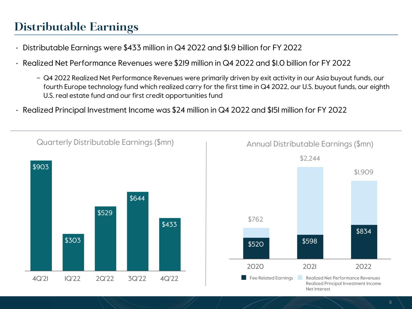 R-14 7 G-19 5 B-19 7 R-88 G-15 9 B-16 5 R-13 6 G-18 0 B-83 R-16 3 G-14 3 B-18 7 R-0 G-74 B-13 6 R-18 5 G-21 1 B-15 3 R-11 8 G-92 B-15 0 R-22 0 G-22 1 B-23 2 R-14 0 G-14 1 B-15 2R-12 0 G-16 9 B-22 2 Old Colors R-88 G-89 B-91 58595B R-23 G-234 B-234 EAEAEA R-208 G-232 B-247 D0E8F7 R-65 G-64 B-66 414042 R-8 G-51 B-94 08335E R-167 G-169 B-171 A7A9AB R-9 G-102 B-112 096670 R-220 G-221 B-222 DCDDDE R-97 G-161 B-224 61A1E0 R-237 G-217 B-157 EDD99D R-147 G-195 B-197 93C3C5 Distributable Earnings • Distributable Earnings were $433 million in Q4 2022 and $1.9 billion for FY 2022 • Realized Net Performance Revenues were $219 million in Q4 2022 and $1.0 billion for FY 2022 – Q4 2022 Realized Net Performance Revenues were primarily driven by exit activity in our Asia buyout funds, our fourth Europe technology fund which realized carry for the first time in Q4 2022, our U.S. buyout funds, our eighth U.S. real estate fund and our first credit opportunities fund • Realized Principal Investment Income was $24 million in Q4 2022 and $151 million for FY 2022 Quarterly Distributable Earnings ($mn) $903 $303 $529 $644 $433 4Q'21 1Q'22 2Q'22 3Q'22 4Q'22 Annual Distributable Earnings ($mn) $520 $598 $834 $762 $2,244 $1,909 Fee Related Earnings Realized Net Performance Revenues Realized Principal Investment Income Net Interest 2020 2021 2022 8