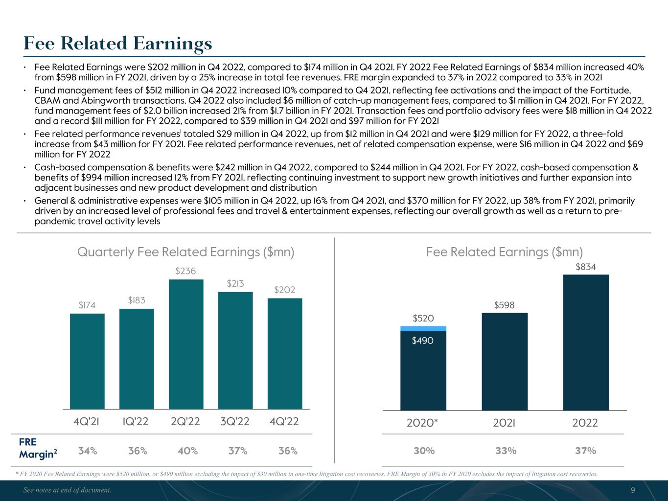 R-14 7 G-19 5 B-19 7 R-88 G-15 9 B-16 5 R-13 6 G-18 0 B-83 R-16 3 G-14 3 B-18 7 R-0 G-74 B-13 6 R-18 5 G-21 1 B-15 3 R-11 8 G-92 B-15 0 R-22 0 G-22 1 B-23 2 R-14 0 G-14 1 B-15 2R-12 0 G-16 9 B-22 2 Old Colors R-88 G-89 B-91 58595B R-23 G-234 B-234 EAEAEA R-208 G-232 B-247 D0E8F7 R-65 G-64 B-66 414042 R-8 G-51 B-94 08335E R-167 G-169 B-171 A7A9AB R-9 G-102 B-112 096670 R-220 G-221 B-222 DCDDDE R-97 G-161 B-224 61A1E0 R-237 G-217 B-157 EDD99D R-147 G-195 B-197 93C3C5 Fee Related Earnings • Fee Related Earnings were $202 million in Q4 2022, compared to $174 million in Q4 2021. FY 2022 Fee Related Earnings of $834 million increased 40% from $598 million in FY 2021, driven by a 25% increase in total fee revenues. FRE margin expanded to 37% in 2022 compared to 33% in 2021 • Fund management fees of $512 million in Q4 2022 increased 10% compared to Q4 2021, reflecting fee activations and the impact of the Fortitude, CBAM and Abingworth transactions. Q4 2022 also included $6 million of catch-up management fees, compared to $1 million in Q4 2021. For FY 2022, fund management fees of $2.0 billion increased 21% from $1.7 billion in FY 2021. Transaction fees and portfolio advisory fees were $18 million in Q4 2022 and a record $111 million for FY 2022, compared to $39 million in Q4 2021 and $97 million for FY 2021 • Fee related performance revenues1 totaled $29 million in Q4 2022, up from $12 million in Q4 2021 and were $129 million for FY 2022, a three-fold increase from $43 million for FY 2021. Fee related performance revenues, net of related compensation expense, were $16 million in Q4 2022 and $69 million for FY 2022 • Cash-based compensation & benefits were $242 million in Q4 2022, compared to $244 million in Q4 2021. For FY 2022, cash-based compensation & benefits of $994 million increased 12% from FY 2021, reflecting continuing investment to support new growth initiatives and further expansion into adjacent businesses and new product development and distribution • General & administrative expenses were $105 million in Q4 2022, up 16% from Q4 2021, and $370 million for FY 2022, up 38% from FY 2021, primarily driven by an increased level of professional fees and travel & entertainment expenses, reflecting our overall growth as well as a return to pre- pandemic travel activity levels Quarterly Fee Related Earnings ($mn) $174 $183 $236 $213 $202 4Q'21 1Q'22 2Q'22 3Q'22 4Q'22 FRE Margin2 34% 36% 40% 37% 36% 30% 33% 37% 9See notes at end of document. Fee Related Earnings ($mn) $520 $598 $834 $490 2020* 2021 2022 * FY 2020 Fee Related Earnings were $520 million, or $490 million excluding the impact of $30 million in one-time litigation cost recoveries. FRE Margin of 30% in FY 2020 excludes the impact of litigation cost recoveries.