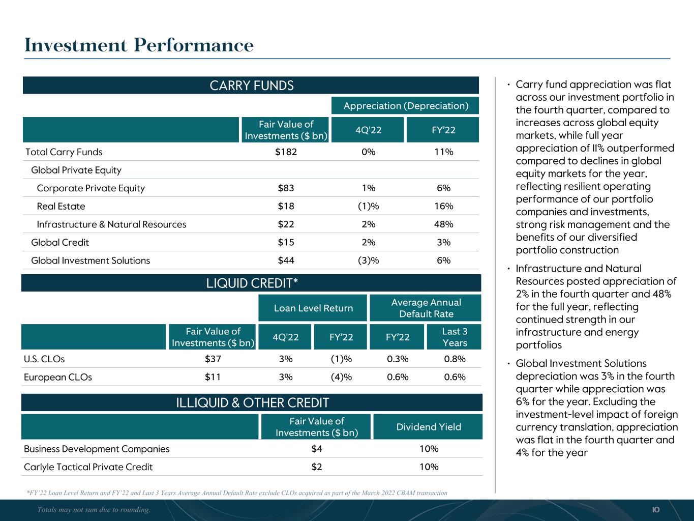 R-14 7 G-19 5 B-19 7 R-88 G-15 9 B-16 5 R-13 6 G-18 0 B-83 R-16 3 G-14 3 B-18 7 R-0 G-74 B-13 6 R-18 5 G-21 1 B-15 3 R-11 8 G-92 B-15 0 R-22 0 G-22 1 B-23 2 R-14 0 G-14 1 B-15 2R-12 0 G-16 9 B-22 2 Old Colors R-88 G-89 B-91 58595B R-23 G-234 B-234 EAEAEA R-208 G-232 B-247 D0E8F7 R-65 G-64 B-66 414042 R-8 G-51 B-94 08335E R-167 G-169 B-171 A7A9AB R-9 G-102 B-112 096670 R-220 G-221 B-222 DCDDDE R-97 G-161 B-224 61A1E0 R-237 G-217 B-157 EDD99D R-147 G-195 B-197 93C3C5 Investment Performance 10Totals may not sum due to rounding. $490 • Carry fund appreciation was flat across our investment portfolio in the fourth quarter, compared to increases across global equity markets, while full year appreciation of 11% outperformed compared to declines in global equity markets for the year, reflecting resilient operating performance of our portfolio companies and investments, strong risk management and the benefits of our diversified portfolio construction • Infrastructure and Natural Resources posted appreciation of 2% in the fourth quarter and 48% for the full year, reflecting continued strength in our infrastructure and energy portfolios • Global Investment Solutions depreciation was 3% in the fourth quarter while appreciation was 6% for the year. Excluding the investment-level impact of foreign currency translation, appreciation was flat in the fourth quarter and 4% for the year 1 LIQUID CREDIT* Loan Level Return Average Annual Default Rate Fair Value of Investments ($ bn) 4Q'22 FY’22 FY’22 Last 3 Years U.S. CLOs $37 3% (1)% 0.3% 0.8% European CLOs $11 3% (4)% 0.6% 0.6% CARRY FUNDS Appreciation (Depreciation) Fair Value of Investments ($ bn) 4Q'22 FY’22 Total Carry Funds $182 0% 11% Global Private Equity Corporate Private Equity $83 1% 6% Real Estate $18 (1)% 16% Infrastructure & Natural Resources $22 2% 48% Global Credit $15 2% 3% Global Investment Solutions $44 (3)% 6% ILLIQUID & OTHER CREDIT Fair Value of Investments ($ bn) Dividend Yield Business Development Companies $4 10% Carlyle Tactical Private Credit $2 10% *FY’22 Loan Level Return and FY’22 and Last 3 Years Average Annual Default Rate exclude CLOs acquired as part of the March 2022 CBAM transaction