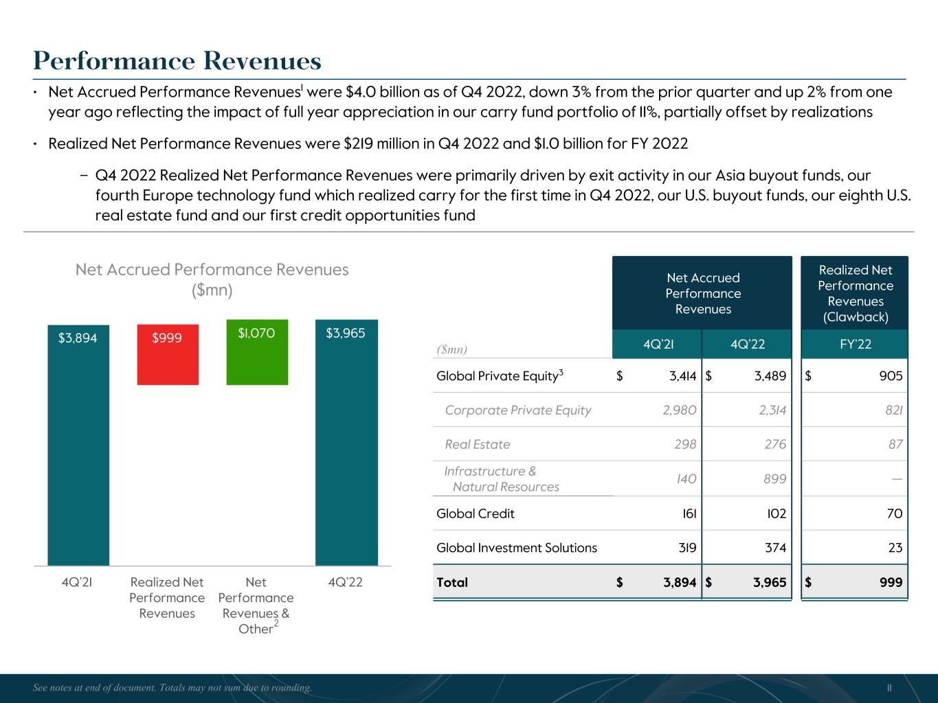 R-14 7 G-19 5 B-19 7 R-88 G-15 9 B-16 5 R-13 6 G-18 0 B-83 R-16 3 G-14 3 B-18 7 R-0 G-74 B-13 6 R-18 5 G-21 1 B-15 3 R-11 8 G-92 B-15 0 R-22 0 G-22 1 B-23 2 R-14 0 G-14 1 B-15 2R-12 0 G-16 9 B-22 2 Old Colors R-88 G-89 B-91 58595B R-23 G-234 B-234 EAEAEA R-208 G-232 B-247 D0E8F7 R-65 G-64 B-66 414042 R-8 G-51 B-94 08335E R-167 G-169 B-171 A7A9AB R-9 G-102 B-112 096670 R-220 G-221 B-222 DCDDDE R-97 G-161 B-224 61A1E0 R-237 G-217 B-157 EDD99D R-147 G-195 B-197 93C3C5 • Net Accrued Performance Revenues1 were $4.0 billion as of Q4 2022, down 3% from the prior quarter and up 2% from one year ago reflecting the impact of full year appreciation in our carry fund portfolio of 11%, partially offset by realizations • Realized Net Performance Revenues were $219 million in Q4 2022 and $1.0 billion for FY 2022 – Q4 2022 Realized Net Performance Revenues were primarily driven by exit activity in our Asia buyout funds, our fourth Europe technology fund which realized carry for the first time in Q4 2022, our U.S. buyout funds, our eighth U.S. real estate fund and our first credit opportunities fund Net Accrued Performance Revenues ($mn) $3,894 $2,895.0 $2,895.0 $3,965$999 $1,070 4Q’21 Realized Net Performance Revenues Net Performance Revenues & Other 4Q’22 Performance Revenues 2 11 Net Accrued Performance Revenues Realized Net Performance Revenues (Clawback) ($mn) 4Q’21 4Q’22 FY’22 Global Private Equity3 $ 3,414 $ 3,489 $ 905 Corporate Private Equity 2,980 2,314 821 Real Estate 298 276 87 Infrastructure & Natural Resources 140 899 — Global Credit 161 102 70 Global Investment Solutions 319 374 23 Total $ 3,894 $ 3,965 $ 999 See notes at end of document. Totals may not sum due to rounding.