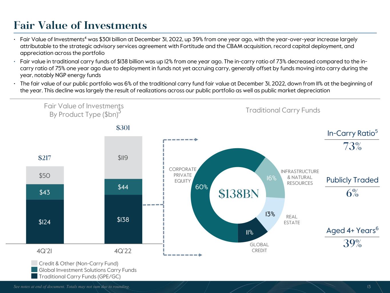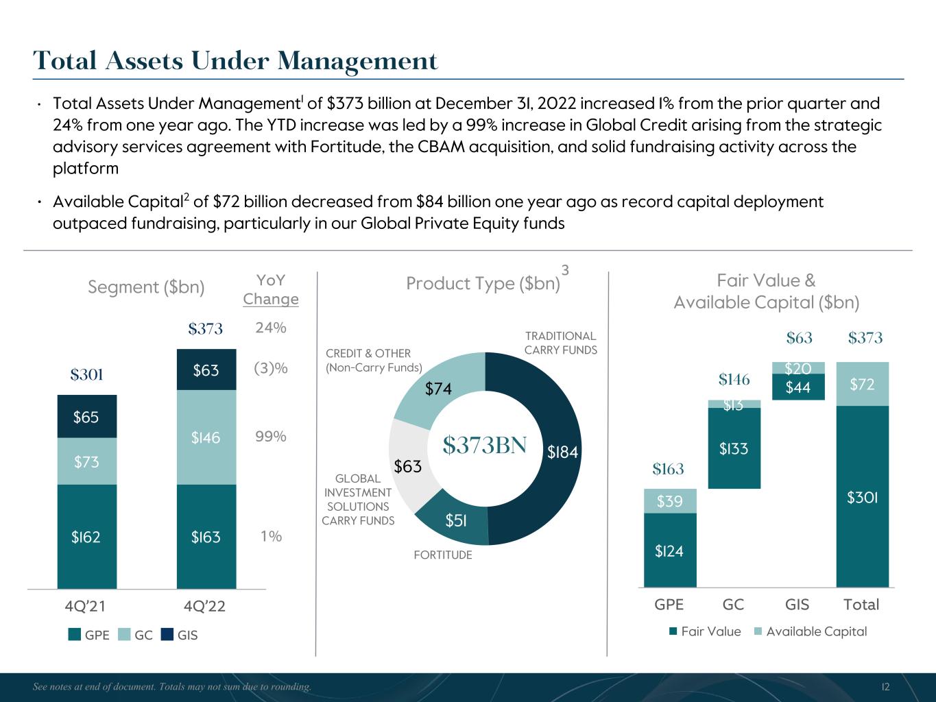 R-14 7 G-19 5 B-19 7 R-88 G-15 9 B-16 5 R-13 6 G-18 0 B-83 R-16 3 G-14 3 B-18 7 R-0 G-74 B-13 6 R-18 5 G-21 1 B-15 3 R-11 8 G-92 B-15 0 R-22 0 G-22 1 B-23 2 R-14 0 G-14 1 B-15 2R-12 0 G-16 9 B-22 2 Old Colors R-88 G-89 B-91 58595B R-23 G-234 B-234 EAEAEA R-208 G-232 B-247 D0E8F7 R-65 G-64 B-66 414042 R-8 G-51 B-94 08335E R-167 G-169 B-171 A7A9AB R-9 G-102 B-112 096670 R-220 G-221 B-222 DCDDDE R-97 G-161 B-224 61A1E0 R-237 G-217 B-157 EDD99D R-147 G-195 B-197 93C3C5 Total Assets Under Management • Total Assets Under Management1 of $373 billion at December 31, 2022 increased 1% from the prior quarter and 24% from one year ago. The YTD increase was led by a 99% increase in Global Credit arising from the strategic advisory services agreement with Fortitude, the CBAM acquisition, and solid fundraising activity across the platform • Available Capital2 of $72 billion decreased from $84 billion one year ago as record capital deployment outpaced fundraising, particularly in our Global Private Equity funds Segment ($bn) $162 $163 $73 $146 $65 $63$301 $373 GPE GC GIS 4Q’21 4Q’22 Product Type ($bn) $184 $51 $63 $74 $373BN Fair Value & Available Capital ($bn) $124 $133 $44 $301$39 $13 $20 $72 GPE GC GIS Total n Fair Value n Available Capital $373 $163 $146 $63 YoY Change 24% (3)% 99% 1% TRADITIONAL CARRY FUNDS GLOBAL INVESTMENT SOLUTIONS CARRY FUNDS CREDIT & OTHER (Non-Carry Funds) 3 12See notes at end of document. Totals may not sum due to rounding. FORTITUDE