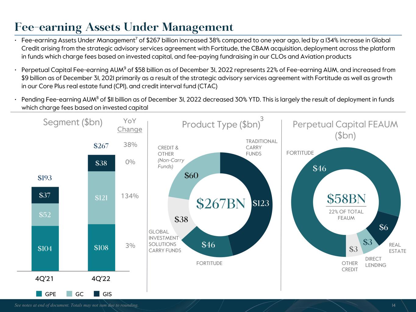 R-14 7 G-19 5 B-19 7 R-88 G-15 9 B-16 5 R-13 6 G-18 0 B-83 R-16 3 G-14 3 B-18 7 R-0 G-74 B-13 6 R-18 5 G-21 1 B-15 3 R-11 8 G-92 B-15 0 R-22 0 G-22 1 B-23 2 R-14 0 G-14 1 B-15 2R-12 0 G-16 9 B-22 2 Old Colors R-88 G-89 B-91 58595B R-23 G-234 B-234 EAEAEA R-208 G-232 B-247 D0E8F7 R-65 G-64 B-66 414042 R-8 G-51 B-94 08335E R-167 G-169 B-171 A7A9AB R-9 G-102 B-112 096670 R-220 G-221 B-222 DCDDDE R-97 G-161 B-224 61A1E0 R-237 G-217 B-157 EDD99D R-147 G-195 B-197 93C3C5 Product Type ($bn) $123 $46 $38 $60 Fee-earning Assets Under Management • Fee-earning Assets Under Management7 of $267 billion increased 38% compared to one year ago, led by a 134% increase in Global Credit arising from the strategic advisory services agreement with Fortitude, the CBAM acquisition, deployment across the platform in funds which charge fees based on invested capital, and fee-paying fundraising in our CLOs and Aviation products • Perpetual Capital Fee-earning AUM9 of $58 billion as of December 31, 2022 represents 22% of Fee-earning AUM, and increased from $9 billion as of December 31, 2021 primarily as a result of the strategic advisory services agreement with Fortitude as well as growth in our Core Plus real estate fund (CPI), and credit interval fund (CTAC) • Pending Fee-earning AUM8 of $11 billion as of December 31, 2022 decreased 30% YTD. This is largely the result of deployment in funds which charge fees based on invested capital Segment ($bn) $104 $108 $52 $121$37 $38 $193 $267 GPE GC GIS 4Q’21 4Q’22 $267BN YoY Change 38% 0% 134% 3% TRADITIONAL CARRY FUNDS GLOBAL INVESTMENT SOLUTIONS CARRY FUNDS CREDIT & OTHER (Non-Carry Funds) 3 14See notes at end of document. Totals may not sum due to rounding. $46 $6 $3 $3 FORTITUDE 22% OF TOTAL FEAUM $58BN OTHER CREDIT DIRECT LENDING REAL ESTATE Perpetual Capital FEAUM ($bn) FORTITUDE