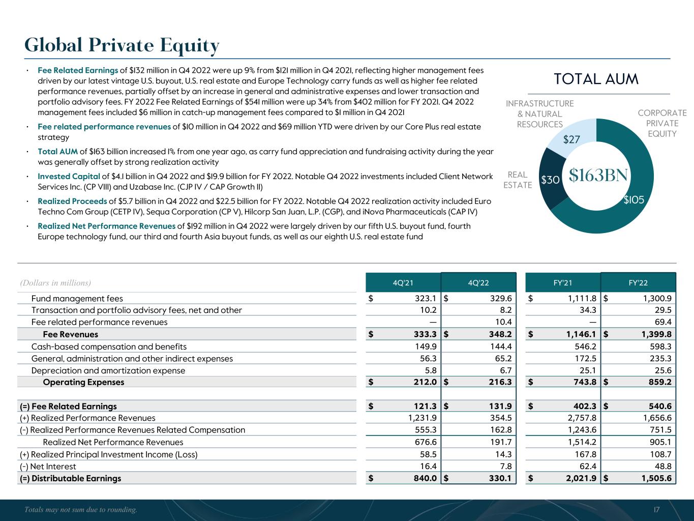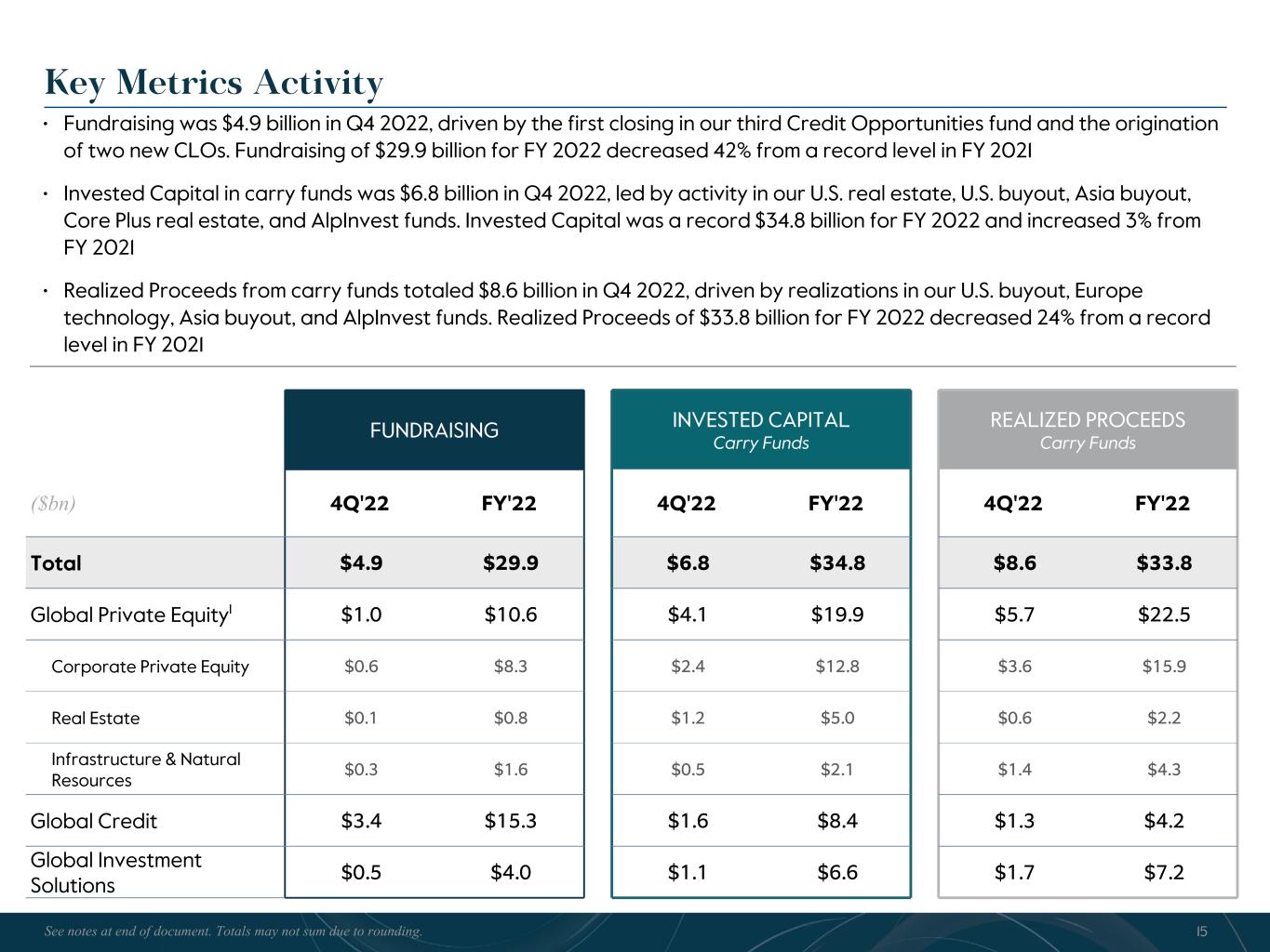 R-14 7 G-19 5 B-19 7 R-88 G-15 9 B-16 5 R-13 6 G-18 0 B-83 R-16 3 G-14 3 B-18 7 R-0 G-74 B-13 6 R-18 5 G-21 1 B-15 3 R-11 8 G-92 B-15 0 R-22 0 G-22 1 B-23 2 R-14 0 G-14 1 B-15 2R-12 0 G-16 9 B-22 2 Old Colors R-88 G-89 B-91 58595B R-23 G-234 B-234 EAEAEA R-208 G-232 B-247 D0E8F7 R-65 G-64 B-66 414042 R-8 G-51 B-94 08335E R-167 G-169 B-171 A7A9AB R-9 G-102 B-112 096670 R-220 G-221 B-222 DCDDDE R-97 G-161 B-224 61A1E0 R-237 G-217 B-157 EDD99D R-147 G-195 B-197 93C3C5 Key Metrics Activity • Fundraising was $4.9 billion in Q4 2022, driven by the first closing in our third Credit Opportunities fund and the origination of two new CLOs. Fundraising of $29.9 billion for FY 2022 decreased 42% from a record level in FY 2021 • Invested Capital in carry funds was $6.8 billion in Q4 2022, led by activity in our U.S. real estate, U.S. buyout, Asia buyout, Core Plus real estate, and AlpInvest funds. Invested Capital was a record $34.8 billion for FY 2022 and increased 3% from FY 2021 • Realized Proceeds from carry funds totaled $8.6 billion in Q4 2022, driven by realizations in our U.S. buyout, Europe technology, Asia buyout, and AlpInvest funds. Realized Proceeds of $33.8 billion for FY 2022 decreased 24% from a record level in FY 2021 FUNDRAISING INVESTED CAPITAL Carry Funds REALIZED PROCEEDS Carry Funds ($bn) 4Q'22 FY'22 4Q'22 FY'22 4Q'22 FY'22 Total $4.9 $29.9 $6.8 $34.8 $8.6 $33.8 Global Private Equity1 $1.0 $10.6 $4.1 $19.9 $5.7 $22.5 Corporate Private Equity $0.6 $8.3 $2.4 $12.8 $3.6 $15.9 Real Estate $0.1 $0.8 $1.2 $5.0 $0.6 $2.2 Infrastructure & Natural Resources $0.3 $1.6 $0.5 $2.1 $1.4 $4.3 Global Credit $3.4 $15.3 $1.6 $8.4 $1.3 $4.2 Global Investment Solutions $0.5 $4.0 $1.1 $6.6 $1.7 $7.2 15See notes at end of document. Totals may not sum due to rounding.