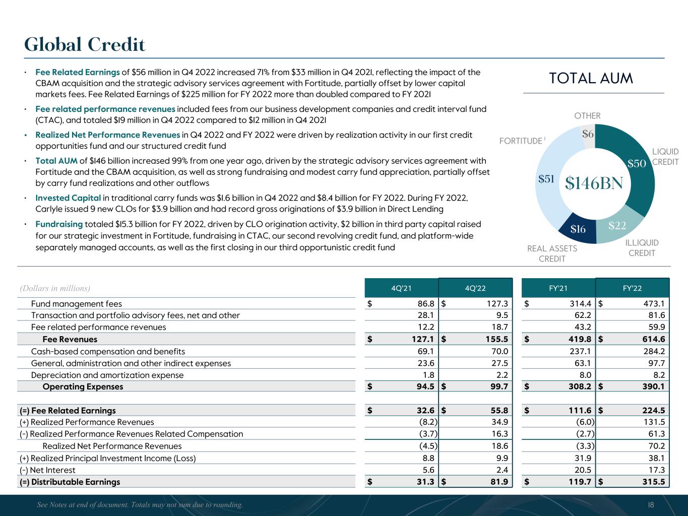 R-14 7 G-19 5 B-19 7 R-88 G-15 9 B-16 5 R-13 6 G-18 0 B-83 R-16 3 G-14 3 B-18 7 R-0 G-74 B-13 6 R-18 5 G-21 1 B-15 3 R-11 8 G-92 B-15 0 R-22 0 G-22 1 B-23 2 R-14 0 G-14 1 B-15 2R-12 0 G-16 9 B-22 2 Old Colors R-88 G-89 B-91 58595B R-23 G-234 B-234 EAEAEA R-208 G-232 B-247 D0E8F7 R-65 G-64 B-66 414042 R-8 G-51 B-94 08335E R-167 G-169 B-171 A7A9AB R-9 G-102 B-112 096670 R-220 G-221 B-222 DCDDDE R-97 G-161 B-224 61A1E0 R-237 G-217 B-157 EDD99D R-147 G-195 B-197 93C3C5 Global Credit • Fee Related Earnings of $56 million in Q4 2022 increased 71% from $33 million in Q4 2021, reflecting the impact of the CBAM acquisition and the strategic advisory services agreement with Fortitude, partially offset by lower capital markets fees. Fee Related Earnings of $225 million for FY 2022 more than doubled compared to FY 2021 • Fee related performance revenues included fees from our business development companies and credit interval fund (CTAC), and totaled $19 million in Q4 2022 compared to $12 million in Q4 2021 • Realized Net Performance Revenues in Q4 2022 and FY 2022 were driven by realization activity in our first credit opportunities fund and our structured credit fund • Total AUM of $146 billion increased 99% from one year ago, driven by the strategic advisory services agreement with Fortitude and the CBAM acquisition, as well as strong fundraising and modest carry fund appreciation, partially offset by carry fund realizations and other outflows • Invested Capital in traditional carry funds was $1.6 billion in Q4 2022 and $8.4 billion for FY 2022. During FY 2022, Carlyle issued 9 new CLOs for $3.9 billion and had record gross originations of $3.9 billion in Direct Lending • Fundraising totaled $15.3 billion for FY 2022, driven by CLO origination activity, $2 billion in third party capital raised for our strategic investment in Fortitude, fundraising in CTAC, our second revolving credit fund, and platform-wide separately managed accounts, as well as the first closing in our third opportunistic credit fund (Dollars in millions) 4Q'21 4Q'22 FY'21 FY'22 Fund management fees $ 86.8 $ 127.3 $ 314.4 $ 473.1 Transaction and portfolio advisory fees, net and other 28.1 9.5 62.2 81.6 Fee related performance revenues 12.2 18.7 43.2 59.9 Fee Revenues $ 127.1 $ 155.5 $ 419.8 $ 614.6 Cash-based compensation and benefits 69.1 70.0 237.1 284.2 General, administration and other indirect expenses 23.6 27.5 63.1 97.7 Depreciation and amortization expense 1.8 2.2 8.0 8.2 Operating Expenses $ 94.5 $ 99.7 $ 308.2 $ 390.1 (=) Fee Related Earnings $ 32.6 $ 55.8 $ 111.6 $ 224.5 (+) Realized Performance Revenues (8.2) 34.9 (6.0) 131.5 (-) Realized Performance Revenues Related Compensation (3.7) 16.3 (2.7) 61.3 Realized Net Performance Revenues (4.5) 18.6 (3.3) 70.2 (+) Realized Principal Investment Income (Loss) 8.8 9.9 31.9 38.1 (-) Net Interest 5.6 2.4 20.5 17.3 (=) Distributable Earnings $ 31.3 $ 81.9 $ 119.7 $ 315.5 $50 $22$16 $51 $6 LIQUID CREDIT REAL ASSETS CREDIT $146BN 18 OTHER See Notes at end of document. Totals may not sum due to rounding. TOTAL AUM ILLIQUID CREDIT FORTITUDE 1