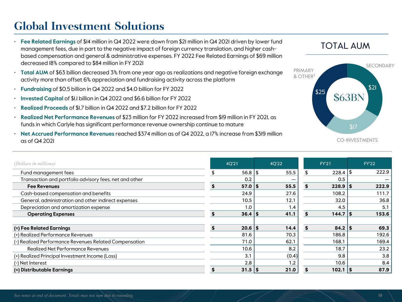 R-14 7 G-19 5 B-19 7 R-88 G-15 9 B-16 5 R-13 6 G-18 0 B-83 R-16 3 G-14 3 B-18 7 R-0 G-74 B-13 6 R-18 5 G-21 1 B-15 3 R-11 8 G-92 B-15 0 R-22 0 G-22 1 B-23 2 R-14 0 G-14 1 B-15 2R-12 0 G-16 9 B-22 2 Old Colors R-88 G-89 B-91 58595B R-23 G-234 B-234 EAEAEA R-208 G-232 B-247 D0E8F7 R-65 G-64 B-66 414042 R-8 G-51 B-94 08335E R-167 G-169 B-171 A7A9AB R-9 G-102 B-112 096670 R-220 G-221 B-222 DCDDDE R-97 G-161 B-224 61A1E0 R-237 G-217 B-157 EDD99D R-147 G-195 B-197 93C3C5 Global Investment Solutions • Fee Related Earnings of $14 million in Q4 2022 were down from $21 million in Q4 2021 driven by lower fund management fees, due in part to the negative impact of foreign currency translation, and higher cash- based compensation and general & administrative expenses. FY 2022 Fee Related Earnings of $69 million decreased 18% compared to $84 million in FY 2021 • Total AUM of $63 billion decreased 3% from one year ago as realizations and negative foreign exchange activity more than offset 6% appreciation and fundraising activity across the platform • Fundraising of $0.5 billion in Q4 2022 and $4.0 billion for FY 2022 • Invested Capital of $1.1 billion in Q4 2022 and $6.6 billion for FY 2022 • Realized Proceeds of $1.7 billion in Q4 2022 and $7.2 billion for FY 2022 • Realized Net Performance Revenues of $23 million for FY 2022 increased from $19 million in FY 2021, as funds in which Carlyle has significant performance revenue ownership continue to mature • Net Accrued Performance Revenues reached $374 million as of Q4 2022, a 17% increase from $319 million as of Q4 2021 (Dollars in millions) 4Q'21 4Q'22 FY'21 FY'22 Fund management fees $ 56.8 $ 55.5 $ 228.4 $ 222.9 Transaction and portfolio advisory fees, net and other 0.2 — 0.5 — Fee Revenues $ 57.0 $ 55.5 $ 228.9 $ 222.9 Cash-based compensation and benefits 24.9 27.6 108.2 111.7 General, administration and other indirect expenses 10.5 12.1 32.0 36.8 Depreciation and amortization expense 1.0 1.4 4.5 5.1 Operating Expenses $ 36.4 $ 41.1 $ 144.7 $ 153.6 (=) Fee Related Earnings $ 20.6 $ 14.4 $ 84.2 $ 69.3 (+) Realized Performance Revenues 81.6 70.3 186.8 192.6 (-) Realized Performance Revenues Related Compensation 71.0 62.1 168.1 169.4 Realized Net Performance Revenues 10.6 8.2 18.7 23.2 (+) Realized Principal Investment Income (Loss) 3.1 (0.4) 9.8 3.8 (-) Net Interest 2.8 1.2 10.6 8.4 (=) Distributable Earnings $ 31.5 $ 21.0 $ 102.1 $ 87.9 $21 $17 $25 SECONDARY CO-INVESTMENTS PRIMARY & OTHER2 $63BN 19See notes at end of document. Totals may not sum due to rounding. TOTAL AUM