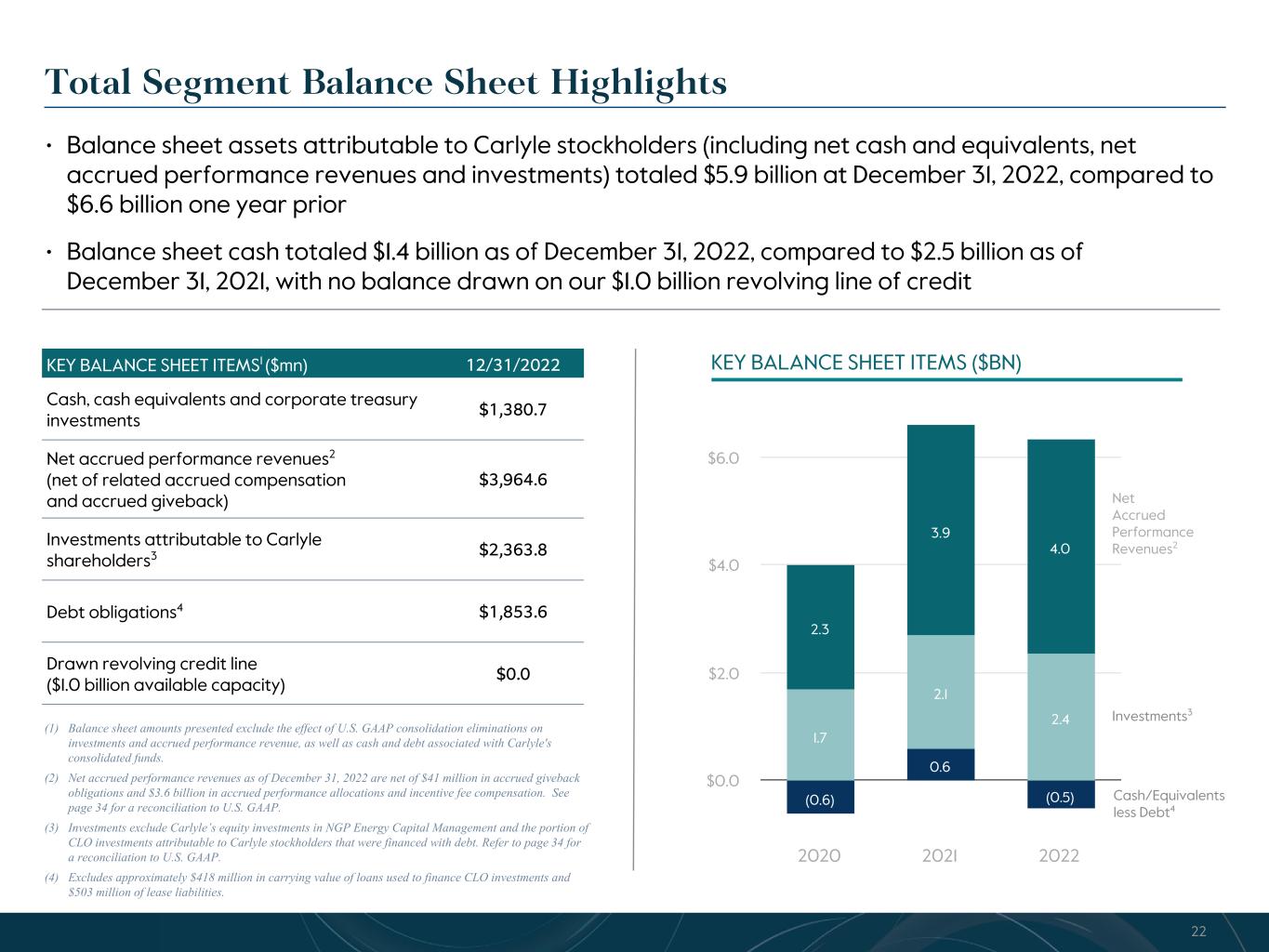 R-14 7 G-19 5 B-19 7 R-88 G-15 9 B-16 5 R-13 6 G-18 0 B-83 R-16 3 G-14 3 B-18 7 R-0 G-74 B-13 6 R-18 5 G-21 1 B-15 3 R-11 8 G-92 B-15 0 R-22 0 G-22 1 B-23 2 R-14 0 G-14 1 B-15 2R-12 0 G-16 9 B-22 2 Old Colors R-88 G-89 B-91 58595B R-23 G-234 B-234 EAEAEA R-208 G-232 B-247 D0E8F7 R-65 G-64 B-66 414042 R-8 G-51 B-94 08335E R-167 G-169 B-171 A7A9AB R-9 G-102 B-112 096670 R-220 G-221 B-222 DCDDDE R-97 G-161 B-224 61A1E0 R-237 G-217 B-157 EDD99D R-147 G-195 B-197 93C3C5 Total Segment Balance Sheet Highlights • Balance sheet assets attributable to Carlyle stockholders (including net cash and equivalents, net accrued performance revenues and investments) totaled $5.9 billion at December 31, 2022, compared to $6.6 billion one year prior • Balance sheet cash totaled $1.4 billion as of December 31, 2022, compared to $2.5 billion as of December 31, 2021, with no balance drawn on our $1.0 billion revolving line of credit KEY BALANCE SHEET ITEMS1 ($mn) 12/31/2022 Cash, cash equivalents and corporate treasury investments $1,380.7 Net accrued performance revenues2 (net of related accrued compensation and accrued giveback) $3,964.6 Investments attributable to Carlyle shareholders3 $2,363.8 Debt obligations4 $1,853.6 Drawn revolving credit line ($1.0 billion available capacity) $0.0 (1) Balance sheet amounts presented exclude the effect of U.S. GAAP consolidation eliminations on investments and accrued performance revenue, as well as cash and debt associated with Carlyle's consolidated funds. (2) Net accrued performance revenues as of December 31, 2022 are net of $41 million in accrued giveback obligations and $3.6 billion in accrued performance allocations and incentive fee compensation. See page 34 for a reconciliation to U.S. GAAP. (3) Investments exclude Carlyle’s equity investments in NGP Energy Capital Management and the portion of CLO investments attributable to Carlyle stockholders that were financed with debt. Refer to page 34 for a reconciliation to U.S. GAAP. (4) Excludes approximately $418 million in carrying value of loans used to finance CLO investments and $503 million of lease liabilities. (0.6) 0.6 (0.5) 1.7 2.1 2.4 2.3 3.9 4.0 2020 2021 2022 $0.0 $2.0 $4.0 $6.0 KEY BALANCE SHEET ITEMS ($BN) Net Accrued Performance Revenues2 Investments3 Cash/Equivalents less Debt4 22