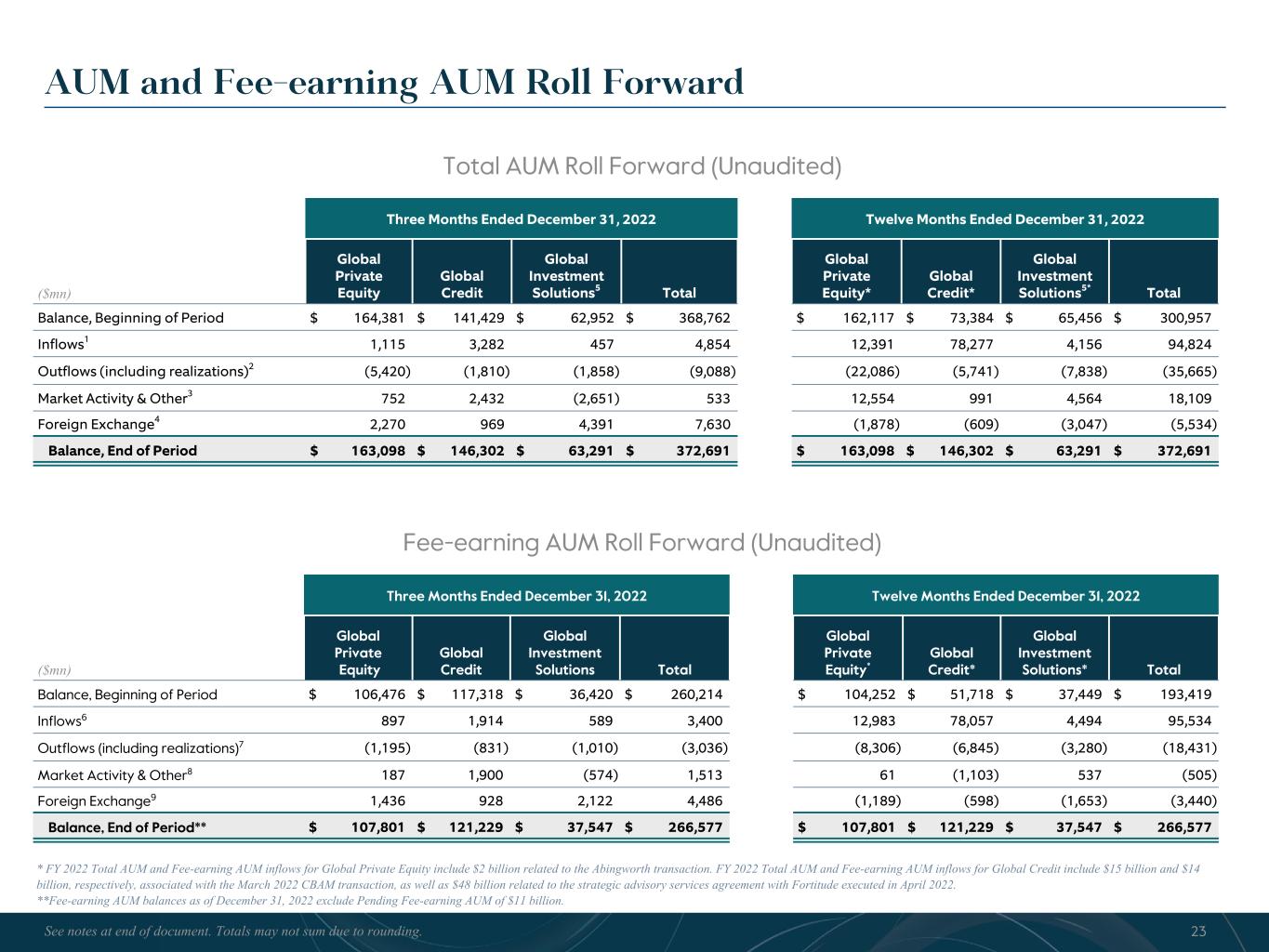 R-14 7 G-19 5 B-19 7 R-88 G-15 9 B-16 5 R-13 6 G-18 0 B-83 R-16 3 G-14 3 B-18 7 R-0 G-74 B-13 6 R-18 5 G-21 1 B-15 3 R-11 8 G-92 B-15 0 R-22 0 G-22 1 B-23 2 R-14 0 G-14 1 B-15 2R-12 0 G-16 9 B-22 2 Old Colors R-88 G-89 B-91 58595B R-23 G-234 B-234 EAEAEA R-208 G-232 B-247 D0E8F7 R-65 G-64 B-66 414042 R-8 G-51 B-94 08335E R-167 G-169 B-171 A7A9AB R-9 G-102 B-112 096670 R-220 G-221 B-222 DCDDDE R-97 G-161 B-224 61A1E0 R-237 G-217 B-157 EDD99D R-147 G-195 B-197 93C3C5 AUM and Fee-earning AUM Roll Forward Total AUM Roll Forward (Unaudited) Three Months Ended December 31, 2022 Twelve Months Ended December 31, 2022 ($mn) Global Private Equity Global Credit Global Investment Solutions5 Total Global Private Equity* Global Credit* Global Investment Solutions5* Total Balance, Beginning of Period $ 164,381 $ 141,429 $ 62,952 $ 368,762 $ 162,117 $ 73,384 $ 65,456 $ 300,957 Inflows1 1,115 3,282 457 4,854 12,391 78,277 4,156 94,824 Outflows (including realizations)2 (5,420) (1,810) (1,858) (9,088) (22,086) (5,741) (7,838) (35,665) Market Activity & Other3 752 2,432 (2,651) 533 12,554 991 4,564 18,109 Foreign Exchange4 2,270 969 4,391 7,630 (1,878) (609) (3,047) (5,534) Balance, End of Period $ 163,098 $ 146,302 $ 63,291 $ 372,691 $ 163,098 $ 146,302 $ 63,291 $ 372,691 Fee-earning AUM Roll Forward (Unaudited) Three Months Ended December 31, 2022 Twelve Months Ended December 31, 2022 ($mn) Global Private Equity Global Credit Global Investment Solutions Total Global Private Equity* Global Credit* Global Investment Solutions* Total Balance, Beginning of Period $ 106,476 $ 117,318 $ 36,420 $ 260,214 $ 104,252 $ 51,718 $ 37,449 $ 193,419 Inflows6 897 1,914 589 3,400 12,983 78,057 4,494 95,534 Outflows (including realizations)7 (1,195) (831) (1,010) (3,036) (8,306) (6,845) (3,280) (18,431) Market Activity & Other8 187 1,900 (574) 1,513 61 (1,103) 537 (505) Foreign Exchange9 1,436 928 2,122 4,486 (1,189) (598) (1,653) (3,440) Balance, End of Period** $ 107,801 $ 121,229 $ 37,547 $ 266,577 $ 107,801 $ 121,229 $ 37,547 $ 266,577 23See notes at end of document. Totals may not sum due to rounding. * FY 2022 Total AUM and Fee-earning AUM inflows for Global Private Equity include $2 billion related to the Abingworth transaction. FY 2022 Total AUM and Fee-earning AUM inflows for Global Credit include $15 billion and $14 billion, respectively, associated with the March 2022 CBAM transaction, as well as $48 billion related to the strategic advisory services agreement with Fortitude executed in April 2022. **Fee-earning AUM balances as of December 31, 2022 exclude Pending Fee-earning AUM of $11 billion.