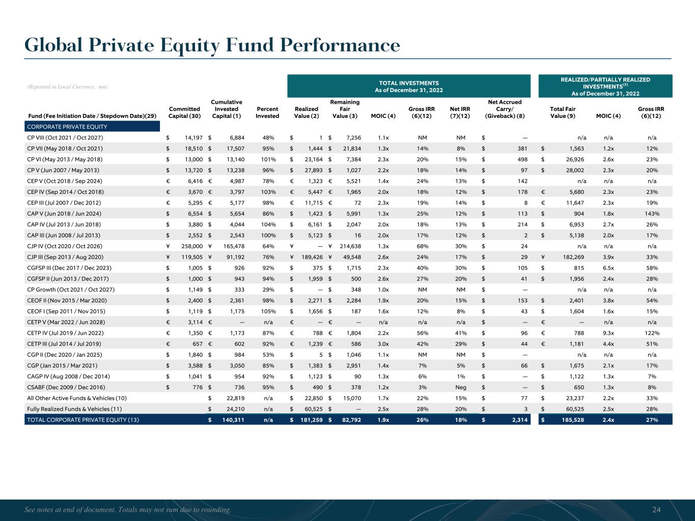 R-14 7 G-19 5 B-19 7 R-88 G-15 9 B-16 5 R-13 6 G-18 0 B-83 R-16 3 G-14 3 B-18 7 R-0 G-74 B-13 6 R-18 5 G-21 1 B-15 3 R-11 8 G-92 B-15 0 R-22 0 G-22 1 B-23 2 R-14 0 G-14 1 B-15 2R-12 0 G-16 9 B-22 2 Old Colors R-88 G-89 B-91 58595B R-23 G-234 B-234 EAEAEA R-208 G-232 B-247 D0E8F7 R-65 G-64 B-66 414042 R-8 G-51 B-94 08335E R-167 G-169 B-171 A7A9AB R-9 G-102 B-112 096670 R-220 G-221 B-222 DCDDDE R-97 G-161 B-224 61A1E0 R-237 G-217 B-157 EDD99D R-147 G-195 B-197 93C3C5 Global Private Equity Fund Performance (Reported in Local Currency, mn) TOTAL INVESTMENTS As of December 31, 2022 REALIZED/PARTIALLY REALIZED INVESTMENTS(5) As of December 31, 2022 Fund (Fee Initiation Date / Stepdown Date)(29) Committed Capital (30) Cumulative Invested Capital (1) Percent Invested Realized Value (2) Remaining Fair Value (3) MOIC (4) Gross IRR (6)(12) Net IRR (7)(12) Net Accrued Carry/ (Giveback) (8) Total Fair Value (9) MOIC (4) Gross IRR (6)(12) CORPORATE PRIVATE EQUITY CP VIII (Oct 2021 / Oct 2027) $ 14,197 $ 6,884 48% $ 1 $ 7,256 1.1x NM NM $ — n/a n/a n/a CP VII (May 2018 / Oct 2021) $ 18,510 $ 17,507 95% $ 1,444 $ 21,834 1.3x 14% 8% $ 381 $ 1,563 1.2x 12% CP VI (May 2013 / May 2018) $ 13,000 $ 13,140 101% $ 23,164 $ 7,384 2.3x 20% 15% $ 498 $ 26,926 2.6x 23% CP V (Jun 2007 / May 2013) $ 13,720 $ 13,238 96% $ 27,893 $ 1,027 2.2x 18% 14% $ 97 $ 28,002 2.3x 20% CEP V (Oct 2018 / Sep 2024) € 6,416 € 4,987 78% € 1,323 € 5,521 1.4x 24% 13% $ 142 n/a n/a n/a CEP IV (Sep 2014 / Oct 2018) € 3,670 € 3,797 103% € 5,447 € 1,965 2.0x 18% 12% $ 178 € 5,680 2.3x 23% CEP III (Jul 2007 / Dec 2012) € 5,295 € 5,177 98% € 11,715 € 72 2.3x 19% 14% $ 8 € 11,647 2.3x 19% CAP V (Jun 2018 / Jun 2024) $ 6,554 $ 5,654 86% $ 1,423 $ 5,991 1.3x 25% 12% $ 113 $ 904 1.8x 143% CAP IV (Jul 2013 / Jun 2018) $ 3,880 $ 4,044 104% $ 6,161 $ 2,047 2.0x 18% 13% $ 214 $ 6,953 2.7x 26% CAP III (Jun 2008 / Jul 2013) $ 2,552 $ 2,543 100% $ 5,123 $ 16 2.0x 17% 12% $ 2 $ 5,138 2.0x 17% CJP IV (Oct 2020 / Oct 2026) ¥ 258,000 ¥ 165,478 64% ¥ — ¥ 214,638 1.3x 68% 30% $ 24 n/a n/a n/a CJP III (Sep 2013 / Aug 2020) ¥ 119,505 ¥ 91,192 76% ¥ 189,426 ¥ 49,548 2.6x 24% 17% $ 29 ¥ 182,269 3.9x 33% CGFSP III (Dec 2017 / Dec 2023) $ 1,005 $ 926 92% $ 375 $ 1,715 2.3x 40% 30% $ 105 $ 815 6.5x 58% CGFSP II (Jun 2013 / Dec 2017) $ 1,000 $ 943 94% $ 1,959 $ 500 2.6x 27% 20% $ 41 $ 1,956 2.4x 28% CP Growth (Oct 2021 / Oct 2027) $ 1,149 $ 333 29% $ — $ 348 1.0x NM NM $ — n/a n/a n/a CEOF II (Nov 2015 / Mar 2020) $ 2,400 $ 2,361 98% $ 2,271 $ 2,284 1.9x 20% 15% $ 153 $ 2,401 3.8x 54% CEOF I (Sep 2011 / Nov 2015) $ 1,119 $ 1,175 105% $ 1,656 $ 187 1.6x 12% 8% $ 43 $ 1,604 1.6x 15% CETP V (Mar 2022 / Jun 2028) € 3,114 € — n/a € — € — n/a n/a n/a $ — € — n/a n/a CETP IV (Jul 2019 / Jun 2022) € 1,350 € 1,173 87% € 788 € 1,804 2.2x 56% 41% $ 96 € 788 9.3x 122% CETP III (Jul 2014 / Jul 2019) € 657 € 602 92% € 1,239 € 586 3.0x 42% 29% $ 44 € 1,181 4.4x 51% CGP II (Dec 2020 / Jan 2025) $ 1,840 $ 984 53% $ 5 $ 1,046 1.1x NM NM $ — n/a n/a n/a CGP (Jan 2015 / Mar 2021) $ 3,588 $ 3,050 85% $ 1,383 $ 2,951 1.4x 7% 5% $ 66 $ 1,675 2.1x 17% CAGP IV (Aug 2008 / Dec 2014) $ 1,041 $ 954 92% $ 1,123 $ 90 1.3x 6% 1% $ — $ 1,122 1.3x 7% CSABF (Dec 2009 / Dec 2016) $ 776 $ 736 95% $ 490 $ 378 1.2x 3% Neg $ — $ 650 1.3x 8% All Other Active Funds & Vehicles (10) $ 22,819 n/a $ 22,850 $ 15,070 1.7x 22% 15% $ 77 $ 23,237 2.2x 33% Fully Realized Funds & Vehicles (11) $ 24,210 n/a $ 60,525 $ — 2.5x 28% 20% $ 3 $ 60,525 2.5x 28% TOTAL CORPORATE PRIVATE EQUITY (13) $ 140,311 n/a $ 181,259 $ 82,792 1.9x 26% 18% $ 2,314 $ 185,528 2.4x 27% 24See notes at end of document. Totals may not sum due to rounding.