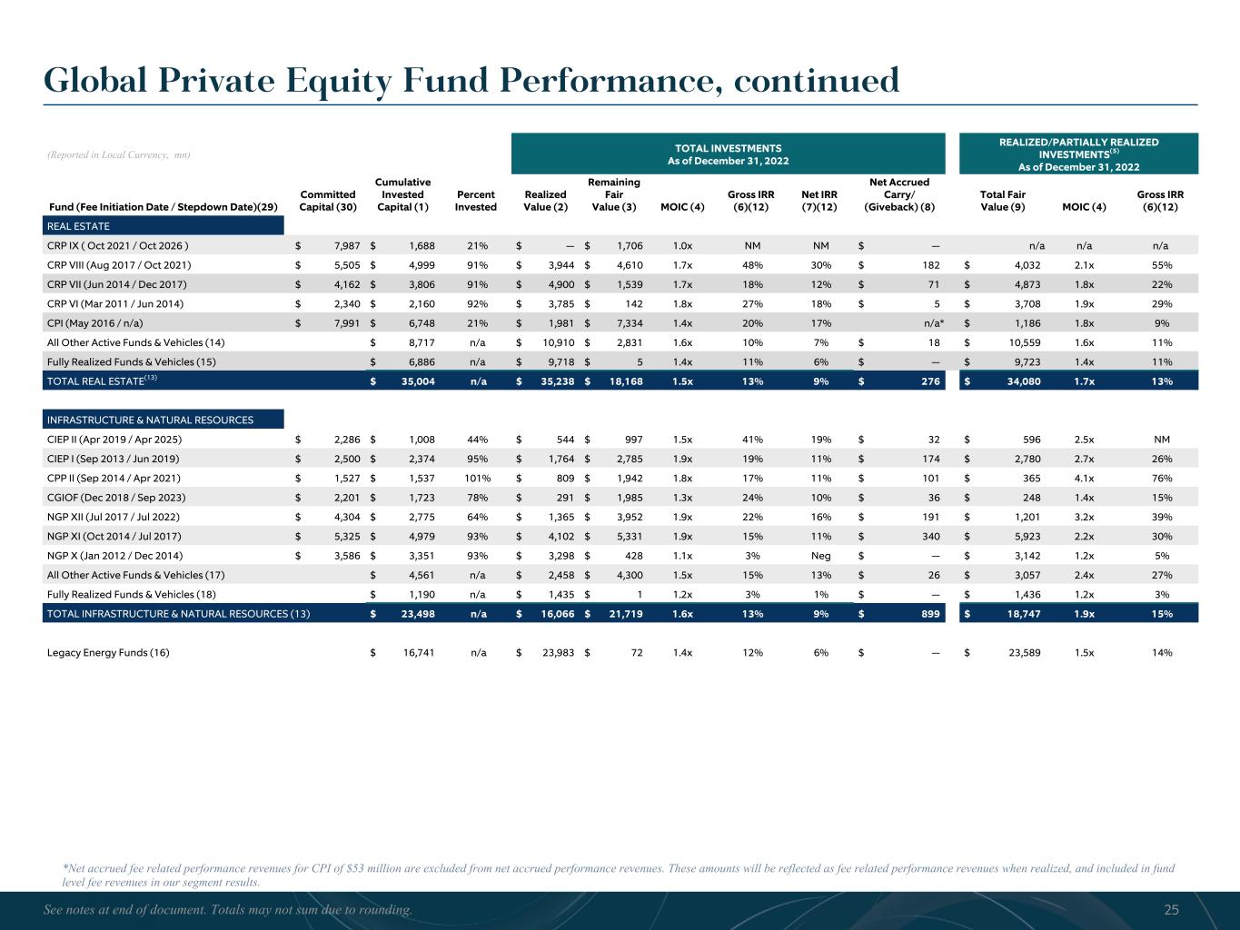 R-14 7 G-19 5 B-19 7 R-88 G-15 9 B-16 5 R-13 6 G-18 0 B-83 R-16 3 G-14 3 B-18 7 R-0 G-74 B-13 6 R-18 5 G-21 1 B-15 3 R-11 8 G-92 B-15 0 R-22 0 G-22 1 B-23 2 R-14 0 G-14 1 B-15 2R-12 0 G-16 9 B-22 2 Old Colors R-88 G-89 B-91 58595B R-23 G-234 B-234 EAEAEA R-208 G-232 B-247 D0E8F7 R-65 G-64 B-66 414042 R-8 G-51 B-94 08335E R-167 G-169 B-171 A7A9AB R-9 G-102 B-112 096670 R-220 G-221 B-222 DCDDDE R-97 G-161 B-224 61A1E0 R-237 G-217 B-157 EDD99D R-147 G-195 B-197 93C3C5 Global Private Equity Fund Performance, continued (Reported in Local Currency, mn) TOTAL INVESTMENTS As of December 31, 2022 REALIZED/PARTIALLY REALIZED INVESTMENTS(5) As of December 31, 2022 Fund (Fee Initiation Date / Stepdown Date)(29) Committed Capital (30) Cumulative Invested Capital (1) Percent Invested Realized Value (2) Remaining Fair Value (3) MOIC (4) Gross IRR (6)(12) Net IRR (7)(12) Net Accrued Carry/ (Giveback) (8) Total Fair Value (9) MOIC (4) Gross IRR (6)(12) REAL ESTATE CRP IX ( Oct 2021 / Oct 2026 ) $ 7,987 $ 1,688 21% $ — $ 1,706 1.0x NM NM $ — n/a n/a n/a CRP VIII (Aug 2017 / Oct 2021) $ 5,505 $ 4,999 91% $ 3,944 $ 4,610 1.7x 48% 30% $ 182 $ 4,032 2.1x 55% CRP VII (Jun 2014 / Dec 2017) $ 4,162 $ 3,806 91% $ 4,900 $ 1,539 1.7x 18% 12% $ 71 $ 4,873 1.8x 22% CRP VI (Mar 2011 / Jun 2014) $ 2,340 $ 2,160 92% $ 3,785 $ 142 1.8x 27% 18% $ 5 $ 3,708 1.9x 29% CPI (May 2016 / n/a) $ 7,991 $ 6,748 21% $ 1,981 $ 7,334 1.4x 20% 17% n/a* $ 1,186 1.8x 9% All Other Active Funds & Vehicles (14) $ 8,717 n/a $ 10,910 $ 2,831 1.6x 10% 7% $ 18 $ 10,559 1.6x 11% Fully Realized Funds & Vehicles (15) $ 6,886 n/a $ 9,718 $ 5 1.4x 11% 6% $ — $ 9,723 1.4x 11% TOTAL REAL ESTATE(13) $ 35,004 n/a $ 35,238 $ 18,168 1.5x 13% 9% $ 276 $ 34,080 1.7x 13% INFRASTRUCTURE & NATURAL RESOURCES CIEP II (Apr 2019 / Apr 2025) $ 2,286 $ 1,008 44% $ 544 $ 997 1.5x 41% 19% $ 32 $ 596 2.5x NM CIEP I (Sep 2013 / Jun 2019) $ 2,500 $ 2,374 95% $ 1,764 $ 2,785 1.9x 19% 11% $ 174 $ 2,780 2.7x 26% CPP II (Sep 2014 / Apr 2021) $ 1,527 $ 1,537 101% $ 809 $ 1,942 1.8x 17% 11% $ 101 $ 365 4.1x 76% CGIOF (Dec 2018 / Sep 2023) $ 2,201 $ 1,723 78% $ 291 $ 1,985 1.3x 24% 10% $ 36 $ 248 1.4x 15% NGP XII (Jul 2017 / Jul 2022) $ 4,304 $ 2,775 64% $ 1,365 $ 3,952 1.9x 22% 16% $ 191 $ 1,201 3.2x 39% NGP XI (Oct 2014 / Jul 2017) $ 5,325 $ 4,979 93% $ 4,102 $ 5,331 1.9x 15% 11% $ 340 $ 5,923 2.2x 30% NGP X (Jan 2012 / Dec 2014) $ 3,586 $ 3,351 93% $ 3,298 $ 428 1.1x 3% Neg $ — $ 3,142 1.2x 5% All Other Active Funds & Vehicles (17) $ 4,561 n/a $ 2,458 $ 4,300 1.5x 15% 13% $ 26 $ 3,057 2.4x 27% Fully Realized Funds & Vehicles (18) $ 1,190 n/a $ 1,435 $ 1 1.2x 3% 1% $ — $ 1,436 1.2x 3% TOTAL INFRASTRUCTURE & NATURAL RESOURCES (13) $ 23,498 n/a $ 16,066 $ 21,719 1.6x 13% 9% $ 899 $ 18,747 1.9x 15% Legacy Energy Funds (16) $ 16,741 n/a $ 23,983 $ 72 1.4x 12% 6% $ — $ 23,589 1.5x 14% 25See notes at end of document. Totals may not sum due to rounding. *Net accrued fee related performance revenues for CPI of $53 million are excluded from net accrued performance revenues. These amounts will be reflected as fee related performance revenues when realized, and included in fund level fee revenues in our segment results.