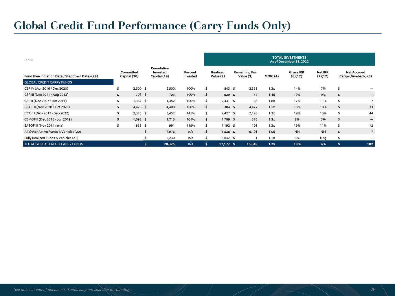 R-14 7 G-19 5 B-19 7 R-88 G-15 9 B-16 5 R-13 6 G-18 0 B-83 R-16 3 G-14 3 B-18 7 R-0 G-74 B-13 6 R-18 5 G-21 1 B-15 3 R-11 8 G-92 B-15 0 R-22 0 G-22 1 B-23 2 R-14 0 G-14 1 B-15 2R-12 0 G-16 9 B-22 2 Old Colors R-88 G-89 B-91 58595B R-23 G-234 B-234 EAEAEA R-208 G-232 B-247 D0E8F7 R-65 G-64 B-66 414042 R-8 G-51 B-94 08335E R-167 G-169 B-171 A7A9AB R-9 G-102 B-112 096670 R-220 G-221 B-222 DCDDDE R-97 G-161 B-224 61A1E0 R-237 G-217 B-157 EDD99D R-147 G-195 B-197 93C3C5 Global Credit Fund Performance (Carry Funds Only) 26 ($ mn) TOTAL INVESTMENTS As of December 31, 2022 Fund (Fee Initiation Date / Stepdown Date) (29) Committed Capital (30) Cumulative Invested Capital (19) Percent Invested Realized Value (2) Remaining Fair Value (3) MOIC (4) Gross IRR (6)(12) Net IRR (7)(12) Net Accrued Carry/(Giveback) (8) GLOBAL CREDIT CARRY FUNDS CSP IV (Apr 2016 / Dec 2020) $ 2,500 $ 2,500 100% $ 843 $ 2,351 1.3x 14% 7% $ — CSP III (Dec 2011 / Aug 2015) $ 703 $ 703 100% $ 929 $ 57 1.4x 19% 9% $ — CSP II (Dec 2007 / Jun 2011) $ 1,352 $ 1,352 100% $ 2,431 $ 66 1.8x 17% 11% $ 7 CCOF II (Nov 2020 / Oct 2025) $ 4,425 $ 4,408 100% $ 384 $ 4,477 1.1x 15% 10% $ 33 CCOF I (Nov 2017 / Sep 2022) $ 2,373 $ 3,452 145% $ 2,427 $ 2,120 1.3x 19% 13% $ 44 CEMOF II (Dec 2015 / Jun 2019) $ 1,692 $ 1,713 101% $ 1,789 $ 376 1.3x 8% 3% $ — SASOF III (Nov 2014 / n/a) $ 833 $ 991 119% $ 1,192 $ 101 1.3x 19% 11% $ 12 All Other Active Funds & Vehicles (20) $ 7,976 n/a $ 1,536 $ 6,101 1.0x NM NM $ 7 Fully Realized Funds & Vehicles (21) $ 5,230 n/a $ 5,642 $ 1 1.1x 3% Neg $ — TOTAL GLOBAL CREDIT CARRY FUNDS $ 28,325 n/a $ 17,172 $ 15,649 1.2x 10% 4% $ 102 See notes at end of document. Totals may not sum due to rounding.
