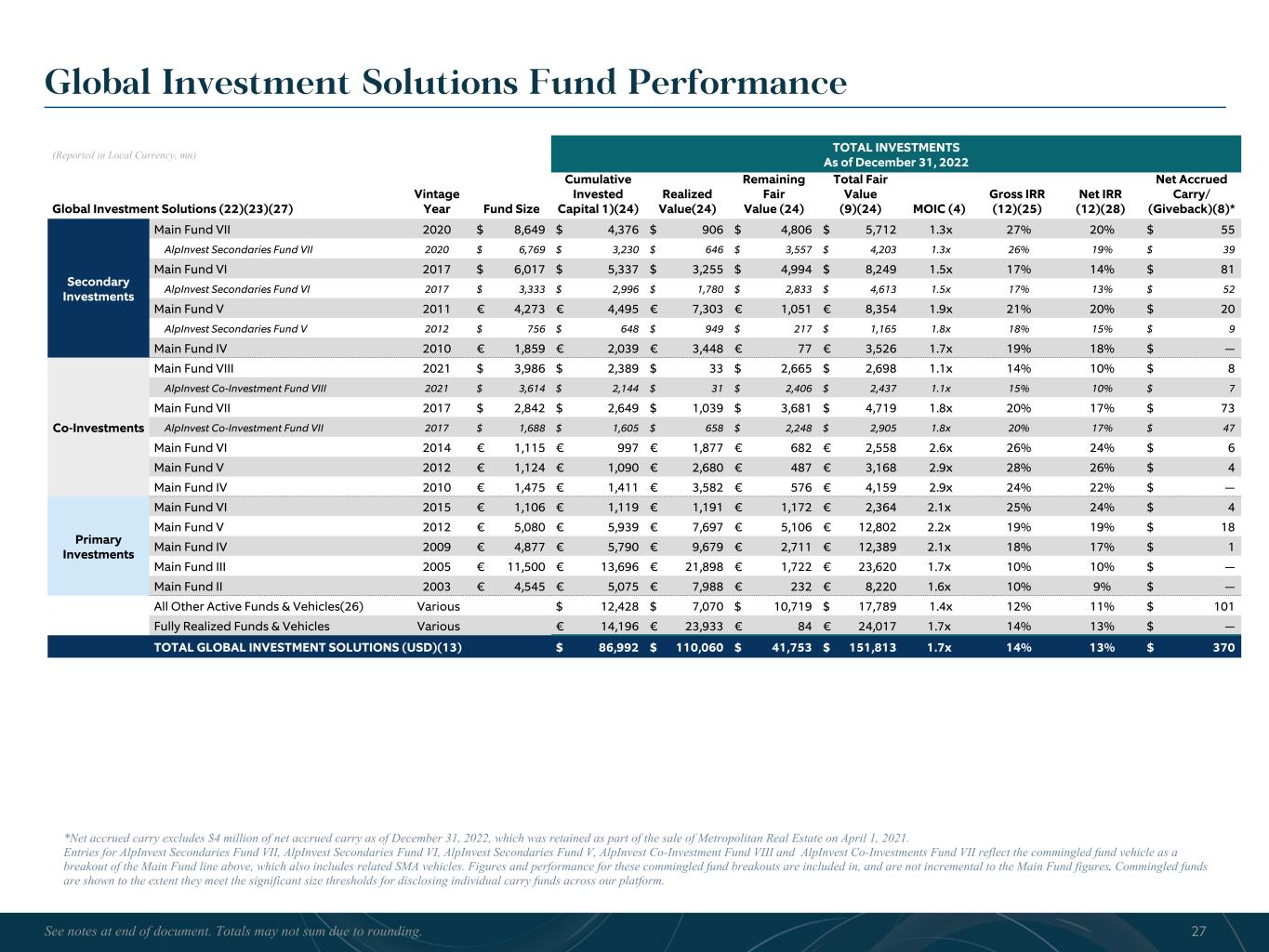 R-14 7 G-19 5 B-19 7 R-88 G-15 9 B-16 5 R-13 6 G-18 0 B-83 R-16 3 G-14 3 B-18 7 R-0 G-74 B-13 6 R-18 5 G-21 1 B-15 3 R-11 8 G-92 B-15 0 R-22 0 G-22 1 B-23 2 R-14 0 G-14 1 B-15 2R-12 0 G-16 9 B-22 2 Old Colors R-88 G-89 B-91 58595B R-23 G-234 B-234 EAEAEA R-208 G-232 B-247 D0E8F7 R-65 G-64 B-66 414042 R-8 G-51 B-94 08335E R-167 G-169 B-171 A7A9AB R-9 G-102 B-112 096670 R-220 G-221 B-222 DCDDDE R-97 G-161 B-224 61A1E0 R-237 G-217 B-157 EDD99D R-147 G-195 B-197 93C3C5 Global Investment Solutions Fund Performance (Reported in Local Currency, mn) TOTAL INVESTMENTS As of December 31, 2022 Global Investment Solutions (22)(23)(27) Vintage Year Fund Size Cumulative Invested Capital 1)(24) Realized Value(24) Remaining Fair Value (24) Total Fair Value (9)(24) MOIC (4) Gross IRR (12)(25) Net IRR (12)(28) Net Accrued Carry/ (Giveback)(8)* Secondary Investments Main Fund VII 2020 $ 8,649 $ 4,376 $ 906 $ 4,806 $ 5,712 1.3x 27% 20% $ 55 AlpInvest Secondaries Fund VII 2020 $ 6,769 $ 3,230 $ 646 $ 3,557 $ 4,203 1.3x 26% 19% $ 39 Main Fund VI 2017 $ 6,017 $ 5,337 $ 3,255 $ 4,994 $ 8,249 1.5x 17% 14% $ 81 AlpInvest Secondaries Fund VI 2017 $ 3,333 $ 2,996 $ 1,780 $ 2,833 $ 4,613 1.5x 17% 13% $ 52 Main Fund V 2011 € 4,273 € 4,495 € 7,303 € 1,051 € 8,354 1.9x 21% 20% $ 20 AlpInvest Secondaries Fund V 2012 $ 756 $ 648 $ 949 $ 217 $ 1,165 1.8x 18% 15% $ 9 Main Fund IV 2010 € 1,859 € 2,039 € 3,448 € 77 € 3,526 1.7x 19% 18% $ — Co-Investments Main Fund VIII 2021 $ 3,986 $ 2,389 $ 33 $ 2,665 $ 2,698 1.1x 14% 10% $ 8 AlpInvest Co-Investment Fund VIII 2021 $ 3,614 $ 2,144 $ 31 $ 2,406 $ 2,437 1.1x 15% 10% $ 7 Main Fund VII 2017 $ 2,842 $ 2,649 $ 1,039 $ 3,681 $ 4,719 1.8x 20% 17% $ 73 AlpInvest Co-Investment Fund VII 2017 $ 1,688 $ 1,605 $ 658 $ 2,248 $ 2,905 1.8x 20% 17% $ 47 Main Fund VI 2014 € 1,115 € 997 € 1,877 € 682 € 2,558 2.6x 26% 24% $ 6 Main Fund V 2012 € 1,124 € 1,090 € 2,680 € 487 € 3,168 2.9x 28% 26% $ 4 Main Fund IV 2010 € 1,475 € 1,411 € 3,582 € 576 € 4,159 2.9x 24% 22% $ — Primary Investments Main Fund VI 2015 € 1,106 € 1,119 € 1,191 € 1,172 € 2,364 2.1x 25% 24% $ 4 Main Fund V 2012 € 5,080 € 5,939 € 7,697 € 5,106 € 12,802 2.2x 19% 19% $ 18 Main Fund IV 2009 € 4,877 € 5,790 € 9,679 € 2,711 € 12,389 2.1x 18% 17% $ 1 Main Fund III 2005 € 11,500 € 13,696 € 21,898 € 1,722 € 23,620 1.7x 10% 10% $ — Main Fund II 2003 € 4,545 € 5,075 € 7,988 € 232 € 8,220 1.6x 10% 9% $ — All Other Active Funds & Vehicles(26) Various $ 12,428 $ 7,070 $ 10,719 $ 17,789 1.4x 12% 11% $ 101 Fully Realized Funds & Vehicles Various € 14,196 € 23,933 € 84 € 24,017 1.7x 14% 13% $ — TOTAL GLOBAL INVESTMENT SOLUTIONS (USD)(13) $ 86,992 $ 110,060 $ 41,753 $ 151,813 1.7x 14% 13% $ 370 27See notes at end of document. Totals may not sum due to rounding. *Net accrued carry excludes $4 million of net accrued carry as of December 31, 2022, which was retained as part of the sale of Metropolitan Real Estate on April 1, 2021. Entries for AlpInvest Secondaries Fund VII, AlpInvest Secondaries Fund VI, AlpInvest Secondaries Fund V, AlpInvest Co-Investment Fund VIII and AlpInvest Co-Investments Fund VII reflect the commingled fund vehicle as a breakout of the Main Fund line above, which also includes related SMA vehicles. Figures and performance for these commingled fund breakouts are included in, and are not incremental to the Main Fund figures. Commingled funds are shown to the extent they meet the significant size thresholds for disclosing individual carry funds across our platform.