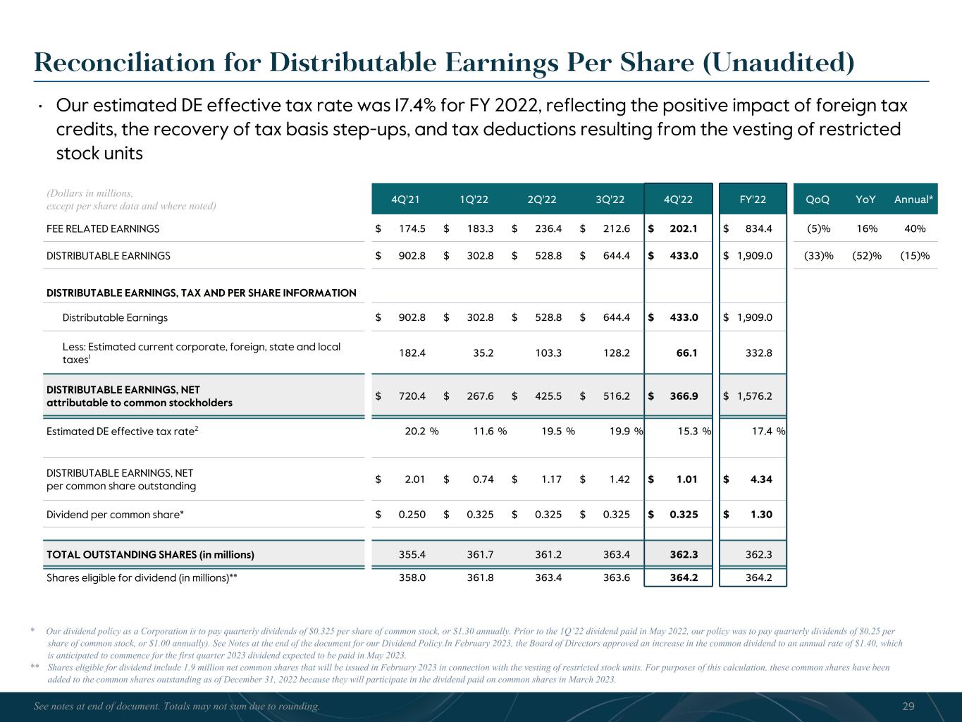 R-14 7 G-19 5 B-19 7 R-88 G-15 9 B-16 5 R-13 6 G-18 0 B-83 R-16 3 G-14 3 B-18 7 R-0 G-74 B-13 6 R-18 5 G-21 1 B-15 3 R-11 8 G-92 B-15 0 R-22 0 G-22 1 B-23 2 R-14 0 G-14 1 B-15 2R-12 0 G-16 9 B-22 2 Old Colors R-88 G-89 B-91 58595B R-23 G-234 B-234 EAEAEA R-208 G-232 B-247 D0E8F7 R-65 G-64 B-66 414042 R-8 G-51 B-94 08335E R-167 G-169 B-171 A7A9AB R-9 G-102 B-112 096670 R-220 G-221 B-222 DCDDDE R-97 G-161 B-224 61A1E0 R-237 G-217 B-157 EDD99D R-147 G-195 B-197 93C3C5 Reconciliation for Distributable Earnings Per Share (Unaudited) * Our dividend policy as a Corporation is to pay quarterly dividends of $0.325 per share of common stock, or $1.30 annually. Prior to the 1Q’22 dividend paid in May 2022, our policy was to pay quarterly dividends of $0.25 per share of common stock, or $1.00 annually). See Notes at the end of the document for our Dividend Policy.In February 2023, the Board of Directors approved an increase in the common dividend to an annual rate of $1.40, which is anticipated to commence for the first quarter 2023 dividend expected to be paid in May 2023. ** Shares eligible for dividend include 1.9 million net common shares that will be issued in February 2023 in connection with the vesting of restricted stock units. For purposes of this calculation, these common shares have been added to the common shares outstanding as of December 31, 2022 because they will participate in the dividend paid on common shares in March 2023. (Dollars in millions, except per share data and where noted) 4Q'21 1Q'22 2Q'22 3Q'22 4Q'22 FY'22 QoQ YoY Annual* FEE RELATED EARNINGS $ 174.5 $ 183.3 $ 236.4 $ 212.6 $ 202.1 $ 834.4 (5)% 16% 40% DISTRIBUTABLE EARNINGS $ 902.8 $ 302.8 $ 528.8 $ 644.4 $ 433.0 $ 1,909.0 (33)% (52)% (15)% DISTRIBUTABLE EARNINGS, TAX AND PER SHARE INFORMATION Distributable Earnings $ 902.8 $ 302.8 $ 528.8 $ 644.4 $ 433.0 $ 1,909.0 Less: Estimated current corporate, foreign, state and local taxes1 182.4 35.2 103.3 128.2 66.1 332.8 DISTRIBUTABLE EARNINGS, NET attributable to common stockholders $ 720.4 $ 267.6 $ 425.5 $ 516.2 $ 366.9 $ 1,576.2 Estimated DE effective tax rate2 20.2 % 11.6 % 19.5 % 19.9 % 15.3 % 17.4 % DISTRIBUTABLE EARNINGS, NET per common share outstanding $ 2.01 $ 0.74 $ 1.17 $ 1.42 $ 1.01 $ 4.34 Dividend per common share* $ 0.250 $ 0.325 $ 0.325 $ 0.325 $ 0.325 $ 1.30 TOTAL OUTSTANDING SHARES (in millions) 355.4 361.7 361.2 363.4 362.3 362.3 Shares eligible for dividend (in millions)** 358.0 361.8 363.4 363.6 364.2 364.2 29See notes at end of document. Totals may not sum due to rounding. • Our estimated DE effective tax rate was 17.4% for FY 2022, reflecting the positive impact of foreign tax credits, the recovery of tax basis step-ups, and tax deductions resulting from the vesting of restricted stock units