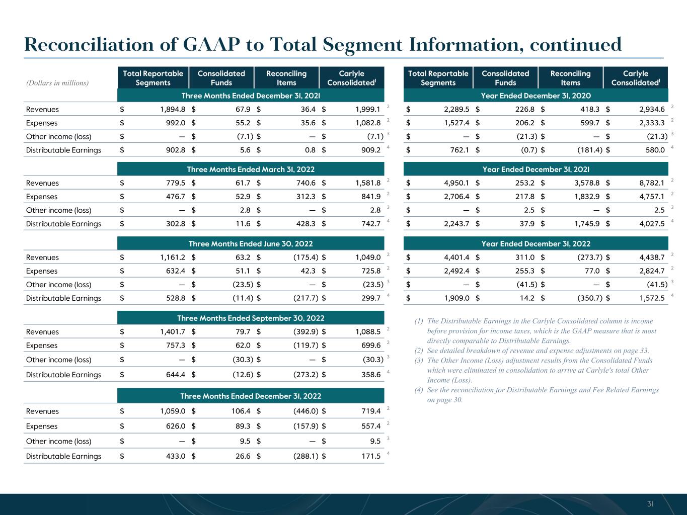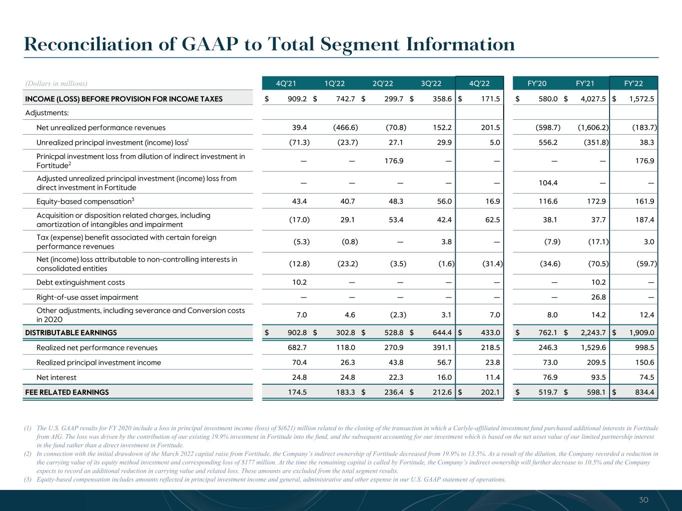 R-14 7 G-19 5 B-19 7 R-88 G-15 9 B-16 5 R-13 6 G-18 0 B-83 R-16 3 G-14 3 B-18 7 R-0 G-74 B-13 6 R-18 5 G-21 1 B-15 3 R-11 8 G-92 B-15 0 R-22 0 G-22 1 B-23 2 R-14 0 G-14 1 B-15 2R-12 0 G-16 9 B-22 2 Old Colors R-88 G-89 B-91 58595B R-23 G-234 B-234 EAEAEA R-208 G-232 B-247 D0E8F7 R-65 G-64 B-66 414042 R-8 G-51 B-94 08335E R-167 G-169 B-171 A7A9AB R-9 G-102 B-112 096670 R-220 G-221 B-222 DCDDDE R-97 G-161 B-224 61A1E0 R-237 G-217 B-157 EDD99D R-147 G-195 B-197 93C3C5 Reconciliation of GAAP to Total Segment Information (1) The U.S. GAAP results for FY 2020 include a loss in principal investment income (loss) of $(621) million related to the closing of the transaction in which a Carlyle-affiliated investment fund purchased additional interests in Fortitude from AIG. The loss was driven by the contribution of our existing 19.9% investment in Fortitude into the fund, and the subsequent accounting for our investment which is based on the net asset value of our limited partnership interest in the fund rather than a direct investment in Fortitude. (2) In connection with the initial drawdown of the March 2022 capital raise from Fortitude, the Company’s indirect ownership of Fortitude decreased from 19.9% to 13.5%. As a result of the dilution, the Company recorded a reduction in the carrying value of its equity method investment and corresponding loss of $177 million. At the time the remaining capital is called by Fortitude, the Company’s indirect ownership will further decrease to 10.5% and the Company expects to record an additional reduction in carrying value and related loss. These amounts are excluded from the total segment results. (3) Equity-based compensation includes amounts reflected in principal investment income and general, administrative and other expense in our U.S. GAAP statement of operations. (Dollars in millions) 4Q'21 1Q'22 2Q'22 3Q'22 4Q'22 FY'20 FY'21 FY'22 INCOME (LOSS) BEFORE PROVISION FOR INCOME TAXES $ 909.2 $ 742.7 $ 299.7 $ 358.6 $ 171.5 $ 580.0 $ 4,027.5 $ 1,572.5 Adjustments: Net unrealized performance revenues 39.4 (466.6) (70.8) 152.2 201.5 (598.7) (1,606.2) (183.7) Unrealized principal investment (income) loss1 (71.3) (23.7) 27.1 29.9 5.0 556.2 (351.8) 38.3 Prinicpal investment loss from dilution of indirect investment in Fortitude2 — — 176.9 — — — — 176.9 Adjusted unrealized principal investment (income) loss from direct investment in Fortitude — — — — — 104.4 — — Equity-based compensation3 43.4 40.7 48.3 56.0 16.9 116.6 172.9 161.9 Acquisition or disposition related charges, including amortization of intangibles and impairment (17.0) 29.1 53.4 42.4 62.5 38.1 37.7 187.4 Tax (expense) benefit associated with certain foreign performance revenues (5.3) (0.8) — 3.8 — (7.9) (17.1) 3.0 Net (income) loss attributable to non-controlling interests in consolidated entities (12.8) (23.2) (3.5) (1.6) (31.4) (34.6) (70.5) (59.7) Debt extinguishment costs 10.2 — — — — — 10.2 — Right-of-use asset impairment — — — — — — 26.8 — Other adjustments, including severance and Conversion costs in 2020 7.0 4.6 (2.3) 3.1 7.0 8.0 14.2 12.4 DISTRIBUTABLE EARNINGS $ 902.8 $ 302.8 $ 528.8 $ 644.4 $ 433.0 $ 762.1 $ 2,243.7 $ 1,909.0 Realized net performance revenues 682.7 118.0 270.9 391.1 218.5 246.3 1,529.6 998.5 Realized principal investment income 70.4 26.3 43.8 56.7 23.8 73.0 209.5 150.6 Net interest 24.8 24.8 22.3 16.0 11.4 76.9 93.5 74.5 FEE RELATED EARNINGS 174.5 183.3 $ 236.4 $ 212.6 $ 202.1 $ 519.7 $ 598.1 $ 834.4 30