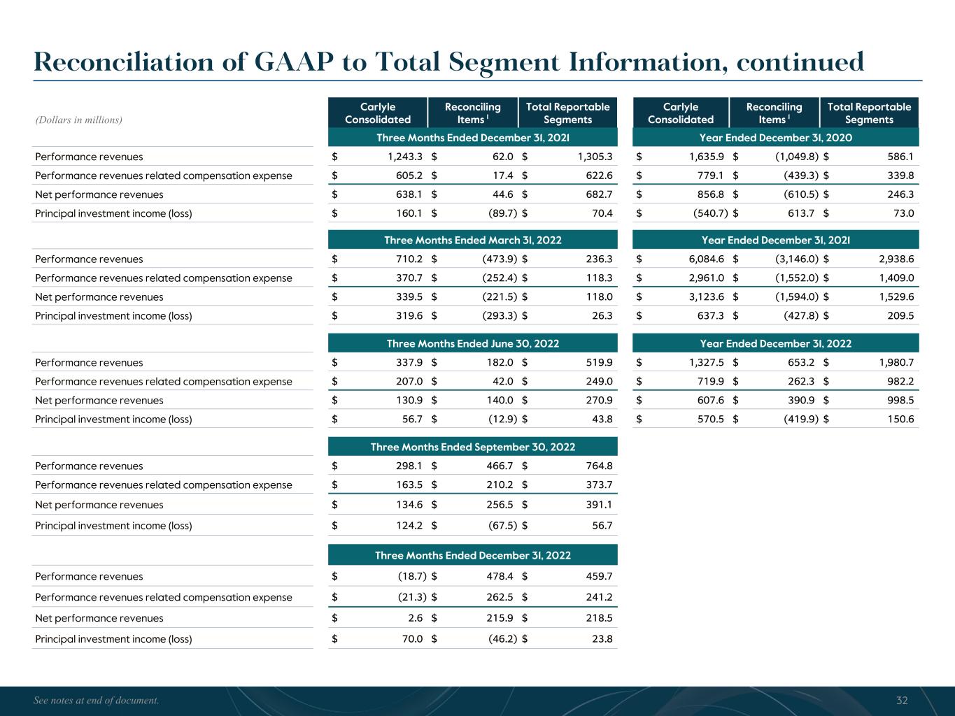 R-14 7 G-19 5 B-19 7 R-88 G-15 9 B-16 5 R-13 6 G-18 0 B-83 R-16 3 G-14 3 B-18 7 R-0 G-74 B-13 6 R-18 5 G-21 1 B-15 3 R-11 8 G-92 B-15 0 R-22 0 G-22 1 B-23 2 R-14 0 G-14 1 B-15 2R-12 0 G-16 9 B-22 2 Old Colors R-88 G-89 B-91 58595B R-23 G-234 B-234 EAEAEA R-208 G-232 B-247 D0E8F7 R-65 G-64 B-66 414042 R-8 G-51 B-94 08335E R-167 G-169 B-171 A7A9AB R-9 G-102 B-112 096670 R-220 G-221 B-222 DCDDDE R-97 G-161 B-224 61A1E0 R-237 G-217 B-157 EDD99D R-147 G-195 B-197 93C3C5 Reconciliation of GAAP to Total Segment Information, continued (Dollars in millions) Total Reportable Segments Consolidated Funds Reconciling Items Carlyle Consolidated1 Total Reportable Segments Consolidated Funds Reconciling Items Carlyle Consolidated1 Three Months Ended December 31, 2021 Year Ended December 31, 2020 Revenues $ 1,894.8 $ 67.9 $ 36.4 $ 1,999.1 2 $ 2,289.5 $ 226.8 $ 418.3 $ 2,934.6 2 Expenses $ 992.0 $ 55.2 $ 35.6 $ 1,082.8 2 $ 1,527.4 $ 206.2 $ 599.7 $ 2,333.3 2 Other income (loss) $ — $ (7.1) $ — $ (7.1) 3 $ — $ (21.3) $ — $ (21.3) 3 Distributable Earnings $ 902.8 $ 5.6 $ 0.8 $ 909.2 4 $ 762.1 $ (0.7) $ (181.4) $ 580.0 4 Three Months Ended March 31, 2022 Year Ended December 31, 2021 Revenues $ 779.5 $ 61.7 $ 740.6 $ 1,581.8 2 $ 4,950.1 $ 253.2 $ 3,578.8 $ 8,782.1 2 Expenses $ 476.7 $ 52.9 $ 312.3 $ 841.9 2 $ 2,706.4 $ 217.8 $ 1,832.9 $ 4,757.1 2 Other income (loss) $ — $ 2.8 $ — $ 2.8 3 $ — $ 2.5 $ — $ 2.5 3 Distributable Earnings $ 302.8 $ 11.6 $ 428.3 $ 742.7 4 $ 2,243.7 $ 37.9 $ 1,745.9 $ 4,027.5 4 Three Months Ended June 30, 2022 Year Ended December 31, 2022 Revenues $ 1,161.2 $ 63.2 $ (175.4) $ 1,049.0 2 $ 4,401.4 $ 311.0 $ (273.7) $ 4,438.7 2 Expenses $ 632.4 $ 51.1 $ 42.3 $ 725.8 2 $ 2,492.4 $ 255.3 $ 77.0 $ 2,824.7 2 Other income (loss) $ — $ (23.5) $ — $ (23.5) 3 $ — $ (41.5) $ — $ (41.5) 3 Distributable Earnings $ 528.8 $ (11.4) $ (217.7) $ 299.7 4 $ 1,909.0 $ 14.2 $ (350.7) $ 1,572.5 4 Three Months Ended September 30, 2022 Revenues $ 1,401.7 $ 79.7 $ (392.9) $ 1,088.5 2 Expenses $ 757.3 $ 62.0 $ (119.7) $ 699.6 2 Other income (loss) $ — $ (30.3) $ — $ (30.3) 3 Distributable Earnings $ 644.4 $ (12.6) $ (273.2) $ 358.6 4 Three Months Ended December 31, 2022 Revenues $ 1,059.0 $ 106.4 $ (446.0) $ 719.4 2 Expenses $ 626.0 $ 89.3 $ (157.9) $ 557.4 2 Other income (loss) $ — $ 9.5 $ — $ 9.5 3 Distributable Earnings $ 433.0 $ 26.6 $ (288.1) $ 171.5 4 (1) The Distributable Earnings in the Carlyle Consolidated column is income before provision for income taxes, which is the GAAP measure that is most directly comparable to Distributable Earnings. (2) See detailed breakdown of revenue and expense adjustments on page 33. (3) The Other Income (Loss) adjustment results from the Consolidated Funds which were eliminated in consolidation to arrive at Carlyle's total Other Income (Loss). (4) See the reconciliation for Distributable Earnings and Fee Related Earnings on page 30. 31