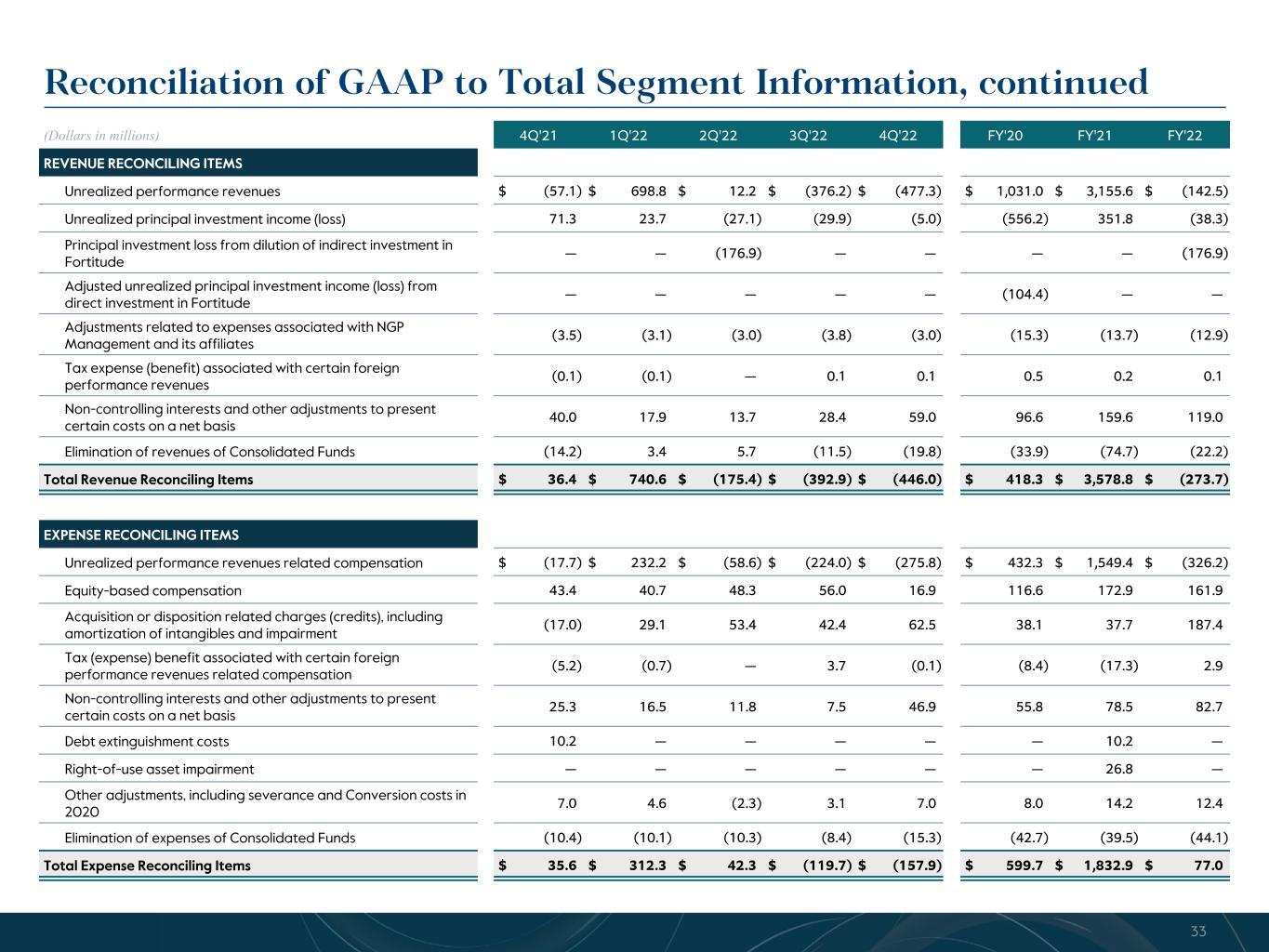 R-14 7 G-19 5 B-19 7 R-88 G-15 9 B-16 5 R-13 6 G-18 0 B-83 R-16 3 G-14 3 B-18 7 R-0 G-74 B-13 6 R-18 5 G-21 1 B-15 3 R-11 8 G-92 B-15 0 R-22 0 G-22 1 B-23 2 R-14 0 G-14 1 B-15 2R-12 0 G-16 9 B-22 2 Old Colors R-88 G-89 B-91 58595B R-23 G-234 B-234 EAEAEA R-208 G-232 B-247 D0E8F7 R-65 G-64 B-66 414042 R-8 G-51 B-94 08335E R-167 G-169 B-171 A7A9AB R-9 G-102 B-112 096670 R-220 G-221 B-222 DCDDDE R-97 G-161 B-224 61A1E0 R-237 G-217 B-157 EDD99D R-147 G-195 B-197 93C3C5 Reconciliation of GAAP to Total Segment Information, continued (Dollars in millions) 4Q'21 1Q'22 2Q'22 3Q'22 4Q'22 FY'20 FY'21 FY'22 REVENUE RECONCILING ITEMS Unrealized performance revenues $ (57.1) $ 698.8 $ 12.2 $ (376.2) $ (477.3) $ 1,031.0 $ 3,155.6 $ (142.5) Unrealized principal investment income (loss) 71.3 23.7 (27.1) (29.9) (5.0) (556.2) 351.8 (38.3) Principal investment loss from dilution of indirect investment in Fortitude — — (176.9) — — — — (176.9) Adjusted unrealized principal investment income (loss) from direct investment in Fortitude — — — — — (104.4) — — Adjustments related to expenses associated with NGP Management and its affiliates (3.5) (3.1) (3.0) (3.8) (3.0) (15.3) (13.7) (12.9) Tax expense (benefit) associated with certain foreign performance revenues (0.1) (0.1) — 0.1 0.1 0.5 0.2 0.1 Non-controlling interests and other adjustments to present certain costs on a net basis 40.0 17.9 13.7 28.4 59.0 96.6 159.6 119.0 Elimination of revenues of Consolidated Funds (14.2) 3.4 5.7 (11.5) (19.8) (33.9) (74.7) (22.2) Total Revenue Reconciling Items $ 36.4 $ 740.6 $ (175.4) $ (392.9) $ (446.0) $ 418.3 $ 3,578.8 $ (273.7) EXPENSE RECONCILING ITEMS Unrealized performance revenues related compensation $ (17.7) $ 232.2 $ (58.6) $ (224.0) $ (275.8) $ 432.3 $ 1,549.4 $ (326.2) Equity-based compensation 43.4 40.7 48.3 56.0 16.9 116.6 172.9 161.9 Acquisition or disposition related charges (credits), including amortization of intangibles and impairment (17.0) 29.1 53.4 42.4 62.5 38.1 37.7 187.4 Tax (expense) benefit associated with certain foreign performance revenues related compensation (5.2) (0.7) — 3.7 (0.1) (8.4) (17.3) 2.9 Non-controlling interests and other adjustments to present certain costs on a net basis 25.3 16.5 11.8 7.5 46.9 55.8 78.5 82.7 Debt extinguishment costs 10.2 — — — — — 10.2 — Right-of-use asset impairment — — — — — — 26.8 — Other adjustments, including severance and Conversion costs in 2020 7.0 4.6 (2.3) 3.1 7.0 8.0 14.2 12.4 Elimination of expenses of Consolidated Funds (10.4) (10.1) (10.3) (8.4) (15.3) (42.7) (39.5) (44.1) Total Expense Reconciling Items $ 35.6 $ 312.3 $ 42.3 $ (119.7) $ (157.9) $ 599.7 $ 1,832.9 $ 77.0 33