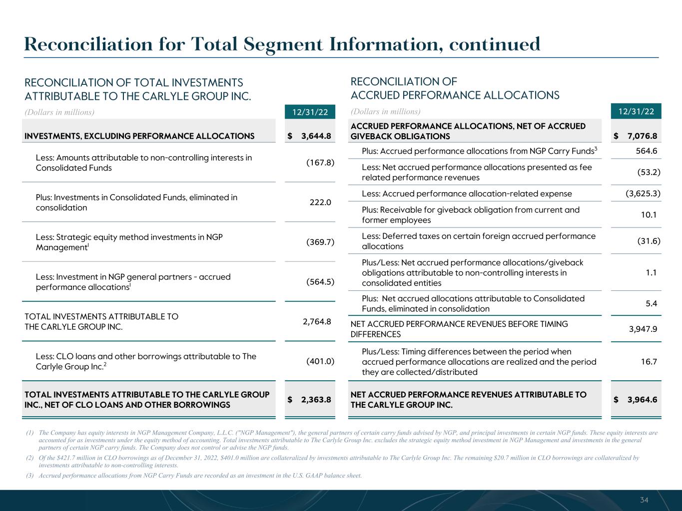 R-14 7 G-19 5 B-19 7 R-88 G-15 9 B-16 5 R-13 6 G-18 0 B-83 R-16 3 G-14 3 B-18 7 R-0 G-74 B-13 6 R-18 5 G-21 1 B-15 3 R-11 8 G-92 B-15 0 R-22 0 G-22 1 B-23 2 R-14 0 G-14 1 B-15 2R-12 0 G-16 9 B-22 2 Old Colors R-88 G-89 B-91 58595B R-23 G-234 B-234 EAEAEA R-208 G-232 B-247 D0E8F7 R-65 G-64 B-66 414042 R-8 G-51 B-94 08335E R-167 G-169 B-171 A7A9AB R-9 G-102 B-112 096670 R-220 G-221 B-222 DCDDDE R-97 G-161 B-224 61A1E0 R-237 G-217 B-157 EDD99D R-147 G-195 B-197 93C3C5 Reconciliation for Total Segment Information, continued (1) The Company has equity interests in NGP Management Company, L.L.C. ("NGP Management"), the general partners of certain carry funds advised by NGP, and principal investments in certain NGP funds. These equity interests are accounted for as investments under the equity method of accounting. Total investments attributable to The Carlyle Group Inc. excludes the strategic equity method investment in NGP Management and investments in the general partners of certain NGP carry funds. The Company does not control or advise the NGP funds. (2) Of the $421.7 million in CLO borrowings as of December 31, 2022, $401.0 million are collateralized by investments attributable to The Carlyle Group Inc. The remaining $20.7 million in CLO borrowings are collateralized by investments attributable to non-controlling interests. (3) Accrued performance allocations from NGP Carry Funds are recorded as an investment in the U.S. GAAP balance sheet. RECONCILIATION OF TOTAL INVESTMENTS ATTRIBUTABLE TO THE CARLYLE GROUP INC. (Dollars in millions) 12/31/22 INVESTMENTS, EXCLUDING PERFORMANCE ALLOCATIONS $ 3,644.8 Less: Amounts attributable to non-controlling interests in Consolidated Funds (167.8) Plus: Investments in Consolidated Funds, eliminated in consolidation 222.0 Less: Strategic equity method investments in NGP Management1 (369.7) Less: Investment in NGP general partners - accrued performance allocations1 (564.5) TOTAL INVESTMENTS ATTRIBUTABLE TO THE CARLYLE GROUP INC. 2,764.8 Less: CLO loans and other borrowings attributable to The Carlyle Group Inc.2 (401.0) TOTAL INVESTMENTS ATTRIBUTABLE TO THE CARLYLE GROUP INC., NET OF CLO LOANS AND OTHER BORROWINGS $ 2,363.8 RECONCILIATION OF ACCRUED PERFORMANCE ALLOCATIONS (Dollars in millions) 12/31/22 ACCRUED PERFORMANCE ALLOCATIONS, NET OF ACCRUED GIVEBACK OBLIGATIONS $ 7,076.8 Plus: Accrued performance allocations from NGP Carry Funds3 564.6 Less: Net accrued performance allocations presented as fee related performance revenues (53.2) Less: Accrued performance allocation-related expense (3,625.3) Plus: Receivable for giveback obligation from current and former employees 10.1 Less: Deferred taxes on certain foreign accrued performance allocations (31.6) Plus/Less: Net accrued performance allocations/giveback obligations attributable to non-controlling interests in consolidated entities 1.1 Plus: Net accrued allocations attributable to Consolidated Funds, eliminated in consolidation 5.4 NET ACCRUED PERFORMANCE REVENUES BEFORE TIMING DIFFERENCES 3,947.9 Plus/Less: Timing differences between the period when accrued performance allocations are realized and the period they are collected/distributed 16.7 NET ACCRUED PERFORMANCE REVENUES ATTRIBUTABLE TO THE CARLYLE GROUP INC. $ 3,964.6 34