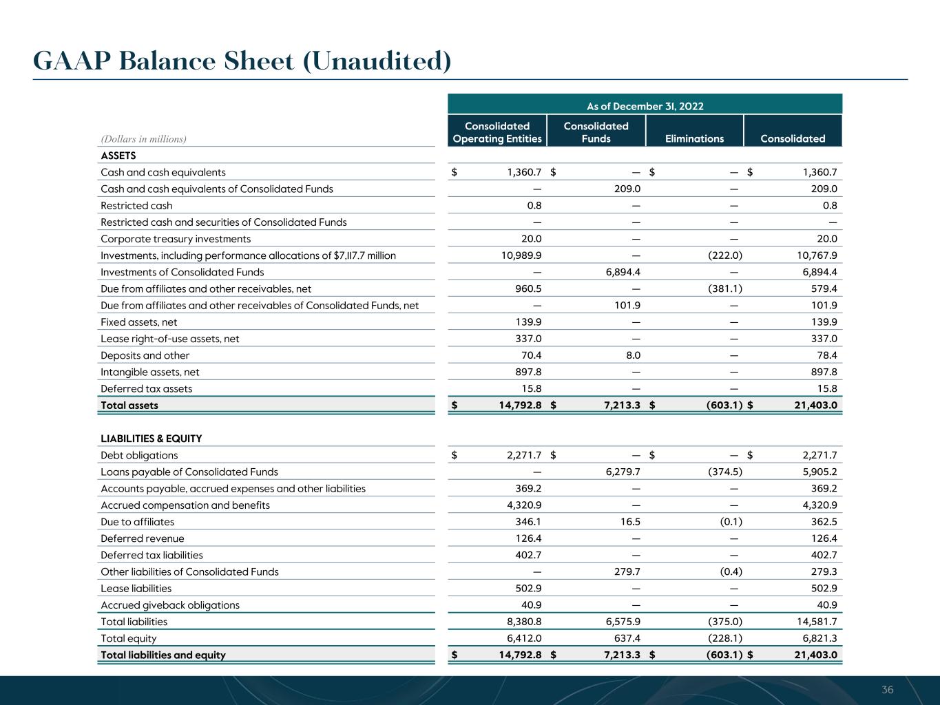 R-14 7 G-19 5 B-19 7 R-88 G-15 9 B-16 5 R-13 6 G-18 0 B-83 R-16 3 G-14 3 B-18 7 R-0 G-74 B-13 6 R-18 5 G-21 1 B-15 3 R-11 8 G-92 B-15 0 R-22 0 G-22 1 B-23 2 R-14 0 G-14 1 B-15 2R-12 0 G-16 9 B-22 2 Old Colors R-88 G-89 B-91 58595B R-23 G-234 B-234 EAEAEA R-208 G-232 B-247 D0E8F7 R-65 G-64 B-66 414042 R-8 G-51 B-94 08335E R-167 G-169 B-171 A7A9AB R-9 G-102 B-112 096670 R-220 G-221 B-222 DCDDDE R-97 G-161 B-224 61A1E0 R-237 G-217 B-157 EDD99D R-147 G-195 B-197 93C3C5 As of December 31, 2022 (Dollars in millions) Consolidated Operating Entities Consolidated Funds Eliminations Consolidated ASSETS Cash and cash equivalents $ 1,360.7 $ — $ — $ 1,360.7 Cash and cash equivalents of Consolidated Funds — 209.0 — 209.0 Restricted cash 0.8 — — 0.8 Restricted cash and securities of Consolidated Funds — — — — Corporate treasury investments 20.0 — — 20.0 Investments, including performance allocations of $7,117.7 million 10,989.9 — (222.0) 10,767.9 Investments of Consolidated Funds — 6,894.4 — 6,894.4 Due from affiliates and other receivables, net 960.5 — (381.1) 579.4 Due from affiliates and other receivables of Consolidated Funds, net — 101.9 — 101.9 Fixed assets, net 139.9 — — 139.9 Lease right-of-use assets, net 337.0 — — 337.0 Deposits and other 70.4 8.0 — 78.4 Intangible assets, net 897.8 — — 897.8 Deferred tax assets 15.8 — — 15.8 Total assets $ 14,792.8 $ 7,213.3 $ (603.1) $ 21,403.0 LIABILITIES & EQUITY Debt obligations $ 2,271.7 $ — $ — $ 2,271.7 Loans payable of Consolidated Funds — 6,279.7 (374.5) 5,905.2 Accounts payable, accrued expenses and other liabilities 369.2 — — 369.2 Accrued compensation and benefits 4,320.9 — — 4,320.9 Due to affiliates 346.1 16.5 (0.1) 362.5 Deferred revenue 126.4 — — 126.4 Deferred tax liabilities 402.7 — — 402.7 Other liabilities of Consolidated Funds — 279.7 (0.4) 279.3 Lease liabilities 502.9 — — 502.9 Accrued giveback obligations 40.9 — — 40.9 Total liabilities 8,380.8 6,575.9 (375.0) 14,581.7 Total equity 6,412.0 637.4 (228.1) 6,821.3 Total liabilities and equity $ 14,792.8 $ 7,213.3 $ (603.1) $ 21,403.0 GAAP Balance Sheet (Unaudited) 36