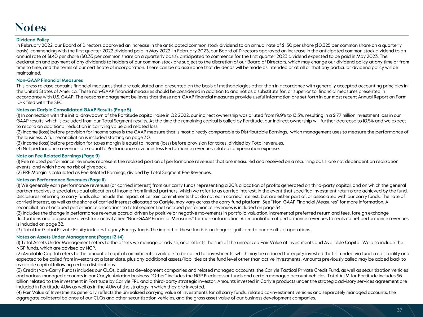 R-14 7 G-19 5 B-19 7 R-88 G-15 9 B-16 5 R-13 6 G-18 0 B-83 R-16 3 G-14 3 B-18 7 R-0 G-74 B-13 6 R-18 5 G-21 1 B-15 3 R-11 8 G-92 B-15 0 R-22 0 G-22 1 B-23 2 R-14 0 G-14 1 B-15 2R-12 0 G-16 9 B-22 2 Old Colors R-88 G-89 B-91 58595B R-23 G-234 B-234 EAEAEA R-208 G-232 B-247 D0E8F7 R-65 G-64 B-66 414042 R-8 G-51 B-94 08335E R-167 G-169 B-171 A7A9AB R-9 G-102 B-112 096670 R-220 G-221 B-222 DCDDDE R-97 G-161 B-224 61A1E0 R-237 G-217 B-157 EDD99D R-147 G-195 B-197 93C3C5 Notes Dividend Policy In February 2022, our Board of Directors approved an increase in the anticipated common stock dividend to an annual rate of $1.30 per share ($0.325 per common share on a quarterly basis), commencing with the first quarter 2022 dividend paid in May 2022. In February 2023, our Board of Directors approved an increase in the anticipated common stock dividend to an annual rate of $1.40 per share ($0.35 per common share on a quarterly basis), anticipated to commence for the first quarter 2023 dividend expected to be paid in May 2023. The declaration and payment of any dividends to holders of our common stock are subject to the discretion of our Board of Directors, which may change our dividend policy at any time or from time to time, and the terms of our certificate of incorporation. There can be no assurance that dividends will be made as intended or at all or that any particular dividend policy will be maintained. Non-GAAP Financial Measures This press release contains financial measures that are calculated and presented on the basis of methodologies other than in accordance with generally accepted accounting principles in the United States of America. These non-GAAP financial measures should be considered in addition to and not as a substitute for, or superior to, financial measures presented in accordance with U.S. GAAP. The reasons management believes that these non-GAAP financial measures provide useful information are set forth in our most recent Annual Report on Form 10-K filed with the SEC. Notes on Carlyle Consolidated GAAP Results (Page 5) (1) In connection with the initial drawdown of the Fortitude capital raise in Q2 2022, our indirect ownership was diluted from 19.9% to 13.5%, resulting in a $177 million investment loss in our GAAP results, which is excluded from our Total Segment results. At the time the remaining capital is called by Fortitude, our indirect ownership will further decrease to 10.5% and we expect to record an additional reduction in carrying value and related loss. (2) Income (loss) before provision for income taxes is the GAAP measure that is most directly comparable to Distributable Earnings, which management uses to measure the performance of the business. A full reconciliation is included starting on page 30. (3) Income (loss) before provision for taxes margin is equal to Income (loss) before provision for taxes, divided by Total revenues. (4) Net performance revenues are equal to Performance revenues less Performance revenues related compensation expense. Note on Fee Related Earnings (Page 9) (1) Fee related performance revenues represent the realized portion of performance revenues that are measured and received on a recurring basis, are not dependent on realization events, and which have no risk of giveback. (2) FRE Margin is calculated as Fee Related Earnings, divided by Total Segment Fee Revenues. Notes on Performance Revenues (Page 11) (1) We generally earn performance revenues (or carried interest) from our carry funds representing a 20% allocation of profits generated on third-party capital, and on which the general partner receives a special residual allocation of income from limited partners, which we refer to as carried interest, in the event that specified investment returns are achieved by the fund. Disclosures referring to carry funds also include the impact of certain commitments that do not earn carried interest, but are either part of, or associated with our carry funds. The rate of carried interest, as well as the share of carried interest allocated to Carlyle, may vary across the carry fund platform. See “Non-GAAP Financial Measures” for more information. A reconciliation of accrued performance allocations to total segment net accrued performance revenues is included on page 34. (2) Includes the change in performance revenue accrual driven by positive or negative movements in portfolio valuation, incremental preferred return and fees, foreign exchange fluctuations and acquisition/divestiture activity. See “Non-GAAP Financial Measures” for more information. A reconciliation of performance revenues to realized net performance revenues is included on page 32. (3) Total for Global Private Equity includes Legacy Energy funds.The impact of these funds is no longer significant to our results of operations. Notes on Assets Under Management (Pages 12-14) (1) Total Assets Under Management refers to the assets we manage or advise, and reflects the sum of the unrealized Fair Value of Investments and Available Capital. We also include the NGP funds, which are advised by NGP. (2) Available Capital refers to the amount of capital commitments available to be called for investments, which may be reduced for equity invested that is funded via fund credit facility and expected to be called from investors at a later date, plus any additional assets/liabilities at the fund level other than active investments. Amounts previously called may be added back to available capital following certain distributions. (3) Credit (Non-Carry Funds) includes our CLOs, business development companies and related managed accounts, the Carlyle Tactical Private Credit Fund, as well as securitization vehicles and various managed accounts in our Carlyle Aviation business. "Other" includes the NGP Predecessor funds and certain managed account vehicles. Total AUM for Fortitude includes $6 billion related to the investment in Fortitude by Carlyle FRL and a third-party strategic investor. Amounts 