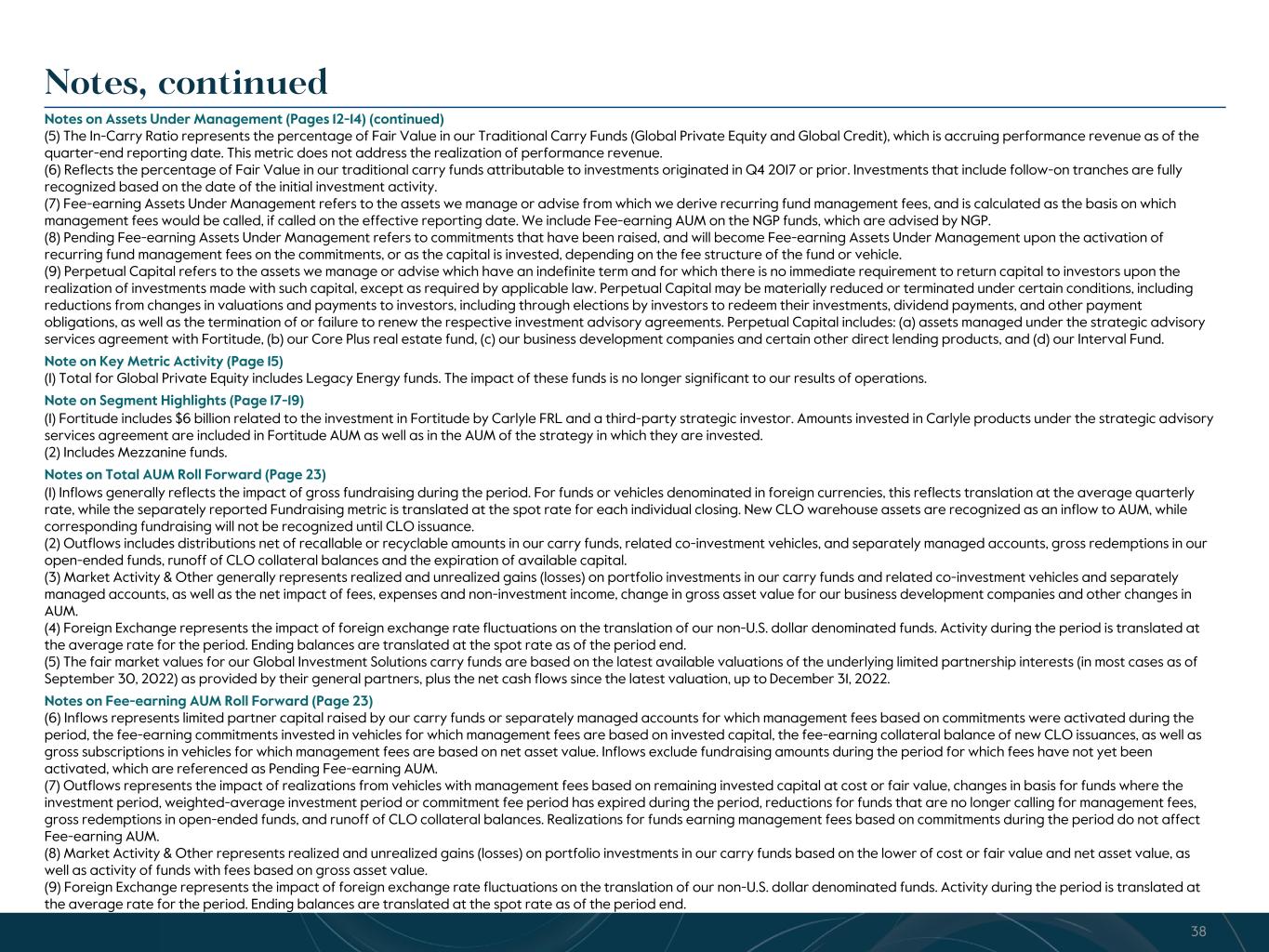 R-14 7 G-19 5 B-19 7 R-88 G-15 9 B-16 5 R-13 6 G-18 0 B-83 R-16 3 G-14 3 B-18 7 R-0 G-74 B-13 6 R-18 5 G-21 1 B-15 3 R-11 8 G-92 B-15 0 R-22 0 G-22 1 B-23 2 R-14 0 G-14 1 B-15 2R-12 0 G-16 9 B-22 2 Old Colors R-88 G-89 B-91 58595B R-23 G-234 B-234 EAEAEA R-208 G-232 B-247 D0E8F7 R-65 G-64 B-66 414042 R-8 G-51 B-94 08335E R-167 G-169 B-171 A7A9AB R-9 G-102 B-112 096670 R-220 G-221 B-222 DCDDDE R-97 G-161 B-224 61A1E0 R-237 G-217 B-157 EDD99D R-147 G-195 B-197 93C3C5 Notes, continued Notes on Assets Under Management (Pages 12-14) (continued) (5) The In-Carry Ratio represents the percentage of Fair Value in our Traditional Carry Funds (Global Private Equity and Global Credit), which is accruing performance revenue as of the quarter-end reporting date. This metric does not address the realization of performance revenue. (6) Reflects the percentage of Fair Value in our traditional carry funds attributable to investments originated in Q4 2017 or prior. Investments that include follow-on tranches are fully recognized based on the date of the initial investment activity. (7) Fee-earning Assets Under Management refers to the assets we manage or advise from which we derive recurring fund management fees, and is calculated as the basis on which management fees would be called, if called on the effective reporting date. We include Fee-earning AUM on the NGP funds, which are advised by NGP. (8) Pending Fee-earning Assets Under Management refers to commitments that have been raised, and will become Fee-earning Assets Under Management upon the activation of recurring fund management fees on the commitments, or as the capital is invested, depending on the fee structure of the fund or vehicle. (9) Perpetual Capital refers to the assets we manage or advise which have an indefinite term and for which there is no immediate requirement to return capital to investors upon the realization of investments made with such capital, except as required by applicable law. Perpetual Capital may be materially reduced or terminated under certain conditions, including reductions from changes in valuations and payments to investors, including through elections by investors to redeem their investments, dividend payments, and other payment obligations, as well as the termination of or failure to renew the respective investment advisory agreements. Perpetual Capital includes: (a) assets managed under the strategic advisory services agreement with Fortitude, (b) our Core Plus real estate fund, (c) our business development companies and certain other direct lending products, and (d) our Interval Fund. Note on Key Metric Activity (Page 15) (1) Total for Global Private Equity includes Legacy Energy funds. The impact of these funds is no longer significant to our results of operations. Note on Segment Highlights (Page 17-19) (1) Fortitude includes $6 billion related to the investment in Fortitude by Carlyle FRL and a third-party strategic investor. Amounts invested in Carlyle products under the strategic advisory services agreement are included in Fortitude AUM as well as in the AUM of the strategy in which they are invested. (2) Includes Mezzanine funds. Notes on Total AUM Roll Forward (Page 23) (1) Inflows generally reflects the impact of gross fundraising during the period. For funds or vehicles denominated in foreign currencies, this reflects translation at the average quarterly rate, while the separately reported Fundraising metric is translated at the spot rate for each individual closing. New CLO warehouse assets are recognized as an inflow to AUM, while corresponding fundraising will not be recognized until CLO issuance. (2) Outflows includes distributions net of recallable or recyclable amounts in our carry funds, related co-investment vehicles, and separately managed accounts, gross redemptions in our open-ended funds, runoff of CLO collateral balances and the expiration of available capital. (3) Market Activity & Other generally represents realized and unrealized gains (losses) on portfolio investments in our carry funds and related co-investment vehicles and separately managed accounts, as well as the net impact of fees, expenses and non-investment income, change in gross asset value for our business development companies and other changes in AUM. (4) Foreign Exchange represents the impact of foreign exchange rate fluctuations on the translation of our non-U.S. dollar denominated funds. Activity during the period is translated at the average rate for the period. Ending balances are translated at the spot rate as of the period end. (5) The fair market values for our Global Investment Solutions carry funds are based on the latest available valuations of the underlying limited partnership interests (in most cases as of September 30, 2022) as provided by their general partners, plus the net cash flows since the latest valuation, up to December 31, 2022. Notes on Fee-earning AUM Roll Forward (Page 23) (6) Inflows represents limited partner capital raised by our carry funds or separately managed accounts for which management fees based on commitments were activated during the period, the fee-earning commitments invested in vehicles for which management fees are based on invested capital, the fee-earning collateral balance of new CLO issuances, as well as gross subscriptions in vehicles for which management fees are based on net asset value. Inflows exclude fundraising amounts during the period for which fees have not yet been activated, which are referenced as Pending Fee-earning AUM. (7) Outflows represents the impact of realizations from vehicles with management fees based on remaining invested capital at cost or fair value, changes in basis for funds where the investment period, weighted-average investment period or commitment fee period has expired during the period, reductions for funds that are no longer calling for management fees, gross redemptions in open-ended funds, and runoff of CLO collateral balances. Realiza