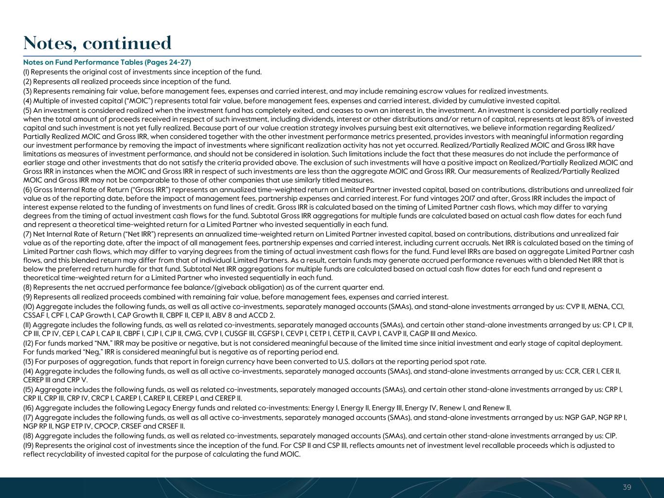 R-14 7 G-19 5 B-19 7 R-88 G-15 9 B-16 5 R-13 6 G-18 0 B-83 R-16 3 G-14 3 B-18 7 R-0 G-74 B-13 6 R-18 5 G-21 1 B-15 3 R-11 8 G-92 B-15 0 R-22 0 G-22 1 B-23 2 R-14 0 G-14 1 B-15 2R-12 0 G-16 9 B-22 2 Old Colors R-88 G-89 B-91 58595B R-23 G-234 B-234 EAEAEA R-208 G-232 B-247 D0E8F7 R-65 G-64 B-66 414042 R-8 G-51 B-94 08335E R-167 G-169 B-171 A7A9AB R-9 G-102 B-112 096670 R-220 G-221 B-222 DCDDDE R-97 G-161 B-224 61A1E0 R-237 G-217 B-157 EDD99D R-147 G-195 B-197 93C3C5 Notes, continued Notes on Fund Performance Tables (Pages 24-27) (1) Represents the original cost of investments since inception of the fund. (2) Represents all realized proceeds since inception of the fund. (3) Represents remaining fair value, before management fees, expenses and carried interest, and may include remaining escrow values for realized investments. (4) Multiple of invested capital (“MOIC”) represents total fair value, before management fees, expenses and carried interest, divided by cumulative invested capital. (5) An investment is considered realized when the investment fund has completely exited, and ceases to own an interest in, the investment. An investment is considered partially realized when the total amount of proceeds received in respect of such investment, including dividends, interest or other distributions and/or return of capital, represents at least 85% of invested capital and such investment is not yet fully realized. Because part of our value creation strategy involves pursuing best exit alternatives, we believe information regarding Realized/ Partially Realized MOIC and Gross IRR, when considered together with the other investment performance metrics presented, provides investors with meaningful information regarding our investment performance by removing the impact of investments where significant realization activity has not yet occurred. Realized/Partially Realized MOIC and Gross IRR have limitations as measures of investment performance, and should not be considered in isolation. Such limitations include the fact that these measures do not include the performance of earlier stage and other investments that do not satisfy the criteria provided above. The exclusion of such investments will have a positive impact on Realized/Partially Realized MOIC and Gross IRR in instances when the MOIC and Gross IRR in respect of such investments are less than the aggregate MOIC and Gross IRR. Our measurements of Realized/Partially Realized MOIC and Gross IRR may not be comparable to those of other companies that use similarly titled measures. (6) Gross Internal Rate of Return (“Gross IRR”) represents an annualized time-weighted return on Limited Partner invested capital, based on contributions, distributions and unrealized fair value as of the reporting date, before the impact of management fees, partnership expenses and carried interest. For fund vintages 2017 and after, Gross IRR includes the impact of interest expense related to the funding of investments on fund lines of credit. Gross IRR is calculated based on the timing of Limited Partner cash flows, which may differ to varying degrees from the timing of actual investment cash flows for the fund. Subtotal Gross IRR aggregations for multiple funds are calculated based on actual cash flow dates for each fund and represent a theoretical time-weighted return for a Limited Partner who invested sequentially in each fund. (7) Net Internal Rate of Return (“Net IRR”) represents an annualized time-weighted return on Limited Partner invested capital, based on contributions, distributions and unrealized fair value as of the reporting date, after the impact of all management fees, partnership expenses and carried interest, including current accruals. Net IRR is calculated based on the timing of Limited Partner cash flows, which may differ to varying degrees from the timing of actual investment cash flows for the fund. Fund level IRRs are based on aggregate Limited Partner cash flows, and this blended return may differ from that of individual Limited Partners. As a result, certain funds may generate accrued performance revenues with a blended Net IRR that is below the preferred return hurdle for that fund. Subtotal Net IRR aggregations for multiple funds are calculated based on actual cash flow dates for each fund and represent a theoretical time-weighted return for a Limited Partner who invested sequentially in each fund. (8) Represents the net accrued performance fee balance/(giveback obligation) as of the current quarter end. (9) Represents all realized proceeds combined with remaining fair value, before management fees, expenses and carried interest. (10) Aggregate includes the following funds, as well as all active co-investments, separately managed accounts (SMAs), and stand-alone investments arranged by us: CVP II, MENA, CCI, CSSAF I, CPF I, CAP Growth I, CAP Growth II, CBPF II, CEP II, ABV 8 and ACCD 2. (11) Aggregate includes the following funds, as well as related co-investments, separately managed accounts (SMAs), and certain other stand-alone investments arranged by us: CP I, CP II, CP III, CP IV, CEP I, CAP I, CAP II, CBPF I, CJP I, CJP II, CMG, CVP I, CUSGF III, CGFSP I, CEVP I, CETP I, CETP II, CAVP I, CAVP II, CAGP III and Mexico. (12) For funds marked “NM,” IRR may be positive or negative, but is not considered meaningful because of the limited time since initial investment and early stage of capital deployment. For funds marked “Neg,” IRR is considered meaningful but is negative as of reporting period end. (13) For purposes of aggregation, funds that report in foreign currency have been converted to U.S. dollars at the reporting period spot rate. (14) Aggregate includes the following funds, as well as all active co-investments, separately managed accounts (SMAs), and stand-alone investments arranged by us: CCR, CER I, CER II, CEREP III and CRP V. (15) Aggregate includes the following funds, as well as related co-investments, sep