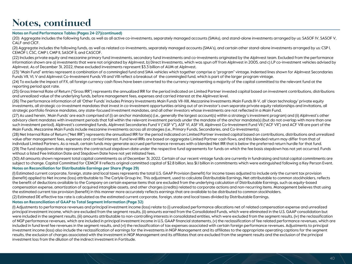 R-14 7 G-19 5 B-19 7 R-88 G-15 9 B-16 5 R-13 6 G-18 0 B-83 R-16 3 G-14 3 B-18 7 R-0 G-74 B-13 6 R-18 5 G-21 1 B-15 3 R-11 8 G-92 B-15 0 R-22 0 G-22 1 B-23 2 R-14 0 G-14 1 B-15 2R-12 0 G-16 9 B-22 2 Old Colors R-88 G-89 B-91 58595B R-23 G-234 B-234 EAEAEA R-208 G-232 B-247 D0E8F7 R-65 G-64 B-66 414042 R-8 G-51 B-94 08335E R-167 G-169 B-171 A7A9AB R-9 G-102 B-112 096670 R-220 G-221 B-222 DCDDDE R-97 G-161 B-224 61A1E0 R-237 G-217 B-157 EDD99D R-147 G-195 B-197 93C3C5 Notes, continued Notes on Fund Performance Tables (Pages 24-27)(continued) (20) Aggregate includes the following funds, as well as all active co-investments, separately managed accounts (SMAs), and stand-alone investments arranged by us: SASOF IV, SASOF V, CALF and CICF. (21) Aggregate includes the following funds, as well as related co-investments, separately managed accounts (SMA's), and certain other stand-alone investments arranged by us: CSP I, CEMOF I, CSC, CMP I, CMP II, SASOF II, and CASCOF. (22) Includes private equity and mezzanine primary fund investments, secondary fund investments and co-investments originated by the AlpInvest team. Excluded from the performance information shown are a) investments that were not originated by AlpInvest, b) Direct Investments, which was spun off from AlpInvest in 2005, and c) LP co-investment vehicles advised by AlpInvest. As of December 31, 2022, these excluded investments represent $3.3 billion of AUM at AlpInvest. (23) “Main Fund” entries represent a combination of a commingled fund and SMA vehicles which together comprise a “program” vintage. Indented lines shown for AlpInvest Secondaries Funds VII, VI, V and AlpInvest Co-Investment Funds VII and VIII reflect a breakout of the commingled fund, which is part of the larger program vintage. (24) To exclude the impact of FX, all foreign currency cash flows have been converted to the currency representing a majority of the capital committed to the relevant fund at the reporting period spot rate. (25) Gross Internal Rate of Return (“Gross IRR”) represents the annualized IRR for the period indicated on Limited Partner invested capital based on investment contributions, distributions and unrealized value of the underlying funds, before management fees, expenses and carried interest at the AlpInvest level. (26) The performance information of all ‘Other Funds’ includes Primary Investments Main Funds VII-XIII, Mezzanine Investments Main Funds III-V, all ‘clean technology’ private equity investments, all strategic co-investment mandates that invest in co-investment opportunities arising out of an investor’s own separate private equity relationships and invitations, all strategic portfolio finance mandates, any state-focused investment mandates, and all other investors whose investments are not reflected in a Main Fund. (27) As used herein, ‘Main Funds’ are each comprised of (i) an anchor mandate(s) (i.e., generally the largest account(s) within a strategy’s investment program) and (ii) AlpInvest’s other advisory client mandates with investment periods that fall within the relevant investment periods under the mandate of the anchor mandate(s) (but do not overlap with more than one such investment period). AlpInvest’s commingled funds, AlpInvest Secondaries Fund V (“ASF V”), ASF VI, ASF VII, AlpInvest Co-Investment Fund VII (“ACF VII”) and ACF VIII are part of the Main Funds. Mezzanine Main Funds include mezzanine investments across all strategies (i.e., Primary Funds, Secondaries, and Co-Investments).   (28) Net Internal Rate of Return (“Net IRR”) represents the annualized IRR for the period indicated on Limited Partner invested capital based on contributions, distributions and unrealized value after management fees, expenses and carried interest. Fund level IRRs are based on aggregate Limited Partner cash flows, and this blended return may differ from that of individual Limited Partners. As a result, certain funds may generate accrued performance revenues with a blended Net IRR that is below the preferred return hurdle for that fund. (29) The fund stepdown date represents the contractual stepdown date under the respective fund agreements for funds on which the fee basis stepdown has not yet occurred. Funds without a listed Fee Initiation Date and Stepdown Date have not yet initiated fees. (30) All amounts shown represent total capital commitments as of December 31, 2022. Certain of our recent vintage funds are currently in fundraising and total capital commitments are subject to change. Capital Committed for CEMOF II reflects original committed capital of $2.8 billion, less $1.1 billion in commitments which were extinguished following a Key Person Event. Notes on Reconciliation for Distributable Earnings per Share (Page 29) (1) Estimated current corporate, foreign, state and local taxes represents the total U.S. GAAP Provision (benefit) for income taxes adjusted to include only the current tax provision (benefit) applied to Net income (loss) attributable to The Carlyle Group Inc. This adjustment, used to calculate Distributable Earnings, Net attributable to common stockholders, reflects the benefit of deductions available to the Company on certain expense items that are excluded from the underlying calculation of Distributable Earnings, such as equity-based compensation expense, amortization of acquired intangible assets, and other charges (credits) related to corporate actions and non-recurring items. Management believes that using the estimated current tax provision (benefit) in this manner more accurately reflects earnings that are available to be distributed to common stockholders. (2) Estimated DE effective tax rate is calculated as the estimated current corporate, foreign, state and local taxes divided by Distributable Earnings. Notes on Reconciliation of GAAP to Total Segment Information (Page 32) (1) Adjustments to performance revenues and principal investment income (loss) relate to (i)