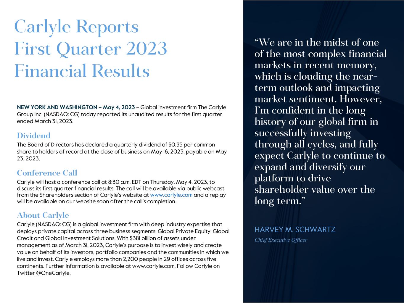 Carlyle Reports First Quarter 2023 Financial Results NEW YORK AND WASHINGTON – May 4, 2023 – Global investment firm The Carlyle Group Inc. (NASDAQ: CG) today reported its unaudited results for the first quarter ended March 31, 2023. Dividend The Board of Directors has declared a quarterly dividend of $0.35 per common share to holders of record at the close of business on May 16, 2023, payable on May 23, 2023. Conference Call Carlyle will host a conference call at 8:30 a.m. EDT on Thursday, May 4, 2023, to discuss its first quarter financial results. The call will be available via public webcast from the Shareholders section of Carlyle's website at www.carlyle.com and a replay will be available on our website soon after the call’s completion. About Carlyle Carlyle (NASDAQ: CG) is a global investment firm with deep industry expertise that deploys private capital across three business segments: Global Private Equity, Global Credit and Global Investment Solutions. With $381 billion of assets under management as of March 31, 2023, Carlyle’s purpose is to invest wisely and create value on behalf of its investors, portfolio companies and the communities in which we live and invest. Carlyle employs more than 2,200 people in 29 offices across five continents. Further information is available at www.carlyle.com. Follow Carlyle on Twitter @OneCarlyle. 2 “We are in the midst of one of the most complex financial markets in recent memory, which is clouding the near- term outlook and impacting market sentiment. However, I’m confident in the long history of our global firm in successfully investing through all cycles, and fully expect Carlyle to continue to expand and diversify our platform to drive shareholder value over the long term.” HARVEY M. SCHWARTZ Chief Executive Officer