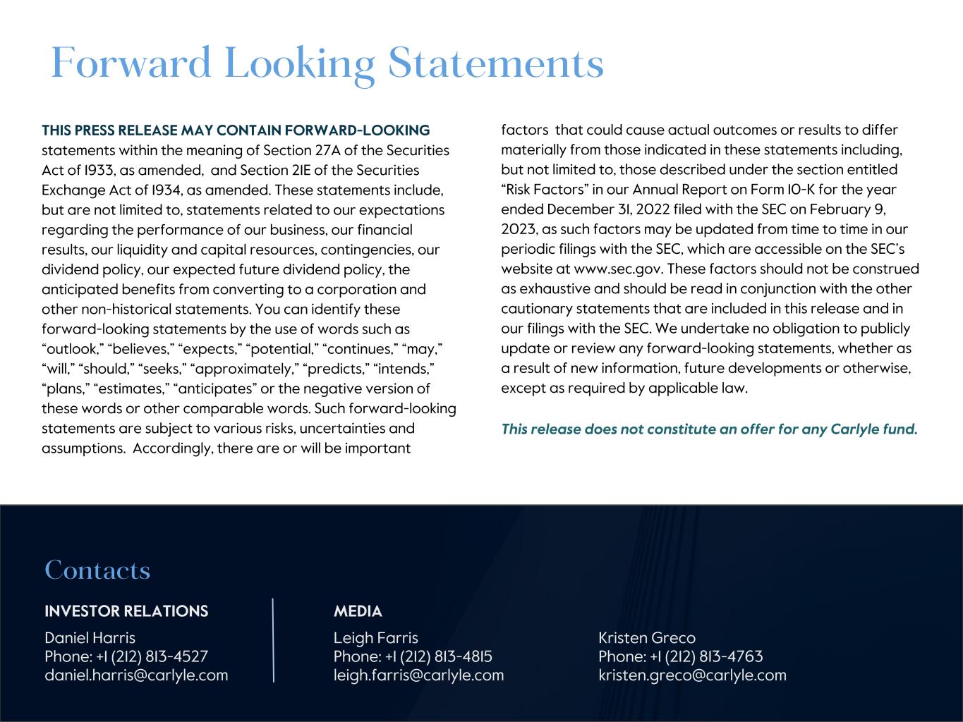 THIS PRESS RELEASE MAY CONTAIN FORWARD-LOOKING statements within the meaning of Section 27A of the Securities Act of 1933, as amended, and Section 21E of the Securities Exchange Act of 1934, as amended. These statements include, but are not limited to, statements related to our expectations regarding the performance of our business, our financial results, our liquidity and capital resources, contingencies, our dividend policy, our expected future dividend policy, the anticipated benefits from converting to a corporation and other non-historical statements. You can identify these forward-looking statements by the use of words such as “outlook,” “believes,” “expects,” “potential,” “continues,” “may,” “will,” “should,” “seeks,” “approximately,” “predicts,” “intends,” “plans,” “estimates,” “anticipates” or the negative version of these words or other comparable words. Such forward-looking statements are subject to various risks, uncertainties and assumptions. Accordingly, there are or will be important Forward Looking Statements factors that could cause actual outcomes or results to differ materially from those indicated in these statements including, but not limited to, those described under the section entitled “Risk Factors” in our Annual Report on Form 10-K for the year ended December 31, 2022 filed with the SEC on February 9, 2023, as such factors may be updated from time to time in our periodic filings with the SEC, which are accessible on the SEC’s website at www.sec.gov. These factors should not be construed as exhaustive and should be read in conjunction with the other cautionary statements that are included in this release and in our filings with the SEC. We undertake no obligation to publicly update or review any forward-looking statements, whether as a result of new information, future developments or otherwise, except as required by applicable law. This release does not constitute an offer for any Carlyle fund. Contacts INVESTOR RELATIONS MEDIA Daniel Harris Leigh Farris Kristen Greco Phone: +1 (212) 813-4527 Phone: +1 (212) 813-4815 Phone: +1 (212) 813-4763 daniel.harris@carlyle.com leigh.farris@carlyle.com kristen.greco@carlyle.com