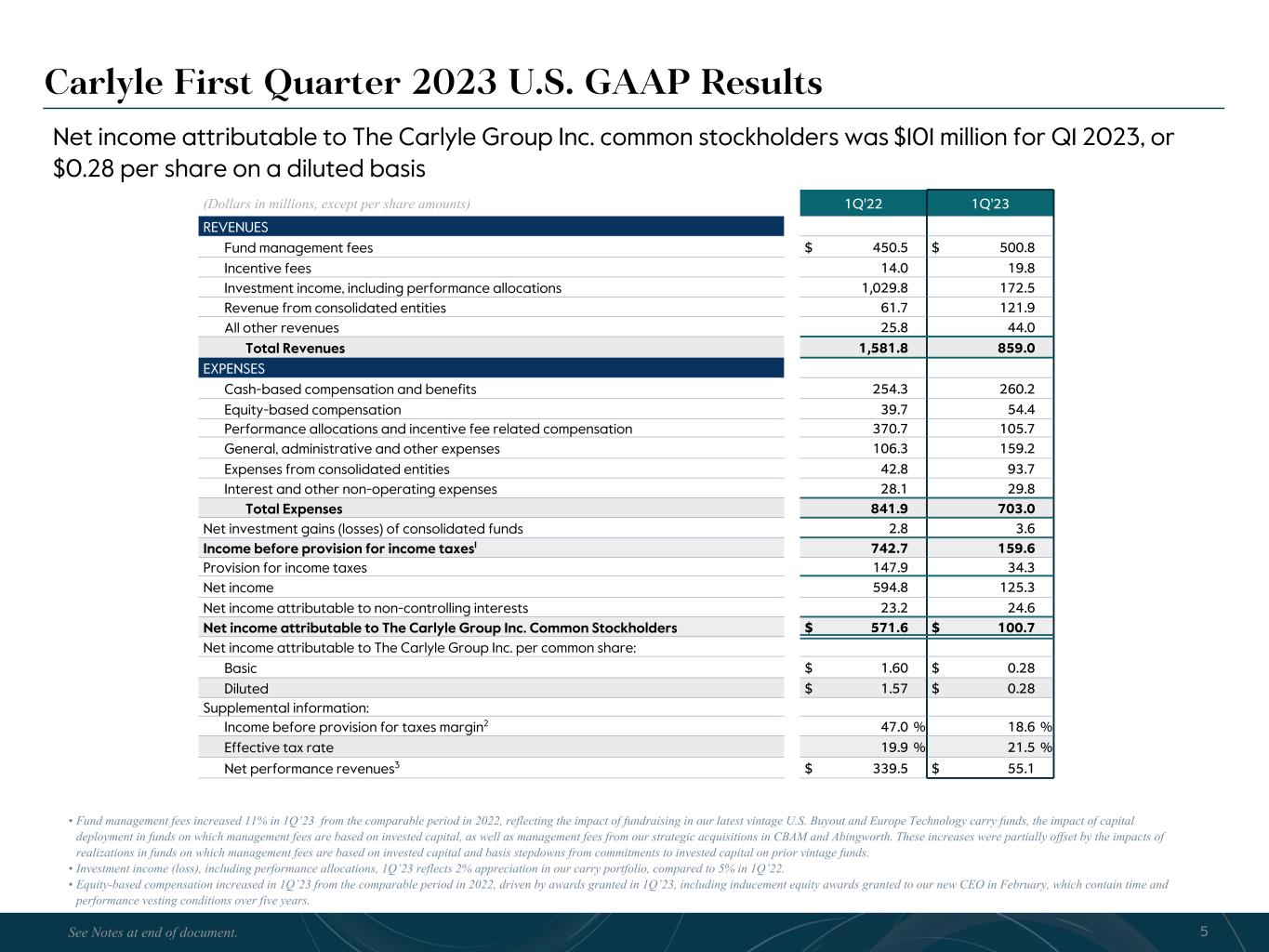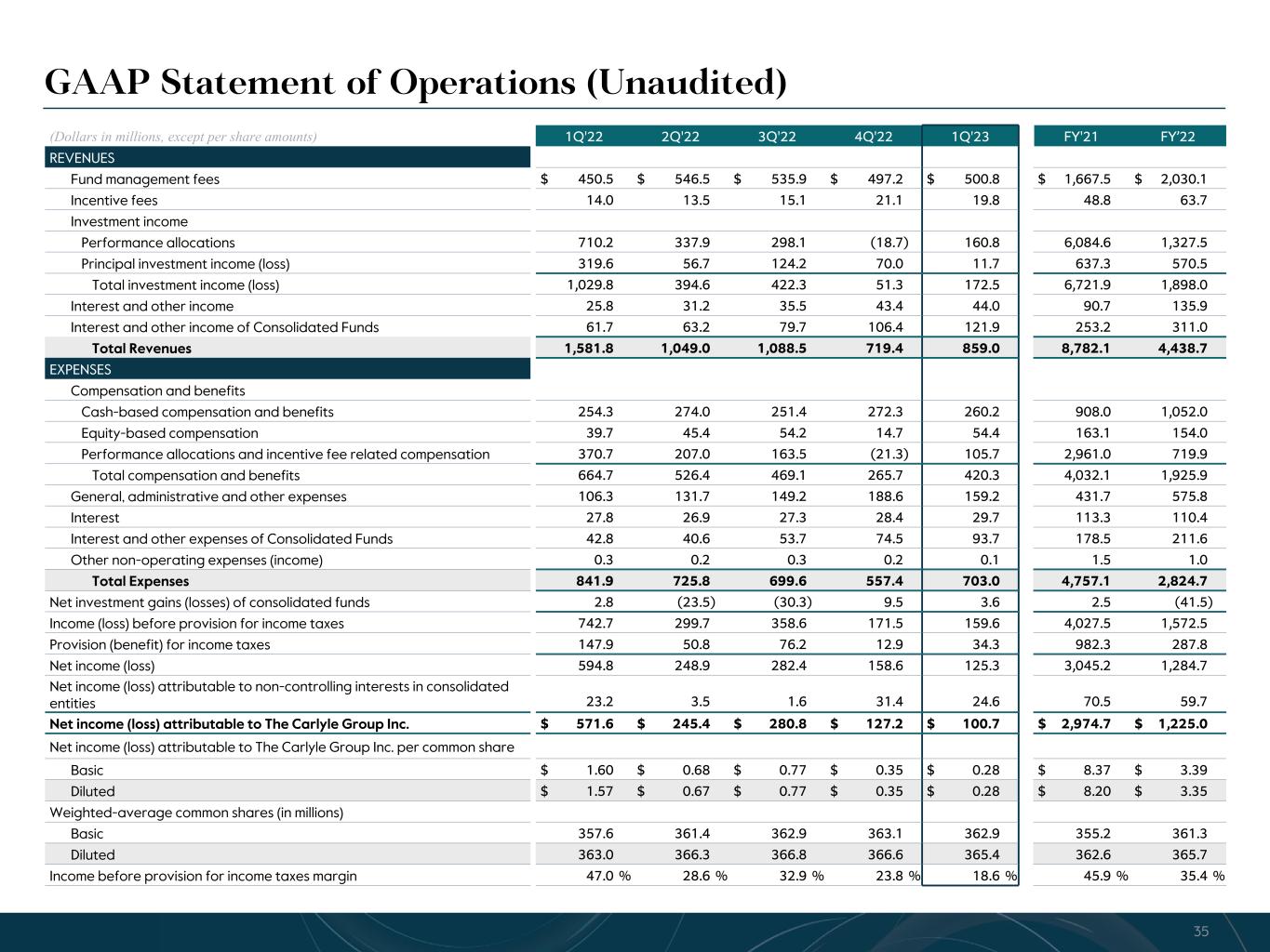 R-14 7 G-19 5 B-19 7 R-88 G-15 9 B-16 5 R-13 6 G-18 0 B-83 R-16 3 G-14 3 B-18 7 R-0 G-74 B-13 6 R-18 5 G-21 1 B-15 3 R-11 8 G-92 B-15 0 R-22 0 G-22 1 B-23 2 R-14 0 G-14 1 B-15 2R-12 0 G-16 9 B-22 2 Old Colors R-88 G-89 B-91 58595B R-23 G-234 B-234 EAEAEA R-208 G-232 B-247 D0E8F7 R-65 G-64 B-66 414042 R-8 G-51 B-94 08335E R-167 G-169 B-171 A7A9AB R-9 G-102 B-112 096670 R-220 G-221 B-222 DCDDDE R-97 G-161 B-224 61A1E0 R-237 G-217 B-157 EDD99D R-147 G-195 B-197 93C3C5 GAAP Statement of Operations (Unaudited) (Dollars in millions, except per share amounts) 1Q'22 2Q'22 3Q'22 4Q'22 1Q'23 FY'21 FY’22 REVENUES Fund management fees $ 450.5 $ 546.5 $ 535.9 $ 497.2 $ 500.8 $ 1,667.5 $ 2,030.1 Incentive fees 14.0 13.5 15.1 21.1 19.8 48.8 63.7 Investment income Performance allocations 710.2 337.9 298.1 (18.7) 160.8 6,084.6 1,327.5 Principal investment income (loss) 319.6 56.7 124.2 70.0 11.7 637.3 570.5 Total investment income (loss) 1,029.8 394.6 422.3 51.3 172.5 6,721.9 1,898.0 Interest and other income 25.8 31.2 35.5 43.4 44.0 90.7 135.9 Interest and other income of Consolidated Funds 61.7 63.2 79.7 106.4 121.9 253.2 311.0 Total Revenues 1,581.8 1,049.0 1,088.5 719.4 859.0 8,782.1 4,438.7 EXPENSES Compensation and benefits Cash-based compensation and benefits 254.3 274.0 251.4 272.3 260.2 908.0 1,052.0 Equity-based compensation 39.7 45.4 54.2 14.7 54.4 163.1 154.0 Performance allocations and incentive fee related compensation 370.7 207.0 163.5 (21.3) 105.7 2,961.0 719.9 Total compensation and benefits 664.7 526.4 469.1 265.7 420.3 4,032.1 1,925.9 General, administrative and other expenses 106.3 131.7 149.2 188.6 159.2 431.7 575.8 Interest 27.8 26.9 27.3 28.4 29.7 113.3 110.4 Interest and other expenses of Consolidated Funds 42.8 40.6 53.7 74.5 93.7 178.5 211.6 Other non-operating expenses (income) 0.3 0.2 0.3 0.2 0.1 1.5 1.0 Total Expenses 841.9 725.8 699.6 557.4 703.0 4,757.1 2,824.7 Net investment gains (losses) of consolidated funds 2.8 (23.5) (30.3) 9.5 3.6 2.5 (41.5) Income (loss) before provision for income taxes 742.7 299.7 358.6 171.5 159.6 4,027.5 1,572.5 Provision (benefit) for income taxes 147.9 50.8 76.2 12.9 34.3 982.3 287.8 Net income (loss) 594.8 248.9 282.4 158.6 125.3 3,045.2 1,284.7 Net income (loss) attributable to non-controlling interests in consolidated entities 23.2 3.5 1.6 31.4 24.6 70.5 59.7 Net income (loss) attributable to The Carlyle Group Inc. $ 571.6 $ 245.4 $ 280.8 $ 127.2 $ 100.7 $ 2,974.7 $ 1,225.0 Net income (loss) attributable to The Carlyle Group Inc. per common share Basic $ 1.60 $ 0.68 $ 0.77 $ 0.35 $ 0.28 $ 8.37 $ 3.39 Diluted $ 1.57 $ 0.67 $ 0.77 $ 0.35 $ 0.28 $ 8.20 $ 3.35 Weighted-average common shares (in millions) Basic 357.6 361.4 362.9 363.1 362.9 355.2 361.3 Diluted 363.0 366.3 366.8 366.6 365.4 362.6 365.7 Income before provision for income taxes margin 47.0 % 28.6 % 32.9 % 23.8 % 18.6 % 45.9 % 35.4 % 35