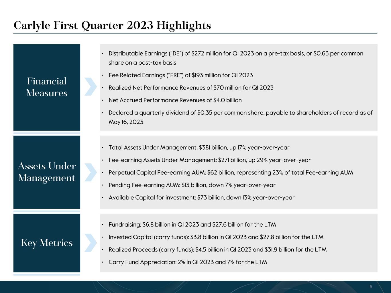 R-14 7 G-19 5 B-19 7 R-88 G-15 9 B-16 5 R-13 6 G-18 0 B-83 R-16 3 G-14 3 B-18 7 R-0 G-74 B-13 6 R-18 5 G-21 1 B-15 3 R-11 8 G-92 B-15 0 R-22 0 G-22 1 B-23 2 R-14 0 G-14 1 B-15 2R-12 0 G-16 9 B-22 2 Old Colors R-88 G-89 B-91 58595B R-23 G-234 B-234 EAEAEA R-208 G-232 B-247 D0E8F7 R-65 G-64 B-66 414042 R-8 G-51 B-94 08335E R-167 G-169 B-171 A7A9AB R-9 G-102 B-112 096670 R-220 G-221 B-222 DCDDDE R-97 G-161 B-224 61A1E0 R-237 G-217 B-157 EDD99D R-147 G-195 B-197 93C3C5 • Fund management fees increased 11% in 1Q’23 from the comparable period in 2022, reflecting the impact of fundraising in our latest vintage U.S. Buyout and Europe Technology carry funds, the impact of capital deployment in funds on which management fees are based on invested capital, as well as management fees from our strategic acquisitions in CBAM and Abingworth. These increases were partially offset by the impacts of realizations in funds on which management fees are based on invested capital and basis stepdowns from commitments to invested capital on prior vintage funds. • Investment income (loss), including performance allocations, 1Q’23 reflects 2% appreciation in our carry portfolio, compared to 5% in 1Q’22. • Equity-based compensation increased in 1Q’23 from the comparable period in 2022, driven by awards granted in 1Q’23, including inducement equity awards granted to our new CEO in February, which contain time and performance vesting conditions over five years. (Dollars in millions, except per share amounts) 1Q'22 1Q'23 REVENUES Fund management fees $ 450.5 $ 500.8 Incentive fees 14.0 19.8 Investment income, including performance allocations 1,029.8 172.5 Revenue from consolidated entities 61.7 121.9 All other revenues 25.8 44.0 Total Revenues 1,581.8 859.0 EXPENSES Cash-based compensation and benefits 254.3 260.2 Equity-based compensation 39.7 54.4 Performance allocations and incentive fee related compensation 370.7 105.7 General, administrative and other expenses 106.3 159.2 Expenses from consolidated entities 42.8 93.7 Interest and other non-operating expenses 28.1 29.8 Total Expenses 841.9 703.0 Net investment gains (losses) of consolidated funds 2.8 3.6 Income before provision for income taxes1 742.7 159.6 Provision for income taxes 147.9 34.3 Net income 594.8 125.3 Net income attributable to non-controlling interests 23.2 24.6 Net income attributable to The Carlyle Group Inc. Common Stockholders $ 571.6 $ 100.7 Net income attributable to The Carlyle Group Inc. per common share: Basic $ 1.60 $ 0.28 Diluted $ 1.57 $ 0.28 Supplemental information: Income before provision for taxes margin2 47.0 % 18.6 % Effective tax rate 19.9 % 21.5 % Net performance revenues3 $ 339.5 $ 55.1 Carlyle First Quarter 2023 U.S. GAAP Results Net income attributable to The Carlyle Group Inc. common stockholders was $101 million for Q1 2023, or $0.28 per share on a diluted basis 5See Notes at end of document.