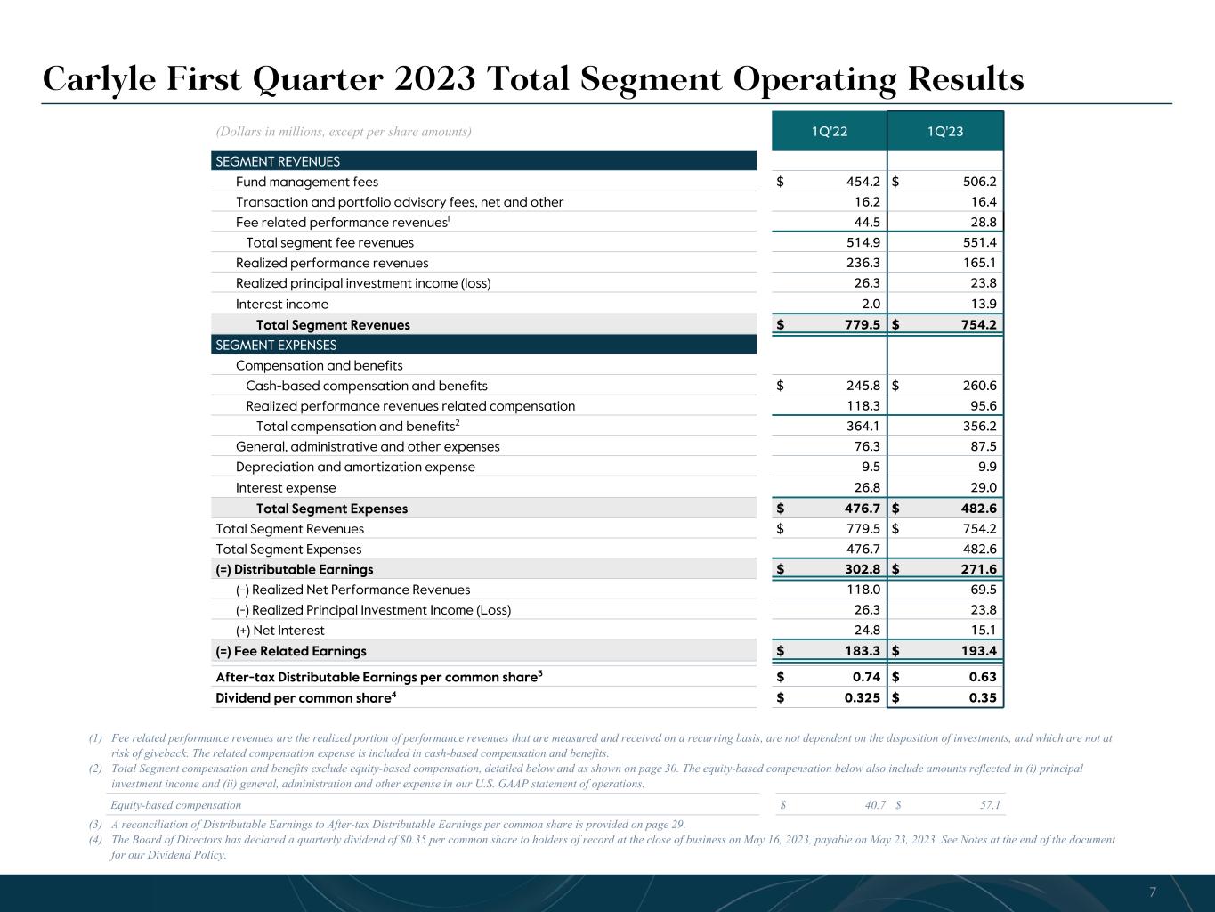 R-14 7 G-19 5 B-19 7 R-88 G-15 9 B-16 5 R-13 6 G-18 0 B-83 R-16 3 G-14 3 B-18 7 R-0 G-74 B-13 6 R-18 5 G-21 1 B-15 3 R-11 8 G-92 B-15 0 R-22 0 G-22 1 B-23 2 R-14 0 G-14 1 B-15 2R-12 0 G-16 9 B-22 2 Old Colors R-88 G-89 B-91 58595B R-23 G-234 B-234 EAEAEA R-208 G-232 B-247 D0E8F7 R-65 G-64 B-66 414042 R-8 G-51 B-94 08335E R-167 G-169 B-171 A7A9AB R-9 G-102 B-112 096670 R-220 G-221 B-222 DCDDDE R-97 G-161 B-224 61A1E0 R-237 G-217 B-157 EDD99D R-147 G-195 B-197 93C3C5 Note: Historical and quarterly results by segment available in Q1 2023 financial supplement on Carlyle's investor relations website. (1) Total Segment compensation and benefits exclude equity-based compensation, detailed below and as shown on page 30. These amounts include equity-based compensation reflected in (i) principal investment income and (ii) general, administration and other expense in our U.S. GAAP statement of operations, and exclude amounts related to shares issued in conjunction with a previous acquisition. (Dollars in millions, except per share amounts) 1Q'22 2Q'22 3Q'22 4Q'22 1Q'23 SEGMENT REVENUES Fund management fees $ 454.2 $ 516.2 $ 514.1 $ 512.4 $ 506.2 Transaction and portfolio advisory fees, net and other 16.2 42.2 35.0 17.7 16.4 Fee related performance revenues 44.5 35.1 20.6 29.1 28.8 Total segment fee revenues 514.9 593.5 569.7 559.2 551.4 Realized performance revenues 236.3 519.9 764.8 459.7 165.1 Realized principal investment income 26.3 43.8 56.7 23.8 23.8 Interest income 2.0 4.0 10.5 16.3 13.9 Total Segment Revenues $ 779.5 $ 1,161.2 $ 1,401.7 $ 1,059.0 $ 754.2 SEGMENT EXPENSES Compensation and benefits Cash-based compensation and benefits $ 245.8 $ 259.7 $ 246.7 $ 242.0 $ 260.6 Realized performance revenues related compensation 118.3 249.0 373.7 241.2 95.6 Total compensation and benefits1 364.1 508.7 620.4 483.2 356.2 General, administrative and other expenses 76.3 87.9 100.8 104.8 87.5 Depreciation and amortization expense 9.5 9.5 9.6 10.3 9.9 Interest expense 26.8 26.3 26.5 27.7 29.0 Total Segment Expenses $ 476.7 $ 632.4 $ 757.3 $ 626.0 $ 482.6 Total Segment Revenues 779.5 1,161.2 1,401.7 1,059.0 754.2 Total Segment Expenses 476.7 632.4 757.3 626.0 482.6 (=) Distributable Earnings $ 302.8 $ 528.8 $ 644.4 $ 433.0 $ 271.6 (-) Realized Net Performance Revenues 118.0 270.9 391.1 218.5 69.5 (-) Realized Principal Investment Income 26.3 43.8 56.7 23.8 23.8 (+) Net Interest 24.8 22.3 16.0 11.4 15.1 (=) Fee Related Earnings $ 183.3 $ 236.4 $ 212.6 $ 202.1 $ 193.4 After-tax Distributable Earnings, per common share $ 0.74 $ 1.17 $ 1.42 $ 1.01 $ 0.63 Dividend per common share $ 0.325 $ 0.325 $ 0.325 $ 0.325 $ 0.35 Carlyle First Quarter 2023 Total Segment Results Equity-based compensation $ 40.7 $ 48.3 $ 56.0 $ 16.9 $ 57.1 21