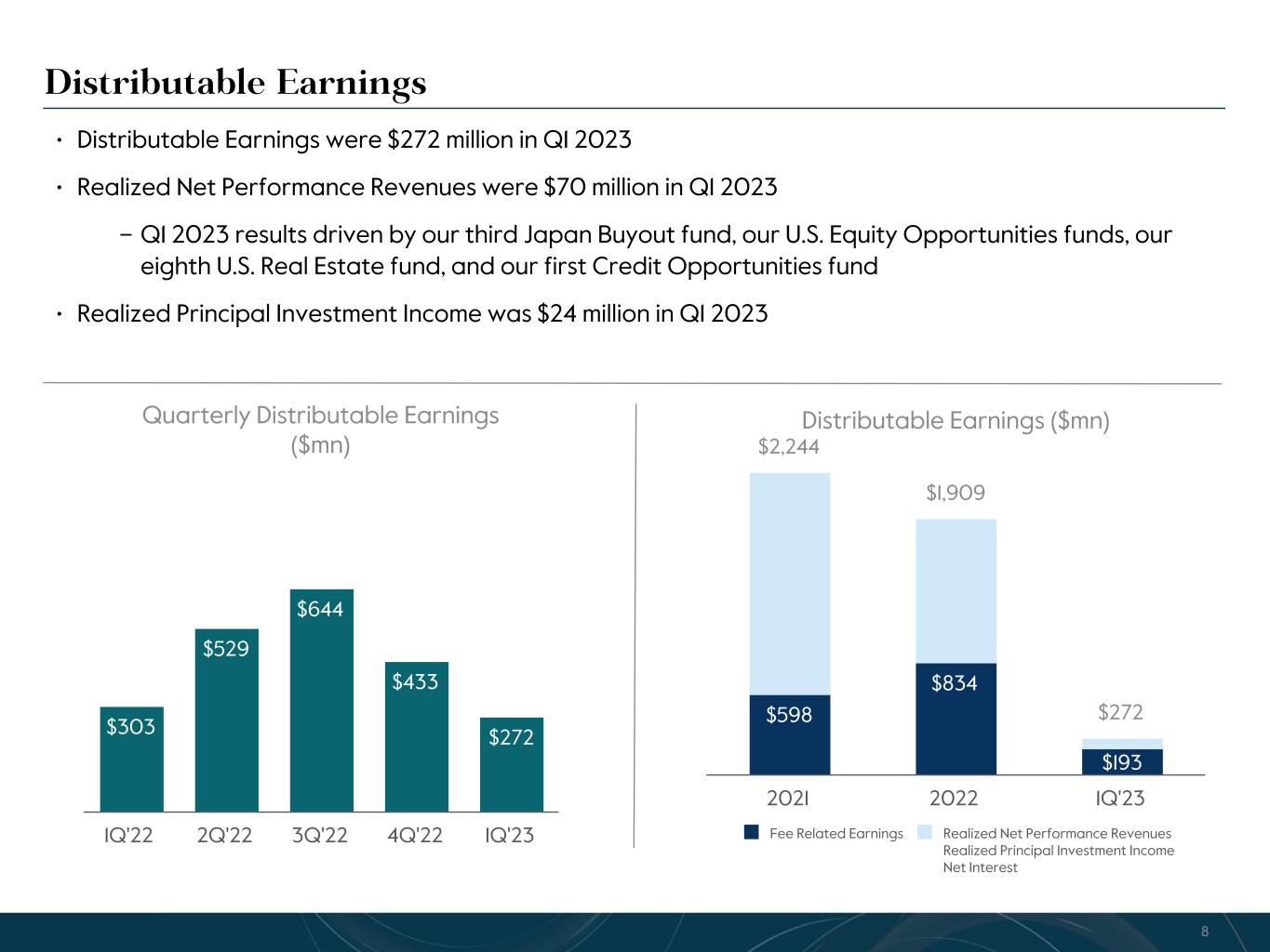 R-14 7 G-19 5 B-19 7 R-88 G-15 9 B-16 5 R-13 6 G-18 0 B-83 R-16 3 G-14 3 B-18 7 R-0 G-74 B-13 6 R-18 5 G-21 1 B-15 3 R-11 8 G-92 B-15 0 R-22 0 G-22 1 B-23 2 R-14 0 G-14 1 B-15 2R-12 0 G-16 9 B-22 2 Old Colors R-88 G-89 B-91 58595B R-23 G-234 B-234 EAEAEA R-208 G-232 B-247 D0E8F7 R-65 G-64 B-66 414042 R-8 G-51 B-94 08335E R-167 G-169 B-171 A7A9AB R-9 G-102 B-112 096670 R-220 G-221 B-222 DCDDDE R-97 G-161 B-224 61A1E0 R-237 G-217 B-157 EDD99D R-147 G-195 B-197 93C3C5 Distributable Earnings • Distributable Earnings were $272 million in Q1 2023 • Realized Net Performance Revenues were $70 million in Q1 2023 – Q1 2023 results driven by our third Japan Buyout fund, our U.S. Equity Opportunities funds, our eighth U.S. Real Estate fund, and our first Credit Opportunities fund • Realized Principal Investment Income was $24 million in Q1 2023 Quarterly Distributable Earnings ($mn) $303 $529 $644 $433 $272 1Q'22 2Q'22 3Q'22 4Q'22 1Q'23 Distributable Earnings ($mn) $598 $834 $193 $2,244 $1,909 $272 Fee Related Earnings Realized Net Performance Revenues Realized Principal Investment Income Net Interest 2021 2022 1Q'23 8