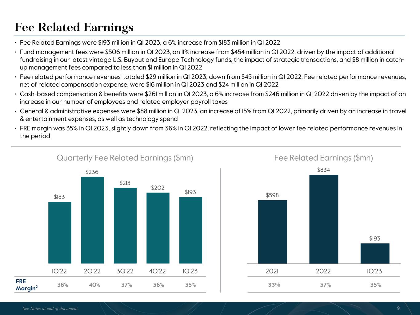 R-14 7 G-19 5 B-19 7 R-88 G-15 9 B-16 5 R-13 6 G-18 0 B-83 R-16 3 G-14 3 B-18 7 R-0 G-74 B-13 6 R-18 5 G-21 1 B-15 3 R-11 8 G-92 B-15 0 R-22 0 G-22 1 B-23 2 R-14 0 G-14 1 B-15 2R-12 0 G-16 9 B-22 2 Old Colors R-88 G-89 B-91 58595B R-23 G-234 B-234 EAEAEA R-208 G-232 B-247 D0E8F7 R-65 G-64 B-66 414042 R-8 G-51 B-94 08335E R-167 G-169 B-171 A7A9AB R-9 G-102 B-112 096670 R-220 G-221 B-222 DCDDDE R-97 G-161 B-224 61A1E0 R-237 G-217 B-157 EDD99D R-147 G-195 B-197 93C3C5 Fee Related Earnings • Fee Related Earnings were $193 million in Q1 2023, a 6% increase from $183 million in Q1 2022 • Fund management fees were $506 million in Q1 2023, an 11% increase from $454 million in Q1 2022, driven by the impact of additional fundraising in our latest vintage U.S. Buyout and Europe Technology funds, the impact of strategic transactions, and $8 million in catch- up management fees compared to less than $1 million in Q1 2022 • Fee related performance revenues1 totaled $29 million in Q1 2023, down from $45 million in Q1 2022. Fee related performance revenues, net of related compensation expense, were $16 million in Q1 2023 and $24 million in Q1 2022 • Cash-based compensation & benefits were $261 million in Q1 2023, a 6% increase from $246 million in Q1 2022 driven by the impact of an increase in our number of employees and related employer payroll taxes • General & administrative expenses were $88 million in Q1 2023, an increase of 15% from Q1 2022, primarily driven by an increase in travel & entertainment expenses, as well as technology spend • FRE margin was 35% in Q1 2023, slightly down from 36% in Q1 2022, reflecting the impact of lower fee related performance revenues in the period Quarterly Fee Related Earnings ($mn) $183 $236 $213 $202 $193 1Q'22 2Q'22 3Q'22 4Q'22 1Q'23 Fee Related Earnings ($mn) $598 $834 $193 2021 2022 1Q'23 FRE Margin2 36% 40% 37% 36% 35% 33% 37% 35% 9See Notes at end of document.