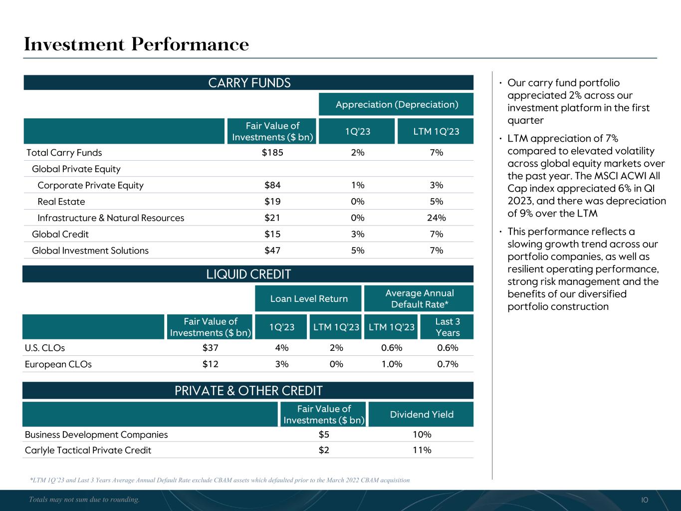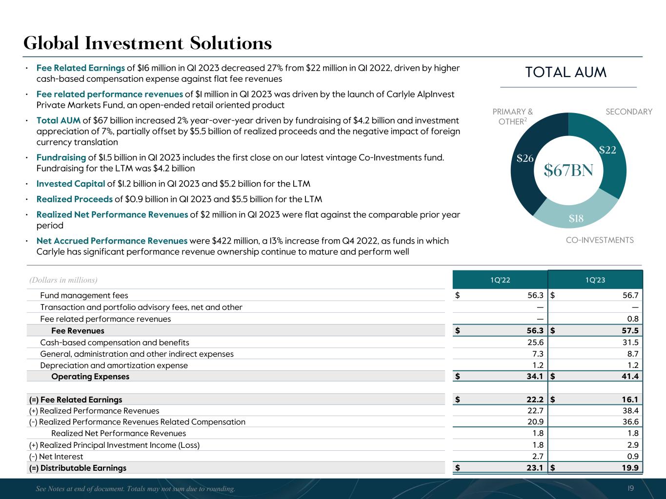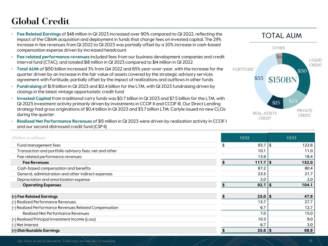 R-14 7 G-19 5 B-19 7 R-88 G-15 9 B-16 5 R-13 6 G-18 0 B-83 R-16 3 G-14 3 B-18 7 R-0 G-74 B-13 6 R-18 5 G-21 1 B-15 3 R-11 8 G-92 B-15 0 R-22 0 G-22 1 B-23 2 R-14 0 G-14 1 B-15 2R-12 0 G-16 9 B-22 2 Old Colors R-88 G-89 B-91 58595B R-23 G-234 B-234 EAEAEA R-208 G-232 B-247 D0E8F7 R-65 G-64 B-66 414042 R-8 G-51 B-94 08335E R-167 G-169 B-171 A7A9AB R-9 G-102 B-112 096670 R-220 G-221 B-222 DCDDDE R-97 G-161 B-224 61A1E0 R-237 G-217 B-157 EDD99D R-147 G-195 B-197 93C3C5 Global Credit (Dollars in millions) 1Q'22 1Q'23 Fund management fees $ 93.7 $ 122.6 Transaction and portfolio advisory fees, net and other 10.1 11.0 Fee related performance revenues 13.9 18.4 Fee Revenues $ 117.7 $ 152.0 Cash-based compensation and benefits 67.2 80.4 General, administration and other indirect expenses 23.5 21.7 Depreciation and amortization expense 2.0 2.0 Operating Expenses $ 92.7 $ 104.1 (=) Fee Related Earnings $ 25.0 $ 47.9 (+) Realized Performance Revenues 13.7 27.7 (-) Realized Performance Revenues Related Compensation 6.7 12.7 Realized Net Performance Revenues 7.0 15.0 (+) Realized Principal Investment Income (Loss) 10.3 9.0 (-) Net Interest 6.7 3.0 (=) Distributable Earnings $ 35.6 $ 68.9 $50 $24$15 $55 $6 LIQUID CREDIT REAL ASSETS CREDIT $150BN • Fee Related Earnings of $48 million in Q1 2023 increased over 90% compared to Q1 2022, reflecting the impact of the CBAM acquisition and deployment in funds that charge fees on invested capital. The 29% increase in fee revenues from Q1 2022 to Q1 2023 was partially offset by a 20% increase in cash-based compensation expense driven by increased headcount • Fee related performance revenues included fees from our business development companies and credit interval fund (CTAC), and totaled $18 million in Q1 2023 compared to $14 million in Q1 2022 • Total AUM of $150 billion increased 3% from Q4 2022 and 65% year-over-year, with the increase for the quarter driven by an increase in the fair value of assets covered by the strategic advisory services agreement with Fortitude, partially offset by the impact of realizations and outflows in other funds • Fundraising of $1.9 billion in Q1 2023 and $12.4 billion for the LTM, with Q1 2023 fundraising driven by closings in the latest vintage opportunistic credit fund • Invested Capital from traditional carry funds was $0.7 billion in Q1 2023 and $7.5 billion for the LTM, with Q1 2023 investment activity primarily driven by investments in CCOF II and CCOF III. Our Direct Lending strategy had gross originations of $0.4 billion in Q1 2023 and $3.7 billion LTM. Carlyle issued no new CLOs during the quarter • Realized Net Performance Revenues of $15 million in Q1 2023 were driven by realization activity in CCOF I and our second distressed credit fund (CSP II) OTHER 18 PRIVATE CREDIT TOTAL AUM FORTITUDE 1 See Notes at end of document. Totals may not sum due to rounding.