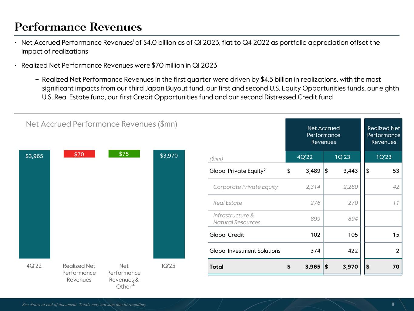 R-14 7 G-19 5 B-19 7 R-88 G-15 9 B-16 5 R-13 6 G-18 0 B-83 R-16 3 G-14 3 B-18 7 R-0 G-74 B-13 6 R-18 5 G-21 1 B-15 3 R-11 8 G-92 B-15 0 R-22 0 G-22 1 B-23 2 R-14 0 G-14 1 B-15 2R-12 0 G-16 9 B-22 2 Old Colors R-88 G-89 B-91 58595B R-23 G-234 B-234 EAEAEA R-208 G-232 B-247 D0E8F7 R-65 G-64 B-66 414042 R-8 G-51 B-94 08335E R-167 G-169 B-171 A7A9AB R-9 G-102 B-112 096670 R-220 G-221 B-222 DCDDDE R-97 G-161 B-224 61A1E0 R-237 G-217 B-157 EDD99D R-147 G-195 B-197 93C3C5 Performance Revenues • Net Accrued Performance Revenues1 of $4.0 billion as of Q1 2023, flat to Q4 2022 as portfolio appreciation offset the impact of realizations • Realized Net Performance Revenues were $70 million in Q1 2023 – Realized Net Performance Revenues in the first quarter were driven by $4.5 billion in realizations, with the most significant impacts from our third Japan Buyout fund, our first and second U.S. Equity Opportunities funds, our eighth U.S. Real Estate fund, our first Credit Opportunities fund and our second Distressed Credit fund Net Accrued Performance Revenues ($mn) $3,965 $3,895 $3,895 $3,970$70 $75 4Q'22 Realized Net Performance Revenues Net Performance Revenues & Other 1Q'23 2 Net Accrued Performance Revenues Realized Net Performance Revenues ($mn) 4Q'22 1Q'23 1Q'23 Global Private Equity3 $ 3,489 $ 3,443 $ 53 Corporate Private Equity 2,314 2,280 42 Real Estate 276 270 11 Infrastructure & Natural Resources 899 894 — Global Credit 102 105 15 Global Investment Solutions 374 422 2 Total $ 3,965 $ 3,970 $ 70 11See Notes at end of document. Totals may not sum due to rounding.