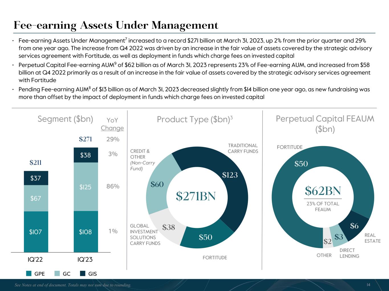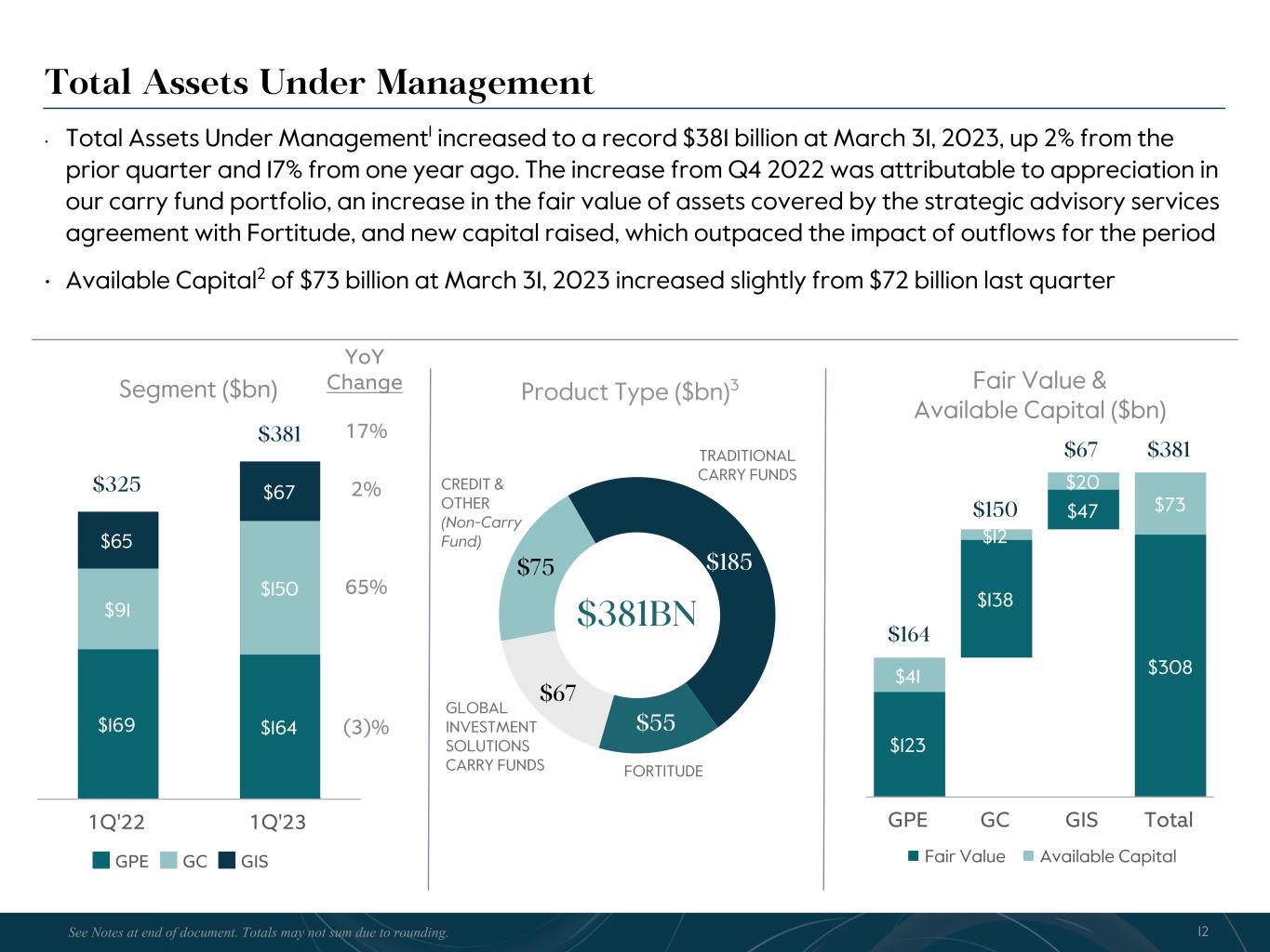 R-14 7 G-19 5 B-19 7 R-88 G-15 9 B-16 5 R-13 6 G-18 0 B-83 R-16 3 G-14 3 B-18 7 R-0 G-74 B-13 6 R-18 5 G-21 1 B-15 3 R-11 8 G-92 B-15 0 R-22 0 G-22 1 B-23 2 R-14 0 G-14 1 B-15 2R-12 0 G-16 9 B-22 2 Old Colors R-88 G-89 B-91 58595B R-23 G-234 B-234 EAEAEA R-208 G-232 B-247 D0E8F7 R-65 G-64 B-66 414042 R-8 G-51 B-94 08335E R-167 G-169 B-171 A7A9AB R-9 G-102 B-112 096670 R-220 G-221 B-222 DCDDDE R-97 G-161 B-224 61A1E0 R-237 G-217 B-157 EDD99D R-147 G-195 B-197 93C3C5 $185 $55 $67 $75 • Total Assets Under Management1 increased to a record $381 billion at March 31, 2023, up 2% from the prior quarter and 17% from one year ago. The increase from Q4 2022 was attributable to appreciation in our carry fund portfolio, an increase in the fair value of assets covered by the strategic advisory services agreement with Fortitude, and new capital raised, which outpaced the impact of outflows for the period • Available Capital2 of $73 billion at March 31, 2023 increased slightly from $72 billion last quarter Fair Value & Available Capital ($bn) $123 $138 $47 $308$41 $12 $20 $73 GPE GC GIS Total Total Assets Under Management n Fair Value n Available Capital 12See Notes at end of document. Totals may not sum due to rounding. Segment ($bn) $169 $164 $91 $150 $65 $67$325 $381 GPE GC GIS 1Q'22 1Q'23 YoY Change 17% 2% 65% (3)% $381BN TRADITIONAL CARRY FUNDS GLOBAL INVESTMENT SOLUTIONS CARRY FUNDS CREDIT & OTHER (Non-Carry Fund) Product Type ($bn)3 $164 $150 $67 $381 FORTITUDE