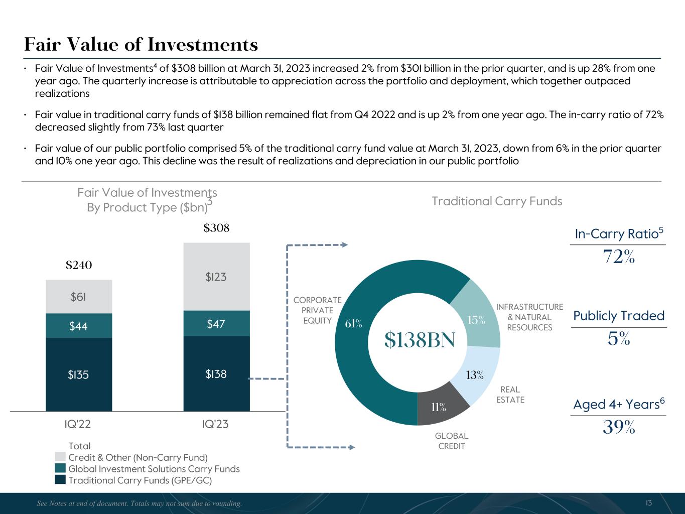 R-14 7 G-19 5 B-19 7 R-88 G-15 9 B-16 5 R-13 6 G-18 0 B-83 R-16 3 G-14 3 B-18 7 R-0 G-74 B-13 6 R-18 5 G-21 1 B-15 3 R-11 8 G-92 B-15 0 R-22 0 G-22 1 B-23 2 R-14 0 G-14 1 B-15 2R-12 0 G-16 9 B-22 2 Old Colors R-88 G-89 B-91 58595B R-23 G-234 B-234 EAEAEA R-208 G-232 B-247 D0E8F7 R-65 G-64 B-66 414042 R-8 G-51 B-94 08335E R-167 G-169 B-171 A7A9AB R-9 G-102 B-112 096670 R-220 G-221 B-222 DCDDDE R-97 G-161 B-224 61A1E0 R-237 G-217 B-157 EDD99D R-147 G-195 B-197 93C3C5 Fair Value of Investments • Fair Value of Investments4 of $308 billion at March 31, 2023 increased 2% from $301 billion in the prior quarter, and is up 28% from one year ago. The quarterly increase is attributable to appreciation across the portfolio and deployment, which together outpaced realizations • Fair value in traditional carry funds of $138 billion remained flat from Q4 2022 and is up 2% from one year ago. The in-carry ratio of 72% decreased slightly from 73% last quarter • Fair value of our public portfolio comprised 5% of the traditional carry fund value at March 31, 2023, down from 6% in the prior quarter and 10% one year ago. This decline was the result of realizations and depreciation in our public portfolio 13See Notes at end of document. Totals may not sum due to rounding. In-Carry Ratio5 72% Publicly Traded 5% Aged 4+ Years6 39% Fair Value of Investments By Product Type ($bn) $135 $138 $44 $47 $61 $123 $240 $308 Total Credit & Other (Non-Carry Fund) Global Investment Solutions Carry Funds Traditional Carry Funds (GPE/GC) 1Q'22 1Q'23 61% 15% 13% 11% $138BN Traditional Carry Funds REAL ESTATE CORPORATE PRIVATE EQUITY GLOBAL CREDIT INFRASTRUCTURE & NATURAL RESOURCES 3