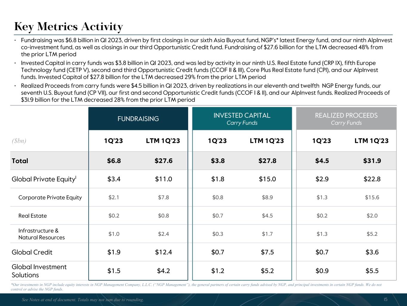 R-14 7 G-19 5 B-19 7 R-88 G-15 9 B-16 5 R-13 6 G-18 0 B-83 R-16 3 G-14 3 B-18 7 R-0 G-74 B-13 6 R-18 5 G-21 1 B-15 3 R-11 8 G-92 B-15 0 R-22 0 G-22 1 B-23 2 R-14 0 G-14 1 B-15 2R-12 0 G-16 9 B-22 2 Old Colors R-88 G-89 B-91 58595B R-23 G-234 B-234 EAEAEA R-208 G-232 B-247 D0E8F7 R-65 G-64 B-66 414042 R-8 G-51 B-94 08335E R-167 G-169 B-171 A7A9AB R-9 G-102 B-112 096670 R-220 G-221 B-222 DCDDDE R-97 G-161 B-224 61A1E0 R-237 G-217 B-157 EDD99D R-147 G-195 B-197 93C3C5 Key Metrics Activity • Fundraising was $6.8 billion in Q1 2023, driven by first closings in our sixth Asia Buyout fund, NGP’s* latest Energy fund, and our ninth AlpInvest co-investment fund, as well as closings in our third Opportunistic Credit fund. Fundraising of $27.6 billion for the LTM decreased 48% from the prior LTM period • Invested Capital in carry funds was $3.8 billion in Q1 2023, and was led by activity in our ninth U.S. Real Estate fund (CRP IX), fifth Europe Technology fund (CETP V), second and third Opportunistic Credit funds (CCOF II & III), Core Plus Real Estate fund (CPI), and our AlpInvest funds. Invested Capital of $27.8 billion for the LTM decreased 29% from the prior LTM period • Realized Proceeds from carry funds were $4.5 billion in Q1 2023, driven by realizations in our eleventh and twelfth NGP Energy funds, our seventh U.S. Buyout fund (CP VII), our first and second Opportunistic Credit funds (CCOF I & II), and our AlpInvest funds. Realized Proceeds of $31.9 billion for the LTM decreased 28% from the prior LTM period FUNDRAISING INVESTED CAPITAL Carry Funds REALIZED PROCEEDS Carry Funds ($bn) 1Q'23 LTM 1Q'23 1Q'23 LTM 1Q'23 1Q'23 LTM 1Q'23 Total $6.8 $27.6 $3.8 $27.8 $4.5 $31.9 Global Private Equity1 $3.4 $11.0 $1.8 $15.0 $2.9 $22.8 Corporate Private Equity $2.1 $7.8 $0.8 $8.9 $1.3 $15.6 Real Estate $0.2 $0.8 $0.7 $4.5 $0.2 $2.0 Infrastructure & Natural Resources $1.0 $2.4 $0.3 $1.7 $1.3 $5.2 Global Credit $1.9 $12.4 $0.7 $7.5 $0.7 $3.6 Global Investment Solutions $1.5 $4.2 $1.2 $5.2 $0.9 $5.5 15See Notes at end of document. Totals may not sum due to rounding. *Our investments in NGP include equity interests in NGP Management Company, L.L.C. (“NGP Management”), the general partners of certain carry funds advised by NGP, and principal investments in certain NGP funds. We do not control or advise the NGP funds.