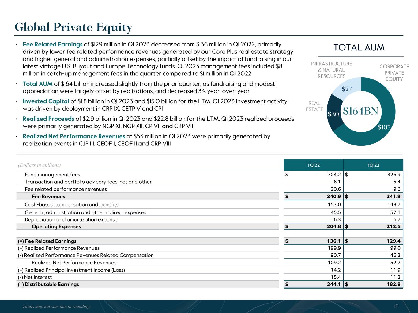 R-14 7 G-19 5 B-19 7 R-88 G-15 9 B-16 5 R-13 6 G-18 0 B-83 R-16 3 G-14 3 B-18 7 R-0 G-74 B-13 6 R-18 5 G-21 1 B-15 3 R-11 8 G-92 B-15 0 R-22 0 G-22 1 B-23 2 R-14 0 G-14 1 B-15 2R-12 0 G-16 9 B-22 2 Old Colors R-88 G-89 B-91 58595B R-23 G-234 B-234 EAEAEA R-208 G-232 B-247 D0E8F7 R-65 G-64 B-66 414042 R-8 G-51 B-94 08335E R-167 G-169 B-171 A7A9AB R-9 G-102 B-112 096670 R-220 G-221 B-222 DCDDDE R-97 G-161 B-224 61A1E0 R-237 G-217 B-157 EDD99D R-147 G-195 B-197 93C3C5 Global Private Equity $107 $30 $27 $164BN (Dollars in millions) 1Q'22 1Q'23 Fund management fees $ 304.2 $ 326.9 Transaction and portfolio advisory fees, net and other 6.1 5.4 Fee related performance revenues 30.6 9.6 Fee Revenues $ 340.9 $ 341.9 Cash-based compensation and benefits 153.0 148.7 General, administration and other indirect expenses 45.5 57.1 Depreciation and amortization expense 6.3 6.7 Operating Expenses $ 204.8 $ 212.5 (=) Fee Related Earnings $ 136.1 $ 129.4 (+) Realized Performance Revenues 199.9 99.0 (-) Realized Performance Revenues Related Compensation 90.7 46.3 Realized Net Performance Revenues 109.2 52.7 (+) Realized Principal Investment Income (Loss) 14.2 11.9 (-) Net Interest 15.4 11.2 (=) Distributable Earnings $ 244.1 $ 182.8 CORPORATE PRIVATE EQUITY REAL ESTATE INFRASTRUCTURE & NATURAL RESOURCES 17 TOTAL AUM Totals may not sum due to rounding. • Fee Related Earnings of $129 million in Q1 2023 decreased from $136 million in Q1 2022, primarily driven by lower fee related performance revenues generated by our Core Plus real estate strategy and higher general and administration expenses, partially offset by the impact of fundraising in our latest vintage U.S. Buyout and Europe Technology funds. Q1 2023 management fees included $8 million in catch-up management fees in the quarter compared to $1 million in Q1 2022 • Total AUM of $164 billion increased slightly from the prior quarter, as fundraising and modest appreciation were largely offset by realizations, and decreased 3% year-over-year • Invested Capital of $1.8 billion in Q1 2023 and $15.0 billion for the LTM. Q1 2023 investment activity was driven by deployment in CRP IX, CETP V and CPI • Realized Proceeds of $2.9 billion in Q1 2023 and $22.8 billion for the LTM. Q1 2023 realized proceeds were primarily generated by NGP XI, NGP XII, CP VII and CRP VIII • Realized Net Performance Revenues of $53 million in Q1 2023 were primarily generated by realization events in CJP III, CEOF I, CEOF II and CRP VIII
