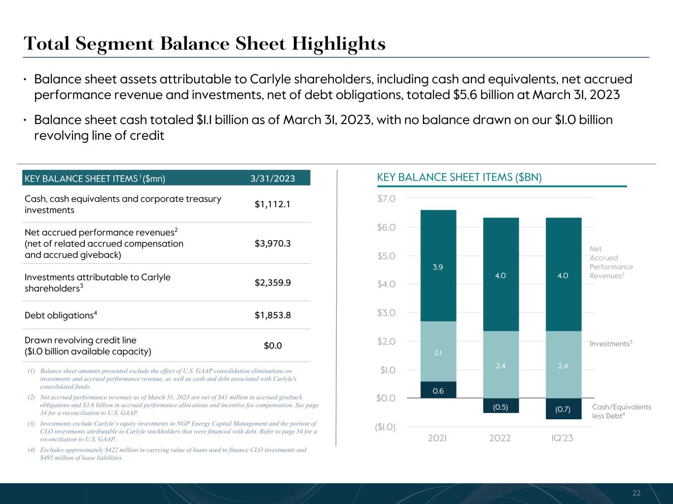 R-14 7 G-19 5 B-19 7 R-88 G-15 9 B-16 5 R-13 6 G-18 0 B-83 R-16 3 G-14 3 B-18 7 R-0 G-74 B-13 6 R-18 5 G-21 1 B-15 3 R-11 8 G-92 B-15 0 R-22 0 G-22 1 B-23 2 R-14 0 G-14 1 B-15 2R-12 0 G-16 9 B-22 2 Old Colors R-88 G-89 B-91 58595B R-23 G-234 B-234 EAEAEA R-208 G-232 B-247 D0E8F7 R-65 G-64 B-66 414042 R-8 G-51 B-94 08335E R-167 G-169 B-171 A7A9AB R-9 G-102 B-112 096670 R-220 G-221 B-222 DCDDDE R-97 G-161 B-224 61A1E0 R-237 G-217 B-157 EDD99D R-147 G-195 B-197 93C3C5 Total Segment Balance Sheet Highlights • Balance sheet assets attributable to Carlyle shareholders, including cash and equivalents, net accrued performance revenue and investments, net of debt obligations, totaled $5.6 billion at March 31, 2023 • Balance sheet cash totaled $1.1 billion as of March 31, 2023, with no balance drawn on our $1.0 billion revolving line of credit KEY BALANCE SHEET ITEMS 1 ($mn) 3/31/2023 Cash, cash equivalents and corporate treasury investments $1,112.1 Net accrued performance revenues2 (net of related accrued compensation and accrued giveback) $3,970.3 Investments attributable to Carlyle shareholders3 $2,359.9 Debt obligations4 $1,853.8 Drawn revolving credit line ($1.0 billion available capacity) $0.0 (1) Balance sheet amounts presented exclude the effect of U.S. GAAP consolidation eliminations on investments and accrued performance revenue, as well as cash and debt associated with Carlyle's consolidated funds. (2) Net accrued performance revenues as of March 31, 2023 are net of $41 million in accrued giveback obligations and $3.6 billion in accrued performance allocations and incentive fee compensation. See page 34 for a reconciliation to U.S. GAAP. (3) Investments exclude Carlyle’s equity investments in NGP Energy Capital Management and the portion of CLO investments attributable to Carlyle stockholders that were financed with debt. Refer to page 34 for a reconciliation to U.S. GAAP. (4) Excludes approximately $422 million in carrying value of loans used to finance CLO investments and $495 million of lease liabilities. 0.6 (0.5) (0.7) 2.1 2.4 2.4 3.9 4.0 4.0 2021 2022 1Q'23 ($1.0) $0.0 $1.0 $2.0 $3.0 $4.0 $5.0 $6.0 $7.0 KEY BALANCE SHEET ITEMS ($BN) Net Accrued Performance Revenues2 Investments3 Cash/Equivalents less Debt4 22
