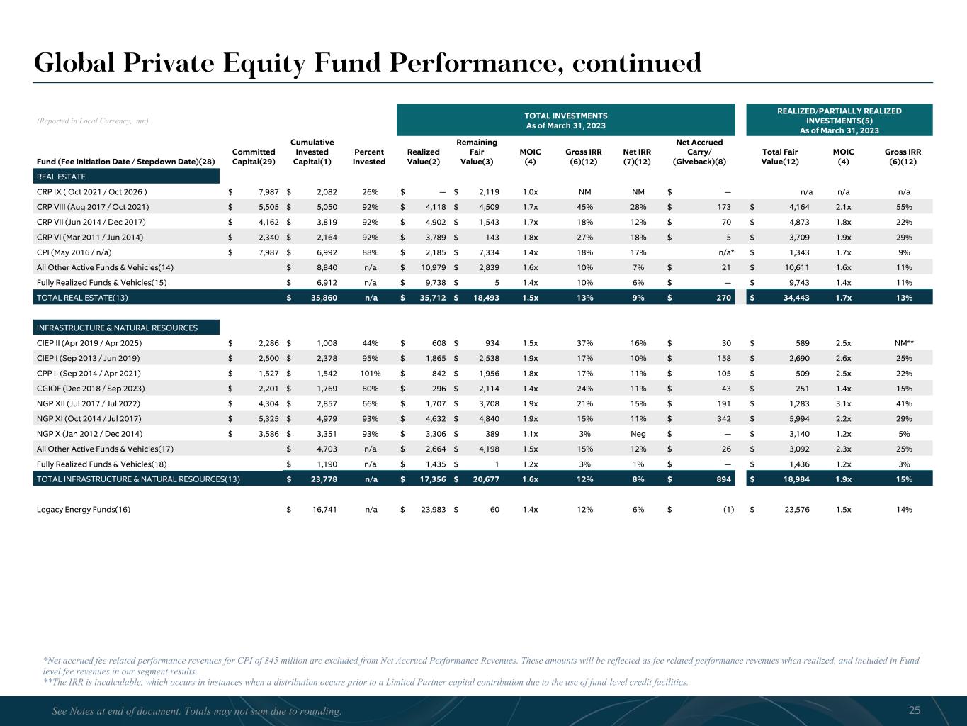 R-14 7 G-19 5 B-19 7 R-88 G-15 9 B-16 5 R-13 6 G-18 0 B-83 R-16 3 G-14 3 B-18 7 R-0 G-74 B-13 6 R-18 5 G-21 1 B-15 3 R-11 8 G-92 B-15 0 R-22 0 G-22 1 B-23 2 R-14 0 G-14 1 B-15 2R-12 0 G-16 9 B-22 2 Old Colors R-88 G-89 B-91 58595B R-23 G-234 B-234 EAEAEA R-208 G-232 B-247 D0E8F7 R-65 G-64 B-66 414042 R-8 G-51 B-94 08335E R-167 G-169 B-171 A7A9AB R-9 G-102 B-112 096670 R-220 G-221 B-222 DCDDDE R-97 G-161 B-224 61A1E0 R-237 G-217 B-157 EDD99D R-147 G-195 B-197 93C3C5 Global Private Equity Fund Performance, continued (Reported in Local Currency, mn) TOTAL INVESTMENTS As of March 31, 2023 REALIZED/PARTIALLY REALIZED INVESTMENTS(5) As of March 31, 2023 Fund (Fee Initiation Date / Stepdown Date)(28) Committed Capital(29) Cumulative Invested Capital(1) Percent Invested Realized Value(2) Remaining Fair Value(3) MOIC (4) Gross IRR (6)(12) Net IRR (7)(12) Net Accrued Carry/ (Giveback)(8) Total Fair Value(12) MOIC (4) Gross IRR (6)(12) REAL ESTATE CRP IX ( Oct 2021 / Oct 2026 ) $ 7,987 $ 2,082 26% $ — $ 2,119 1.0x NM NM $ — n/a n/a n/a CRP VIII (Aug 2017 / Oct 2021) $ 5,505 $ 5,050 92% $ 4,118 $ 4,509 1.7x 45% 28% $ 173 $ 4,164 2.1x 55% CRP VII (Jun 2014 / Dec 2017) $ 4,162 $ 3,819 92% $ 4,902 $ 1,543 1.7x 18% 12% $ 70 $ 4,873 1.8x 22% CRP VI (Mar 2011 / Jun 2014) $ 2,340 $ 2,164 92% $ 3,789 $ 143 1.8x 27% 18% $ 5 $ 3,709 1.9x 29% CPI (May 2016 / n/a) $ 7,987 $ 6,992 88% $ 2,185 $ 7,334 1.4x 18% 17% n/a* $ 1,343 1.7x 9% All Other Active Funds & Vehicles(14) $ 8,840 n/a $ 10,979 $ 2,839 1.6x 10% 7% $ 21 $ 10,611 1.6x 11% Fully Realized Funds & Vehicles(15) $ 6,912 n/a $ 9,738 $ 5 1.4x 10% 6% $ — $ 9,743 1.4x 11% TOTAL REAL ESTATE(13) $ 35,860 n/a $ 35,712 $ 18,493 1.5x 13% 9% $ 270 $ 34,443 1.7x 13% INFRASTRUCTURE & NATURAL RESOURCES CIEP II (Apr 2019 / Apr 2025) $ 2,286 $ 1,008 44% $ 608 $ 934 1.5x 37% 16% $ 30 $ 589 2.5x NM** CIEP I (Sep 2013 / Jun 2019) $ 2,500 $ 2,378 95% $ 1,865 $ 2,538 1.9x 17% 10% $ 158 $ 2,690 2.6x 25% CPP II (Sep 2014 / Apr 2021) $ 1,527 $ 1,542 101% $ 842 $ 1,956 1.8x 17% 11% $ 105 $ 509 2.5x 22% CGIOF (Dec 2018 / Sep 2023) $ 2,201 $ 1,769 80% $ 296 $ 2,114 1.4x 24% 11% $ 43 $ 251 1.4x 15% NGP XII (Jul 2017 / Jul 2022) $ 4,304 $ 2,857 66% $ 1,707 $ 3,708 1.9x 21% 15% $ 191 $ 1,283 3.1x 41% NGP XI (Oct 2014 / Jul 2017) $ 5,325 $ 4,979 93% $ 4,632 $ 4,840 1.9x 15% 11% $ 342 $ 5,994 2.2x 29% NGP X (Jan 2012 / Dec 2014) $ 3,586 $ 3,351 93% $ 3,306 $ 389 1.1x 3% Neg $ — $ 3,140 1.2x 5% All Other Active Funds & Vehicles(17) $ 4,703 n/a $ 2,664 $ 4,198 1.5x 15% 12% $ 26 $ 3,092 2.3x 25% Fully Realized Funds & Vehicles(18) $ 1,190 n/a $ 1,435 $ 1 1.2x 3% 1% $ — $ 1,436 1.2x 3% TOTAL INFRASTRUCTURE & NATURAL RESOURCES(13) $ 23,778 n/a $ 17,356 $ 20,677 1.6x 12% 8% $ 894 $ 18,984 1.9x 15% Legacy Energy Funds(16) $ 16,741 n/a $ 23,983 $ 60 1.4x 12% 6% $ (1) $ 23,576 1.5x 14% 25See Notes at end of document. Totals may not sum due to rounding. *Net accrued fee related performance revenues for CPI of $45 million are excluded from Net Accrued Performance Revenues. These amounts will be reflected as fee related performance revenues when realized, and included in Fund level fee revenues in our segment results. **The IRR is incalculable, which occurs in instances when a distribution occurs prior to a Limited Partner capital contribution due to the use of fund-level credit facilities.