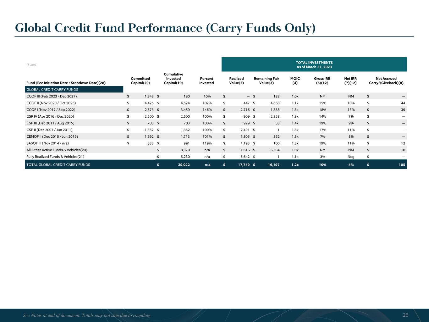 R-14 7 G-19 5 B-19 7 R-88 G-15 9 B-16 5 R-13 6 G-18 0 B-83 R-16 3 G-14 3 B-18 7 R-0 G-74 B-13 6 R-18 5 G-21 1 B-15 3 R-11 8 G-92 B-15 0 R-22 0 G-22 1 B-23 2 R-14 0 G-14 1 B-15 2R-12 0 G-16 9 B-22 2 Old Colors R-88 G-89 B-91 58595B R-23 G-234 B-234 EAEAEA R-208 G-232 B-247 D0E8F7 R-65 G-64 B-66 414042 R-8 G-51 B-94 08335E R-167 G-169 B-171 A7A9AB R-9 G-102 B-112 096670 R-220 G-221 B-222 DCDDDE R-97 G-161 B-224 61A1E0 R-237 G-217 B-157 EDD99D R-147 G-195 B-197 93C3C5 Global Credit Fund Performance (Carry Funds Only) ($ mn) TOTAL INVESTMENTS As of March 31, 2023 Fund (Fee Initiation Date / Stepdown Date)(28) Committed Capital(29) Cumulative Invested Capital(19) Percent Invested Realized Value(2) Remaining Fair Value(3) MOIC (4) Gross IRR (6)(12) Net IRR (7)(12) Net Accrued Carry/(Giveback)(8) GLOBAL CREDIT CARRY FUNDS CCOF III (Feb 2023 / Dec 2027) $ 1,843 $ 180 10% $ — $ 182 1.0x NM NM $ — CCOF II (Nov 2020 / Oct 2025) $ 4,425 $ 4,524 102% $ 447 $ 4,668 1.1x 15% 10% $ 44 CCOF I (Nov 2017 / Sep 2022) $ 2,373 $ 3,459 146% $ 2,716 $ 1,888 1.3x 18% 13% $ 39 CSP IV (Apr 2016 / Dec 2020) $ 2,500 $ 2,500 100% $ 909 $ 2,353 1.3x 14% 7% $ — CSP III (Dec 2011 / Aug 2015) $ 703 $ 703 100% $ 929 $ 58 1.4x 19% 9% $ — CSP II (Dec 2007 / Jun 2011) $ 1,352 $ 1,352 100% $ 2,491 $ 1 1.8x 17% 11% $ — CEMOF II (Dec 2015 / Jun 2019) $ 1,692 $ 1,713 101% $ 1,805 $ 362 1.3x 7% 3% $ — SASOF III (Nov 2014 / n/a) $ 833 $ 991 119% $ 1,193 $ 100 1.3x 19% 11% $ 12 All Other Active Funds & Vehicles(20) $ 8,370 n/a $ 1,616 $ 6,584 1.0x NM NM $ 10 Fully Realized Funds & Vehicles(21) $ 5,230 n/a $ 5,642 $ 1 1.1x 3% Neg $ — TOTAL GLOBAL CREDIT CARRY FUNDS $ 29,022 n/a $ 17,749 $ 16,197 1.2x 10% 4% $ 105 26See Notes at end of document. Totals may not sum due to rounding.