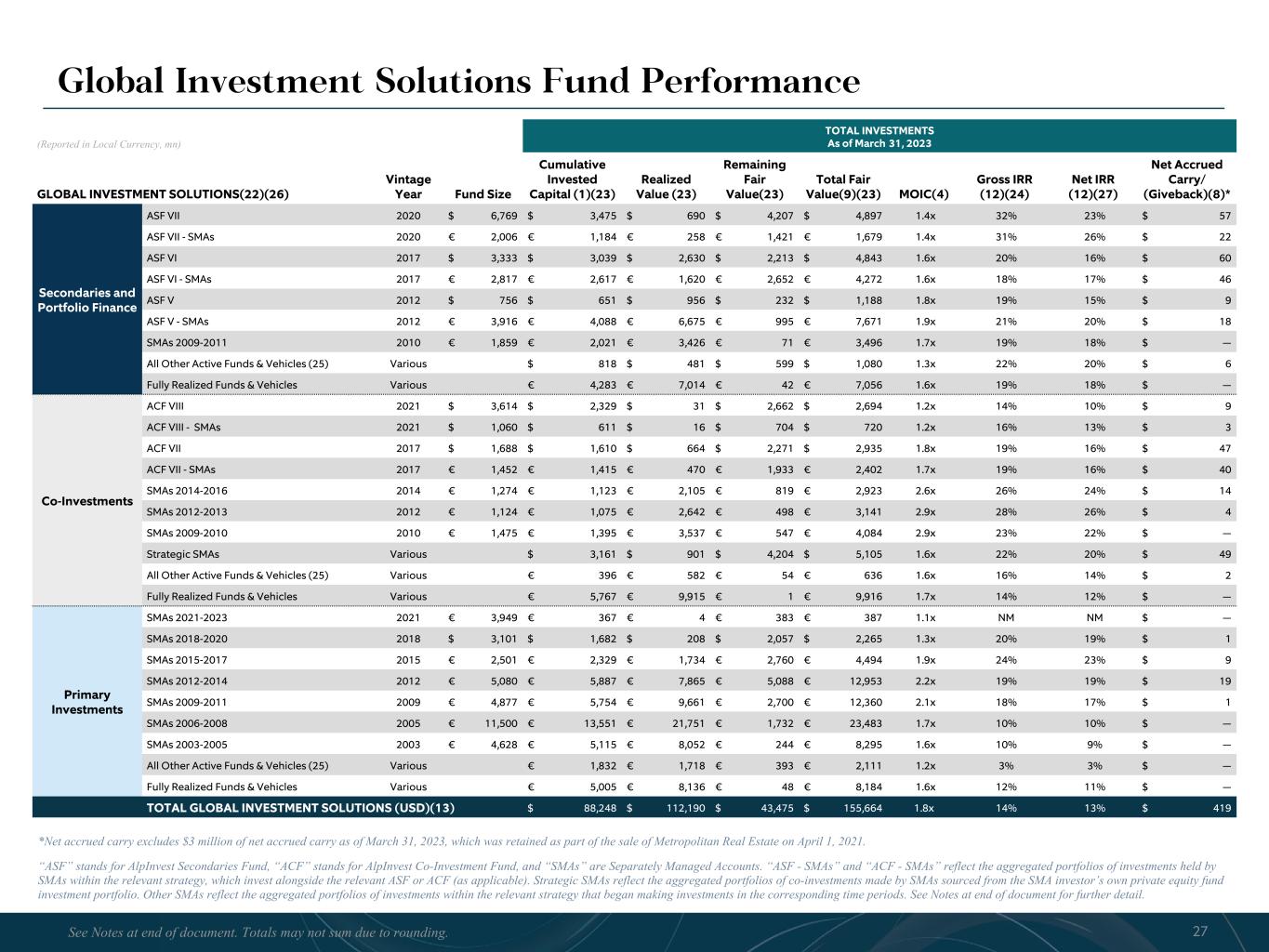 R-14 7 G-19 5 B-19 7 R-88 G-15 9 B-16 5 R-13 6 G-18 0 B-83 R-16 3 G-14 3 B-18 7 R-0 G-74 B-13 6 R-18 5 G-21 1 B-15 3 R-11 8 G-92 B-15 0 R-22 0 G-22 1 B-23 2 R-14 0 G-14 1 B-15 2R-12 0 G-16 9 B-22 2 Old Colors R-88 G-89 B-91 58595B R-23 G-234 B-234 EAEAEA R-208 G-232 B-247 D0E8F7 R-65 G-64 B-66 414042 R-8 G-51 B-94 08335E R-167 G-169 B-171 A7A9AB R-9 G-102 B-112 096670 R-220 G-221 B-222 DCDDDE R-97 G-161 B-224 61A1E0 R-237 G-217 B-157 EDD99D R-147 G-195 B-197 93C3C5 Global Investment Solutions Fund Performance (Reported in Local Currency, mn) TOTAL INVESTMENTS As of March 31, 2023 GLOBAL INVESTMENT SOLUTIONS(22)(26) Vintage Year Fund Size Cumulative Invested Capital (1)(23) Realized Value (23) Remaining Fair Value(23) Total Fair Value(9)(23) MOIC(4) Gross IRR (12)(24) Net IRR (12)(27) Net Accrued Carry/ (Giveback)(8)* Secondaries and Portfolio Finance ASF VII 2020 $ 6,769 $ 3,475 $ 690 $ 4,207 $ 4,897 1.4x 32% 23% $ 57 ASF VII - SMAs 2020 € 2,006 € 1,184 € 258 € 1,421 € 1,679 1.4x 31% 26% $ 22 ASF VI 2017 $ 3,333 $ 3,039 $ 2,630 $ 2,213 $ 4,843 1.6x 20% 16% $ 60 ASF VI - SMAs 2017 € 2,817 € 2,617 € 1,620 € 2,652 € 4,272 1.6x 18% 17% $ 46 ASF V 2012 $ 756 $ 651 $ 956 $ 232 $ 1,188 1.8x 19% 15% $ 9 ASF V - SMAs 2012 € 3,916 € 4,088 € 6,675 € 995 € 7,671 1.9x 21% 20% $ 18 SMAs 2009-2011 2010 € 1,859 € 2,021 € 3,426 € 71 € 3,496 1.7x 19% 18% $ — All Other Active Funds & Vehicles (25) Various $ 818 $ 481 $ 599 $ 1,080 1.3x 22% 20% $ 6 Fully Realized Funds & Vehicles Various € 4,283 € 7,014 € 42 € 7,056 1.6x 19% 18% $ — Co-Investments ACF VIII 2021 $ 3,614 $ 2,329 $ 31 $ 2,662 $ 2,694 1.2x 14% 10% $ 9 ACF VIII - SMAs 2021 $ 1,060 $ 611 $ 16 $ 704 $ 720 1.2x 16% 13% $ 3 ACF VII 2017 $ 1,688 $ 1,610 $ 664 $ 2,271 $ 2,935 1.8x 19% 16% $ 47 ACF VII - SMAs 2017 € 1,452 € 1,415 € 470 € 1,933 € 2,402 1.7x 19% 16% $ 40 SMAs 2014-2016 2014 € 1,274 € 1,123 € 2,105 € 819 € 2,923 2.6x 26% 24% $ 14 SMAs 2012-2013 2012 € 1,124 € 1,075 € 2,642 € 498 € 3,141 2.9x 28% 26% $ 4 SMAs 2009-2010 2010 € 1,475 € 1,395 € 3,537 € 547 € 4,084 2.9x 23% 22% $ — Strategic SMAs Various $ 3,161 $ 901 $ 4,204 $ 5,105 1.6x 22% 20% $ 49 All Other Active Funds & Vehicles (25) Various € 396 € 582 € 54 € 636 1.6x 16% 14% $ 2 Fully Realized Funds & Vehicles Various € 5,767 € 9,915 € 1 € 9,916 1.7x 14% 12% $ — Primary Investments SMAs 2021-2023 2021 € 3,949 € 367 € 4 € 383 € 387 1.1x NM NM $ — SMAs 2018-2020 2018 $ 3,101 $ 1,682 $ 208 $ 2,057 $ 2,265 1.3x 20% 19% $ 1 SMAs 2015-2017 2015 € 2,501 € 2,329 € 1,734 € 2,760 € 4,494 1.9x 24% 23% $ 9 SMAs 2012-2014 2012 € 5,080 € 5,887 € 7,865 € 5,088 € 12,953 2.2x 19% 19% $ 19 SMAs 2009-2011 2009 € 4,877 € 5,754 € 9,661 € 2,700 € 12,360 2.1x 18% 17% $ 1 SMAs 2006-2008 2005 € 11,500 € 13,551 € 21,751 € 1,732 € 23,483 1.7x 10% 10% $ — SMAs 2003-2005 2003 € 4,628 € 5,115 € 8,052 € 244 € 8,295 1.6x 10% 9% $ — All Other Active Funds & Vehicles (25) Various € 1,832 € 1,718 € 393 € 2,111 1.2x 3% 3% $ — Fully Realized Funds & Vehicles Various € 5,005 € 8,136 € 48 € 8,184 1.6x 12% 11% $ — TOTAL GLOBAL INVESTMENT SOLUTIONS (USD)(13) $ 88,248 $ 112,190 $ 43,475 $ 155,664 1.8x 14% 13% $ 419 27See Notes at end of document. Totals may not sum due to rounding. *Net accrued carry excludes $3 million of net accrued carry as of March 31, 2023, which was retained as part of the sale of Metropolitan Real Estate on April 1, 2021. “ASF” stands for AlpInvest Secondaries Fund, “ACF” stands for AlpInvest Co-Investment Fund, and “SMAs” are Separately Managed Accounts. “ASF - SMAs” and “ACF - SMAs” reflect the aggregated portfolios of investments held by SMAs within the relevant strategy, which invest alongside the relevant ASF or ACF (as applicable). Strategic SMAs reflect the aggregated portfolios of co-investments made by SMAs sourced from the SMA investor’s own private equity fund investment portfolio. Other SMAs reflect the aggregated portfolios of investments within the relevant strategy that began making investments in the corresponding time periods. See Notes at end of document for further detail.