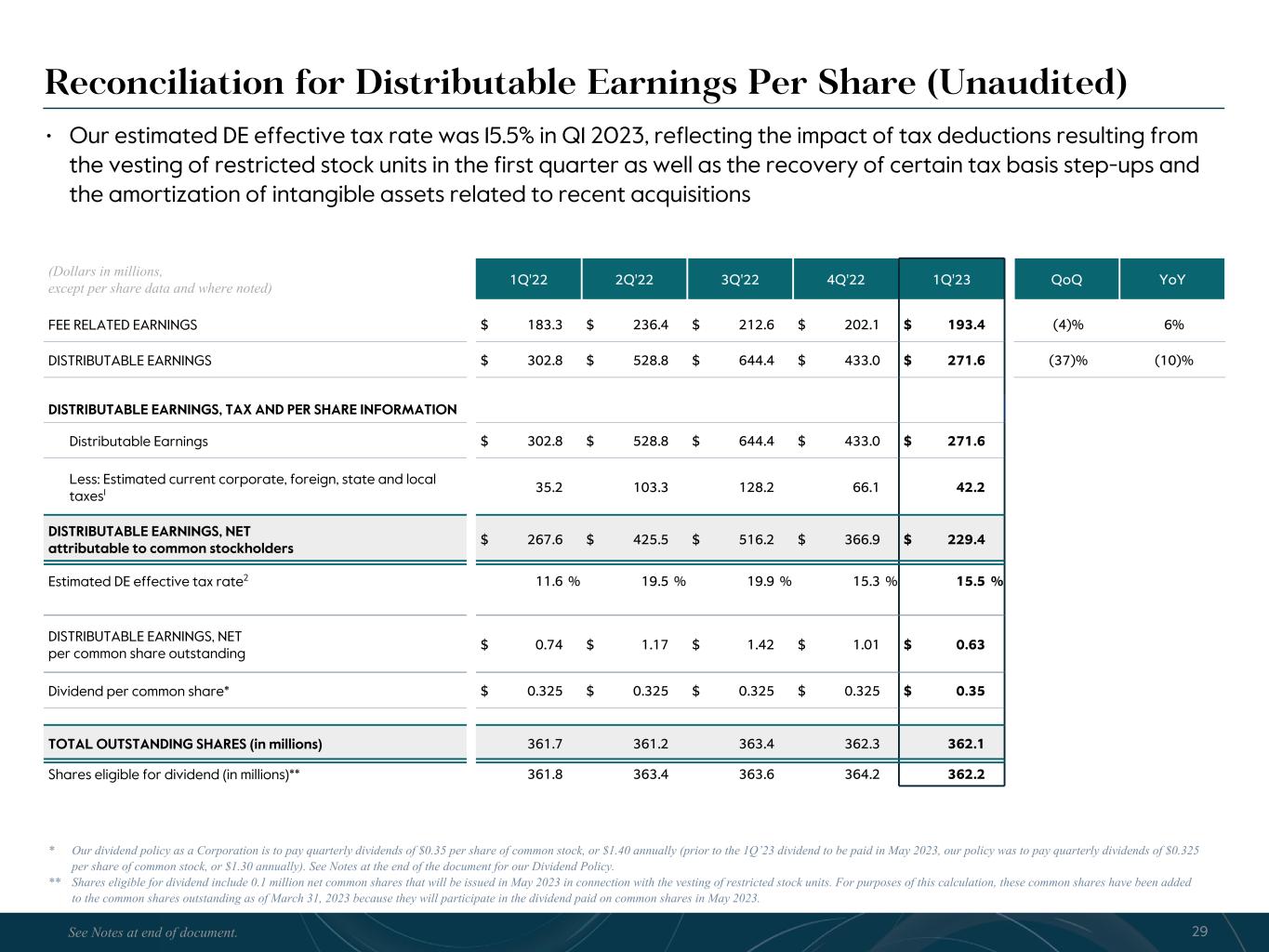 R-14 7 G-19 5 B-19 7 R-88 G-15 9 B-16 5 R-13 6 G-18 0 B-83 R-16 3 G-14 3 B-18 7 R-0 G-74 B-13 6 R-18 5 G-21 1 B-15 3 R-11 8 G-92 B-15 0 R-22 0 G-22 1 B-23 2 R-14 0 G-14 1 B-15 2R-12 0 G-16 9 B-22 2 Old Colors R-88 G-89 B-91 58595B R-23 G-234 B-234 EAEAEA R-208 G-232 B-247 D0E8F7 R-65 G-64 B-66 414042 R-8 G-51 B-94 08335E R-167 G-169 B-171 A7A9AB R-9 G-102 B-112 096670 R-220 G-221 B-222 DCDDDE R-97 G-161 B-224 61A1E0 R-237 G-217 B-157 EDD99D R-147 G-195 B-197 93C3C5 Reconciliation for Distributable Earnings Per Share (Unaudited) * Our dividend policy as a Corporation is to pay quarterly dividends of $0.35 per share of common stock, or $1.40 annually (prior to the 1Q’23 dividend to be paid in May 2023, our policy was to pay quarterly dividends of $0.325 per share of common stock, or $1.30 annually). See Notes at the end of the document for our Dividend Policy. ** Shares eligible for dividend include 0.1 million net common shares that will be issued in May 2023 in connection with the vesting of restricted stock units. For purposes of this calculation, these common shares have been added to the common shares outstanding as of March 31, 2023 because they will participate in the dividend paid on common shares in May 2023. (Dollars in millions, except per share data and where noted) 1Q'22 2Q'22 3Q'22 4Q'22 1Q'23 QoQ YoY FEE RELATED EARNINGS $ 183.3 $ 236.4 $ 212.6 $ 202.1 $ 193.4 (4)% 6% DISTRIBUTABLE EARNINGS $ 302.8 $ 528.8 $ 644.4 $ 433.0 $ 271.6 (37)% (10)% DISTRIBUTABLE EARNINGS, TAX AND PER SHARE INFORMATION Distributable Earnings $ 302.8 $ 528.8 $ 644.4 $ 433.0 $ 271.6 Less: Estimated current corporate, foreign, state and local taxes1 35.2 103.3 128.2 66.1 42.2 DISTRIBUTABLE EARNINGS, NET attributable to common stockholders $ 267.6 $ 425.5 $ 516.2 $ 366.9 $ 229.4 Estimated DE effective tax rate2 11.6 % 19.5 % 19.9 % 15.3 % 15.5 % DISTRIBUTABLE EARNINGS, NET per common share outstanding $ 0.74 $ 1.17 $ 1.42 $ 1.01 $ 0.63 Dividend per common share* $ 0.325 $ 0.325 $ 0.325 $ 0.325 $ 0.35 TOTAL OUTSTANDING SHARES (in millions) 361.7 361.2 363.4 362.3 362.1 Shares eligible for dividend (in millions)** 361.8 363.4 363.6 364.2 362.2 29See Notes at end of document. • Our estimated DE effective tax rate was 15.5% in Q1 2023, reflecting the impact of tax deductions resulting from the vesting of restricted stock units in the first quarter as well as the recovery of certain tax basis step-ups and the amortization of intangible assets related to recent acquisitions
