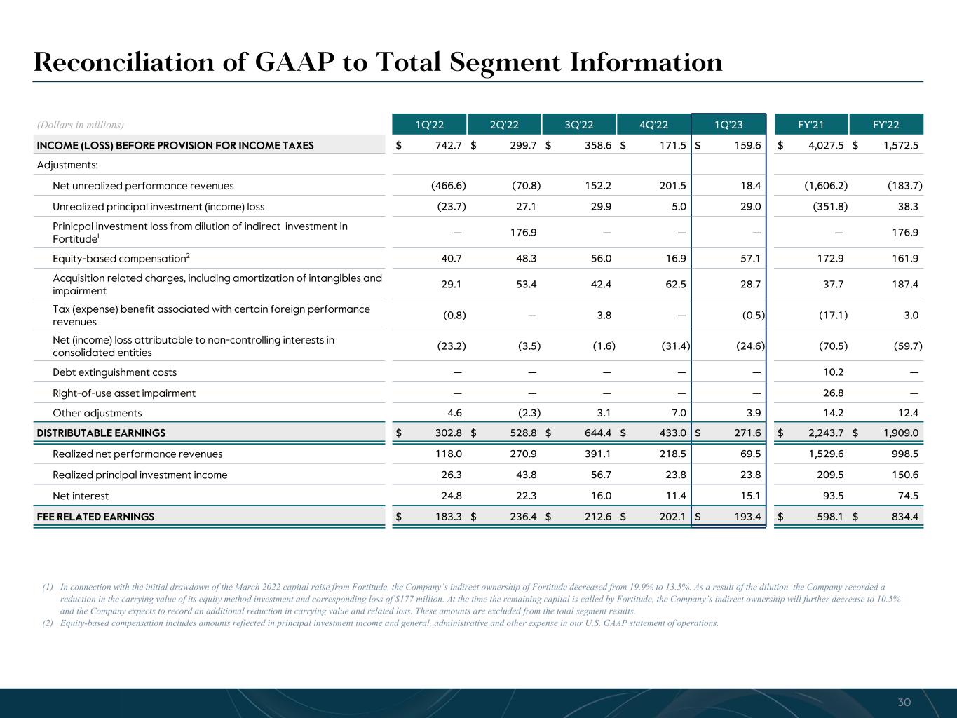 R-14 7 G-19 5 B-19 7 R-88 G-15 9 B-16 5 R-13 6 G-18 0 B-83 R-16 3 G-14 3 B-18 7 R-0 G-74 B-13 6 R-18 5 G-21 1 B-15 3 R-11 8 G-92 B-15 0 R-22 0 G-22 1 B-23 2 R-14 0 G-14 1 B-15 2R-12 0 G-16 9 B-22 2 Old Colors R-88 G-89 B-91 58595B R-23 G-234 B-234 EAEAEA R-208 G-232 B-247 D0E8F7 R-65 G-64 B-66 414042 R-8 G-51 B-94 08335E R-167 G-169 B-171 A7A9AB R-9 G-102 B-112 096670 R-220 G-221 B-222 DCDDDE R-97 G-161 B-224 61A1E0 R-237 G-217 B-157 EDD99D R-147 G-195 B-197 93C3C5 Reconciliation of GAAP to Total Segment Information (1) In connection with the initial drawdown of the March 2022 capital raise from Fortitude, the Company’s indirect ownership of Fortitude decreased from 19.9% to 13.5%. As a result of the dilution, the Company recorded a reduction in the carrying value of its equity method investment and corresponding loss of $177 million. At the time the remaining capital is called by Fortitude, the Company’s indirect ownership will further decrease to 10.5% and the Company expects to record an additional reduction in carrying value and related loss. These amounts are excluded from the total segment results. (2) Equity-based compensation includes amounts reflected in principal investment income and general, administrative and other expense in our U.S. GAAP statement of operations. (Dollars in millions) 1Q'22 2Q'22 3Q'22 4Q'22 1Q'23 FY'21 FY'22 INCOME (LOSS) BEFORE PROVISION FOR INCOME TAXES $ 742.7 $ 299.7 $ 358.6 $ 171.5 $ 159.6 $ 4,027.5 $ 1,572.5 Adjustments: Net unrealized performance revenues (466.6) (70.8) 152.2 201.5 18.4 (1,606.2) (183.7) Unrealized principal investment (income) loss (23.7) 27.1 29.9 5.0 29.0 (351.8) 38.3 Prinicpal investment loss from dilution of indirect investment in Fortitude1 — 176.9 — — — — 176.9 Equity-based compensation2 40.7 48.3 56.0 16.9 57.1 172.9 161.9 Acquisition related charges, including amortization of intangibles and impairment 29.1 53.4 42.4 62.5 28.7 37.7 187.4 Tax (expense) benefit associated with certain foreign performance revenues (0.8) — 3.8 — (0.5) (17.1) 3.0 Net (income) loss attributable to non-controlling interests in consolidated entities (23.2) (3.5) (1.6) (31.4) (24.6) (70.5) (59.7) Debt extinguishment costs — — — — — 10.2 — Right-of-use asset impairment — — — — — 26.8 — Other adjustments 4.6 (2.3) 3.1 7.0 3.9 14.2 12.4 DISTRIBUTABLE EARNINGS $ 302.8 $ 528.8 $ 644.4 $ 433.0 $ 271.6 $ 2,243.7 $ 1,909.0 Realized net performance revenues 118.0 270.9 391.1 218.5 69.5 1,529.6 998.5 Realized principal investment income 26.3 43.8 56.7 23.8 23.8 209.5 150.6 Net interest 24.8 22.3 16.0 11.4 15.1 93.5 74.5 FEE RELATED EARNINGS $ 183.3 $ 236.4 $ 212.6 $ 202.1 $ 193.4 $ 598.1 $ 834.4 30