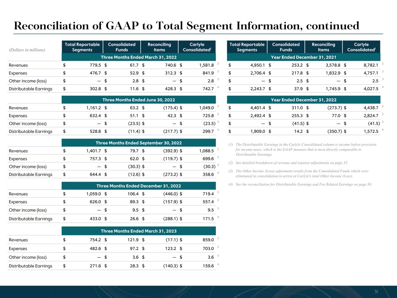 R-14 7 G-19 5 B-19 7 R-88 G-15 9 B-16 5 R-13 6 G-18 0 B-83 R-16 3 G-14 3 B-18 7 R-0 G-74 B-13 6 R-18 5 G-21 1 B-15 3 R-11 8 G-92 B-15 0 R-22 0 G-22 1 B-23 2 R-14 0 G-14 1 B-15 2R-12 0 G-16 9 B-22 2 Old Colors R-88 G-89 B-91 58595B R-23 G-234 B-234 EAEAEA R-208 G-232 B-247 D0E8F7 R-65 G-64 B-66 414042 R-8 G-51 B-94 08335E R-167 G-169 B-171 A7A9AB R-9 G-102 B-112 096670 R-220 G-221 B-222 DCDDDE R-97 G-161 B-224 61A1E0 R-237 G-217 B-157 EDD99D R-147 G-195 B-197 93C3C5 (Dollars in millions) Total Reportable Segments Consolidated Funds Reconciling Items Carlyle Consolidated1 Total Reportable Segments Consolidated Funds Reconciling Items Carlyle Consolidated1 Three Months Ended March 31, 2022 Year Ended December 31, 2021 Revenues $ 779.5 $ 61.7 $ 740.6 $ 1,581.8 2 $ 4,950.1 $ 253.2 $ 3,578.8 $ 8,782.1 2 Expenses $ 476.7 $ 52.9 $ 312.3 $ 841.9 2 $ 2,706.4 $ 217.8 $ 1,832.9 $ 4,757.1 2 Other income (loss) $ — $ 2.8 $ — $ 2.8 3 $ — $ 2.5 $ — $ 2.5 3 Distributable Earnings $ 302.8 $ 11.6 $ 428.3 $ 742.7 4 $ 2,243.7 $ 37.9 $ 1,745.9 $ 4,027.5 4 Three Months Ended June 30, 2022 Year Ended December 31, 2022 Revenues $ 1,161.2 $ 63.2 $ (175.4) $ 1,049.0 2 $ 4,401.4 $ 311.0 $ (273.7) $ 4,438.7 2 Expenses $ 632.4 $ 51.1 $ 42.3 $ 725.8 2 $ 2,492.4 $ 255.3 $ 77.0 $ 2,824.7 2 Other income (loss) $ — $ (23.5) $ — $ (23.5) 3 $ — $ (41.5) $ — $ (41.5) 3 Distributable Earnings $ 528.8 $ (11.4) $ (217.7) $ 299.7 4 $ 1,909.0 $ 14.2 $ (350.7) $ 1,572.5 4 Three Months Ended September 30, 2022 Revenues $ 1,401.7 $ 79.7 $ (392.9) $ 1,088.5 2 Expenses $ 757.3 $ 62.0 $ (119.7) $ 699.6 2 Other income (loss) $ — $ (30.3) $ — $ (30.3) 3 Distributable Earnings $ 644.4 $ (12.6) $ (273.2) $ 358.6 4 Three Months Ended December 31, 2022 Revenues $ 1,059.0 $ 106.4 $ (446.0) $ 719.4 2 Expenses $ 626.0 $ 89.3 $ (157.9) $ 557.4 2 Other income (loss) $ — $ 9.5 $ — $ 9.5 3 Distributable Earnings $ 433.0 $ 26.6 $ (288.1) $ 171.5 4 Three Months Ended March 31, 2023 Revenues $ 754.2 $ 121.9 $ (17.1) $ 859.0 2 Expenses $ 482.6 $ 97.2 $ 123.2 $ 703.0 2 Other income (loss) $ — $ 3.6 $ — $ 3.6 3 Distributable Earnings $ 271.6 $ 28.3 $ (140.3) $ 159.6 4 Reconciliation of GAAP to Total Segment Information, continued (1) The Distributable Earnings in the Carlyle Consolidated column is income before provision for income taxes, which is the GAAP measure that is most directly comparable to Distributable Earnings. (2) See detailed breakdown of revenue and expense adjustments on page 33. (3) The Other Income (Loss) adjustment results from the Consolidated Funds which were eliminated in consolidation to arrive at Carlyle's total Other Income (Loss). (4) See the reconciliation for Distributable Earnings and Fee Related Earnings on page 30. 31