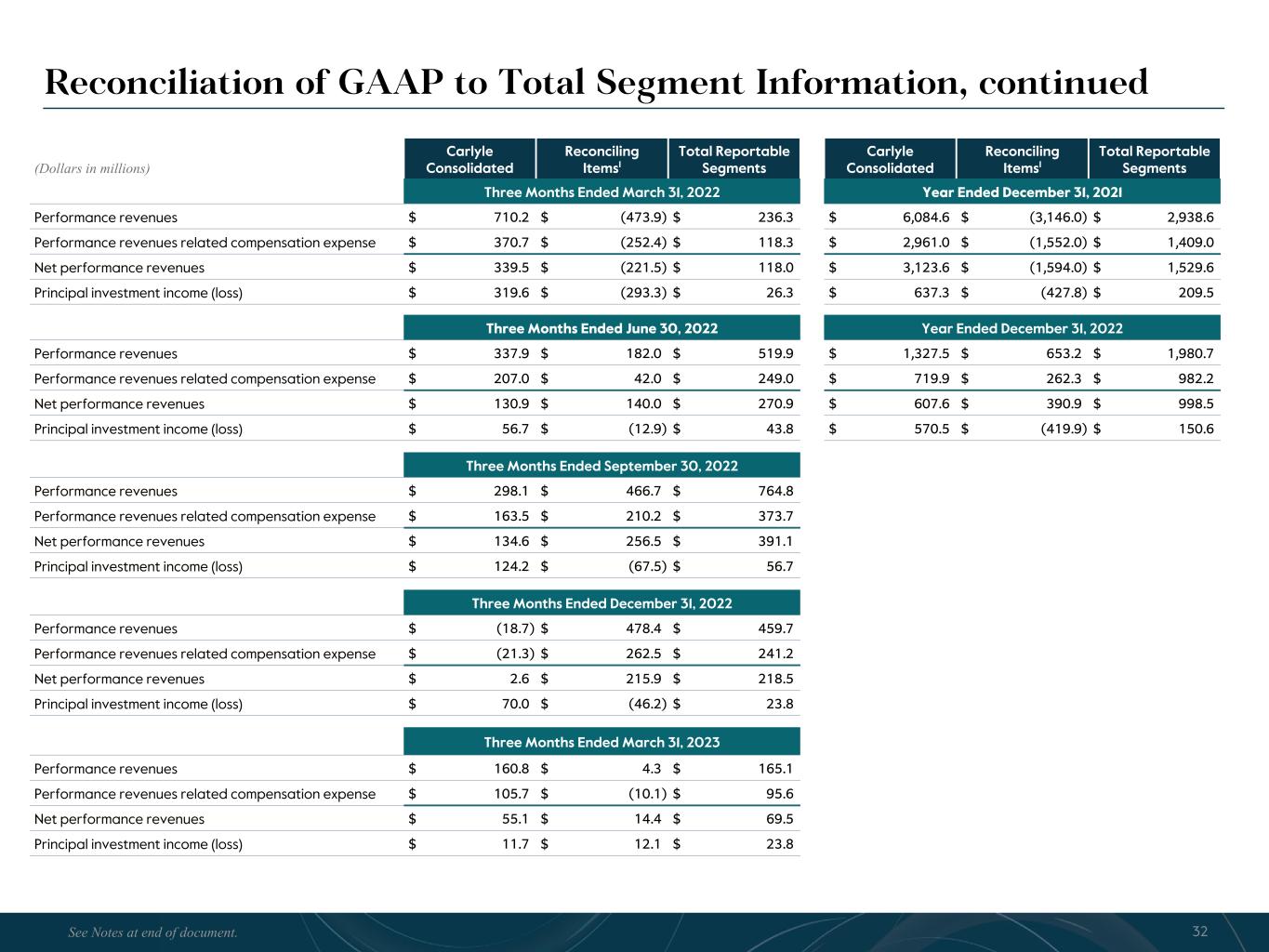 R-14 7 G-19 5 B-19 7 R-88 G-15 9 B-16 5 R-13 6 G-18 0 B-83 R-16 3 G-14 3 B-18 7 R-0 G-74 B-13 6 R-18 5 G-21 1 B-15 3 R-11 8 G-92 B-15 0 R-22 0 G-22 1 B-23 2 R-14 0 G-14 1 B-15 2R-12 0 G-16 9 B-22 2 Old Colors R-88 G-89 B-91 58595B R-23 G-234 B-234 EAEAEA R-208 G-232 B-247 D0E8F7 R-65 G-64 B-66 414042 R-8 G-51 B-94 08335E R-167 G-169 B-171 A7A9AB R-9 G-102 B-112 096670 R-220 G-221 B-222 DCDDDE R-97 G-161 B-224 61A1E0 R-237 G-217 B-157 EDD99D R-147 G-195 B-197 93C3C5 Reconciliation of GAAP to Total Segment Information, continued 32 (Dollars in millions) Carlyle Consolidated Reconciling Items1 Total Reportable Segments Carlyle Consolidated Reconciling Items1 Total Reportable Segments Three Months Ended March 31, 2022 Year Ended December 31, 2021 Performance revenues $ 710.2 $ (473.9) $ 236.3 $ 6,084.6 $ (3,146.0) $ 2,938.6 Performance revenues related compensation expense $ 370.7 $ (252.4) $ 118.3 $ 2,961.0 $ (1,552.0) $ 1,409.0 Net performance revenues $ 339.5 $ (221.5) $ 118.0 $ 3,123.6 $ (1,594.0) $ 1,529.6 Principal investment income (loss) $ 319.6 $ (293.3) $ 26.3 $ 637.3 $ (427.8) $ 209.5 Three Months Ended June 30, 2022 Year Ended December 31, 2022 Performance revenues $ 337.9 $ 182.0 $ 519.9 $ 1,327.5 $ 653.2 $ 1,980.7 Performance revenues related compensation expense $ 207.0 $ 42.0 $ 249.0 $ 719.9 $ 262.3 $ 982.2 Net performance revenues $ 130.9 $ 140.0 $ 270.9 $ 607.6 $ 390.9 $ 998.5 Principal investment income (loss) $ 56.7 $ (12.9) $ 43.8 $ 570.5 $ (419.9) $ 150.6 Three Months Ended September 30, 2022 Performance revenues $ 298.1 $ 466.7 $ 764.8 Performance revenues related compensation expense $ 163.5 $ 210.2 $ 373.7 Net performance revenues $ 134.6 $ 256.5 $ 391.1 Principal investment income (loss) $ 124.2 $ (67.5) $ 56.7 Three Months Ended December 31, 2022 Performance revenues $ (18.7) $ 478.4 $ 459.7 Performance revenues related compensation expense $ (21.3) $ 262.5 $ 241.2 Net performance revenues $ 2.6 $ 215.9 $ 218.5 Principal investment income (loss) $ 70.0 $ (46.2) $ 23.8 Three Months Ended March 31, 2023 Performance revenues $ 160.8 $ 4.3 $ 165.1 Performance revenues related compensation expense $ 105.7 $ (10.1) $ 95.6 Net performance revenues $ 55.1 $ 14.4 $ 69.5 Principal investment income (loss) $ 11.7 $ 12.1 $ 23.8 See Notes at end of document.