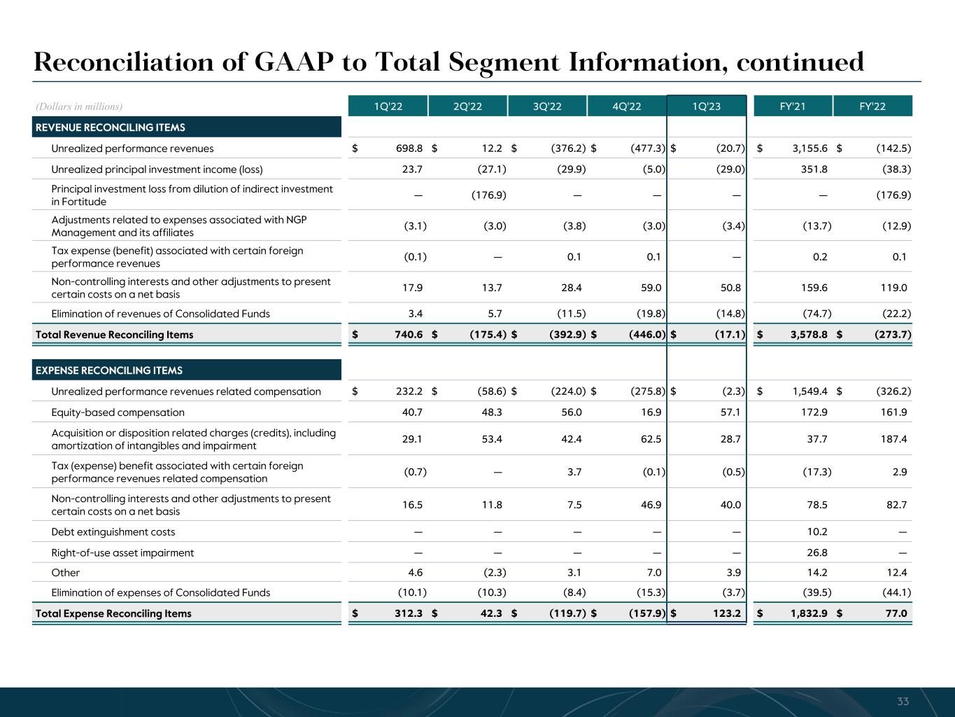 R-14 7 G-19 5 B-19 7 R-88 G-15 9 B-16 5 R-13 6 G-18 0 B-83 R-16 3 G-14 3 B-18 7 R-0 G-74 B-13 6 R-18 5 G-21 1 B-15 3 R-11 8 G-92 B-15 0 R-22 0 G-22 1 B-23 2 R-14 0 G-14 1 B-15 2R-12 0 G-16 9 B-22 2 Old Colors R-88 G-89 B-91 58595B R-23 G-234 B-234 EAEAEA R-208 G-232 B-247 D0E8F7 R-65 G-64 B-66 414042 R-8 G-51 B-94 08335E R-167 G-169 B-171 A7A9AB R-9 G-102 B-112 096670 R-220 G-221 B-222 DCDDDE R-97 G-161 B-224 61A1E0 R-237 G-217 B-157 EDD99D R-147 G-195 B-197 93C3C5 Reconciliation of GAAP to Total Segment Information, continued (Dollars in millions) 1Q'22 2Q'22 3Q'22 4Q'22 1Q'23 FY'21 FY'22 REVENUE RECONCILING ITEMS Unrealized performance revenues $ 698.8 $ 12.2 $ (376.2) $ (477.3) $ (20.7) $ 3,155.6 $ (142.5) Unrealized principal investment income (loss) 23.7 (27.1) (29.9) (5.0) (29.0) 351.8 (38.3) Principal investment loss from dilution of indirect investment in Fortitude — (176.9) — — — — (176.9) Adjustments related to expenses associated with NGP Management and its affiliates (3.1) (3.0) (3.8) (3.0) (3.4) (13.7) (12.9) Tax expense (benefit) associated with certain foreign performance revenues (0.1) — 0.1 0.1 — 0.2 0.1 Non-controlling interests and other adjustments to present certain costs on a net basis 17.9 13.7 28.4 59.0 50.8 159.6 119.0 Elimination of revenues of Consolidated Funds 3.4 5.7 (11.5) (19.8) (14.8) (74.7) (22.2) Total Revenue Reconciling Items $ 740.6 $ (175.4) $ (392.9) $ (446.0) $ (17.1) $ 3,578.8 $ (273.7) EXPENSE RECONCILING ITEMS Unrealized performance revenues related compensation $ 232.2 $ (58.6) $ (224.0) $ (275.8) $ (2.3) $ 1,549.4 $ (326.2) Equity-based compensation 40.7 48.3 56.0 16.9 57.1 172.9 161.9 Acquisition or disposition related charges (credits), including amortization of intangibles and impairment 29.1 53.4 42.4 62.5 28.7 37.7 187.4 Tax (expense) benefit associated with certain foreign performance revenues related compensation (0.7) — 3.7 (0.1) (0.5) (17.3) 2.9 Non-controlling interests and other adjustments to present certain costs on a net basis 16.5 11.8 7.5 46.9 40.0 78.5 82.7 Debt extinguishment costs — — — — — 10.2 — Right-of-use asset impairment — — — — — 26.8 — Other 4.6 (2.3) 3.1 7.0 3.9 14.2 12.4 Elimination of expenses of Consolidated Funds (10.1) (10.3) (8.4) (15.3) (3.7) (39.5) (44.1) Total Expense Reconciling Items $ 312.3 $ 42.3 $ (119.7) $ (157.9) $ 123.2 $ 1,832.9 $ 77.0 33