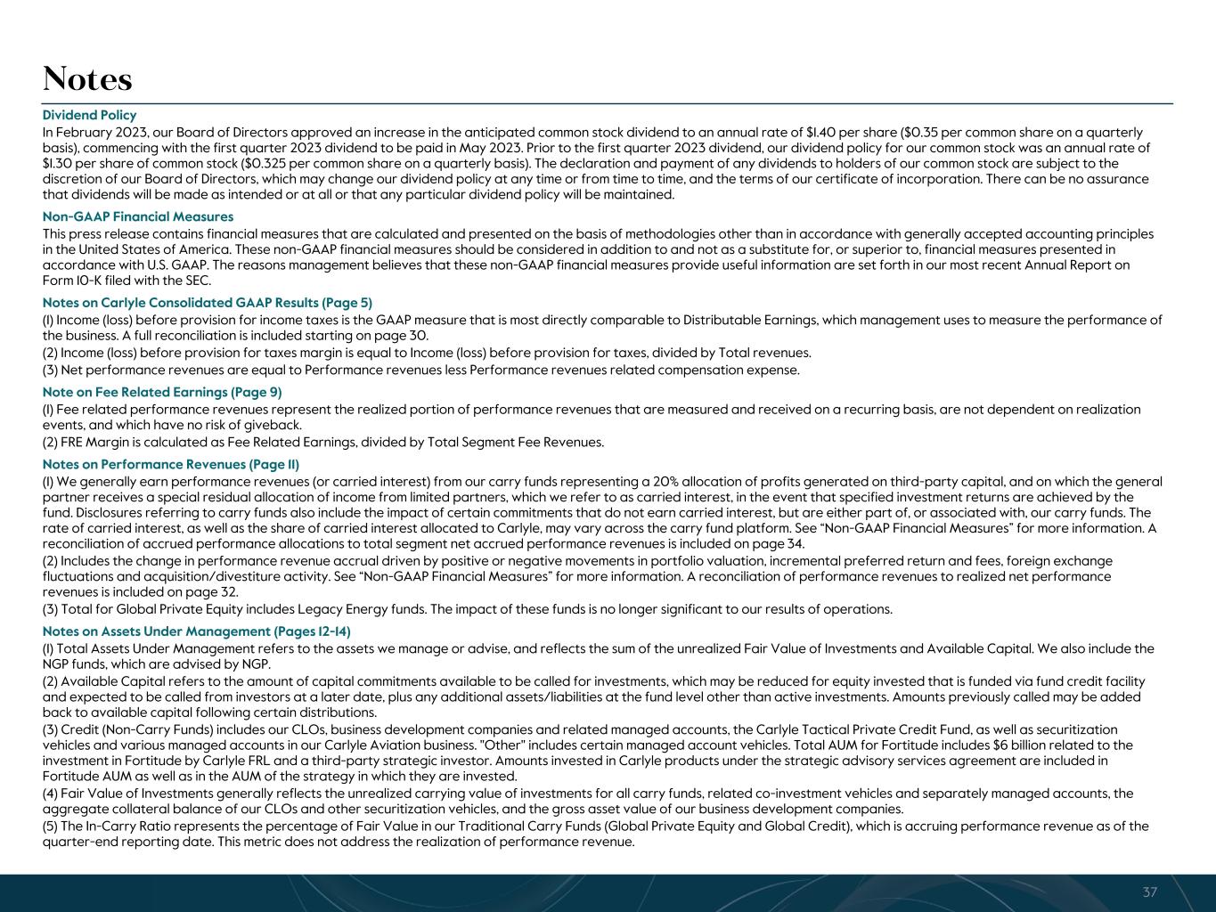 R-14 7 G-19 5 B-19 7 R-88 G-15 9 B-16 5 R-13 6 G-18 0 B-83 R-16 3 G-14 3 B-18 7 R-0 G-74 B-13 6 R-18 5 G-21 1 B-15 3 R-11 8 G-92 B-15 0 R-22 0 G-22 1 B-23 2 R-14 0 G-14 1 B-15 2R-12 0 G-16 9 B-22 2 Old Colors R-88 G-89 B-91 58595B R-23 G-234 B-234 EAEAEA R-208 G-232 B-247 D0E8F7 R-65 G-64 B-66 414042 R-8 G-51 B-94 08335E R-167 G-169 B-171 A7A9AB R-9 G-102 B-112 096670 R-220 G-221 B-222 DCDDDE R-97 G-161 B-224 61A1E0 R-237 G-217 B-157 EDD99D R-147 G-195 B-197 93C3C5 Notes Dividend Policy In February 2023, our Board of Directors approved an increase in the anticipated common stock dividend to an annual rate of $1.40 per share ($0.35 per common share on a quarterly basis), commencing with the first quarter 2023 dividend to be paid in May 2023. Prior to the first quarter 2023 dividend, our dividend policy for our common stock was an annual rate of $1.30 per share of common stock ($0.325 per common share on a quarterly basis). The declaration and payment of any dividends to holders of our common stock are subject to the discretion of our Board of Directors, which may change our dividend policy at any time or from time to time, and the terms of our certificate of incorporation. There can be no assurance that dividends will be made as intended or at all or that any particular dividend policy will be maintained. Non-GAAP Financial Measures This press release contains financial measures that are calculated and presented on the basis of methodologies other than in accordance with generally accepted accounting principles in the United States of America. These non-GAAP financial measures should be considered in addition to and not as a substitute for, or superior to, financial measures presented in accordance with U.S. GAAP. The reasons management believes that these non-GAAP financial measures provide useful information are set forth in our most recent Annual Report on Form 10-K filed with the SEC. Notes on Carlyle Consolidated GAAP Results (Page 5) (1) Income (loss) before provision for income taxes is the GAAP measure that is most directly comparable to Distributable Earnings, which management uses to measure the performance of the business. A full reconciliation is included starting on page 30. (2) Income (loss) before provision for taxes margin is equal to Income (loss) before provision for taxes, divided by Total revenues. (3) Net performance revenues are equal to Performance revenues less Performance revenues related compensation expense. Note on Fee Related Earnings (Page 9) (1) Fee related performance revenues represent the realized portion of performance revenues that are measured and received on a recurring basis, are not dependent on realization events, and which have no risk of giveback. (2) FRE Margin is calculated as Fee Related Earnings, divided by Total Segment Fee Revenues. Notes on Performance Revenues (Page 11) (1) We generally earn performance revenues (or carried interest) from our carry funds representing a 20% allocation of profits generated on third-party capital, and on which the general partner receives a special residual allocation of income from limited partners, which we refer to as carried interest, in the event that specified investment returns are achieved by the fund. Disclosures referring to carry funds also include the impact of certain commitments that do not earn carried interest, but are either part of, or associated with, our carry funds. The rate of carried interest, as well as the share of carried interest allocated to Carlyle, may vary across the carry fund platform. See “Non-GAAP Financial Measures” for more information. A reconciliation of accrued performance allocations to total segment net accrued performance revenues is included on page 34. (2) Includes the change in performance revenue accrual driven by positive or negative movements in portfolio valuation, incremental preferred return and fees, foreign exchange fluctuations and acquisition/divestiture activity. See “Non-GAAP Financial Measures” for more information. A reconciliation of performance revenues to realized net performance revenues is included on page 32. (3) Total for Global Private Equity includes Legacy Energy funds. The impact of these funds is no longer significant to our results of operations. Notes on Assets Under Management (Pages 12-14) (1) Total Assets Under Management refers to the assets we manage or advise, and reflects the sum of the unrealized Fair Value of Investments and Available Capital. We also include the NGP funds, which are advised by NGP. (2) Available Capital refers to the amount of capital commitments available to be called for investments, which may be reduced for equity invested that is funded via fund credit facility and expected to be called from investors at a later date, plus any additional assets/liabilities at the fund level other than active investments. Amounts previously called may be added back to available capital following certain distributions. (3) Credit (Non-Carry Funds) includes our CLOs, business development companies and related managed accounts, the Carlyle Tactical Private Credit Fund, as well as securitization vehicles and various managed accounts in our Carlyle Aviation business. "Other" includes certain managed account vehicles. Total AUM for Fortitude includes $6 billion related to the investment in Fortitude by Carlyle FRL and a third-party strategic investor. Amounts invested in Carlyle products under the strategic advisory services agreement are included in Fortitude AUM as well as in the AUM of the strategy in which they are invested. (4) Fair Value of Investments generally reflects the unrealized carrying value of investments for all carry funds, related co-investment vehicles and separately managed accounts, the aggregate collateral balance of our CLOs and other securitization vehicles, and the gross asset value of our business development companies. (5) The In-Carry Ratio represents the percentage of Fair Value in our Tradi