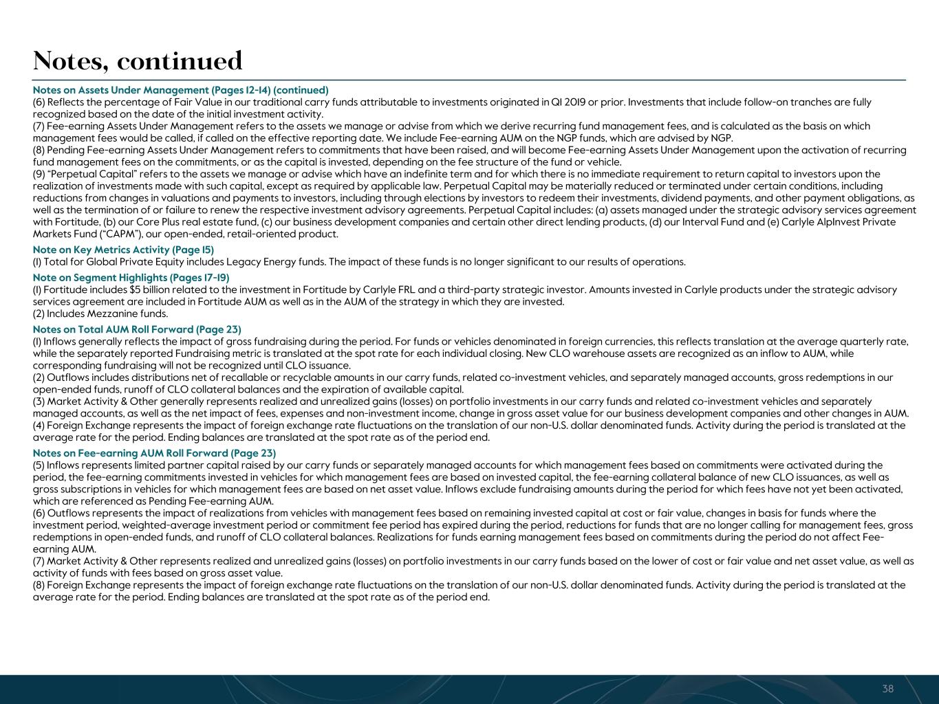 R-14 7 G-19 5 B-19 7 R-88 G-15 9 B-16 5 R-13 6 G-18 0 B-83 R-16 3 G-14 3 B-18 7 R-0 G-74 B-13 6 R-18 5 G-21 1 B-15 3 R-11 8 G-92 B-15 0 R-22 0 G-22 1 B-23 2 R-14 0 G-14 1 B-15 2R-12 0 G-16 9 B-22 2 Old Colors R-88 G-89 B-91 58595B R-23 G-234 B-234 EAEAEA R-208 G-232 B-247 D0E8F7 R-65 G-64 B-66 414042 R-8 G-51 B-94 08335E R-167 G-169 B-171 A7A9AB R-9 G-102 B-112 096670 R-220 G-221 B-222 DCDDDE R-97 G-161 B-224 61A1E0 R-237 G-217 B-157 EDD99D R-147 G-195 B-197 93C3C5 Notes, continued Notes on Assets Under Management (Pages 12-14) (continued) (6) Reflects the percentage of Fair Value in our traditional carry funds attributable to investments originated in Q1 2019 or prior. Investments that include follow-on tranches are fully recognized based on the date of the initial investment activity. (7) Fee-earning Assets Under Management refers to the assets we manage or advise from which we derive recurring fund management fees, and is calculated as the basis on which management fees would be called, if called on the effective reporting date. We include Fee-earning AUM on the NGP funds, which are advised by NGP. (8) Pending Fee-earning Assets Under Management refers to commitments that have been raised, and will become Fee-earning Assets Under Management upon the activation of recurring fund management fees on the commitments, or as the capital is invested, depending on the fee structure of the fund or vehicle. (9) “Perpetual Capital” refers to the assets we manage or advise which have an indefinite term and for which there is no immediate requirement to return capital to investors upon the realization of investments made with such capital, except as required by applicable law. Perpetual Capital may be materially reduced or terminated under certain conditions, including reductions from changes in valuations and payments to investors, including through elections by investors to redeem their investments, dividend payments, and other payment obligations, as well as the termination of or failure to renew the respective investment advisory agreements. Perpetual Capital includes: (a) assets managed under the strategic advisory services agreement with Fortitude, (b) our Core Plus real estate fund, (c) our business development companies and certain other direct lending products, (d) our Interval Fund and (e) Carlyle AlpInvest Private Markets Fund (“CAPM”), our open-ended, retail-oriented product. Note on Key Metrics Activity (Page 15) (1) Total for Global Private Equity includes Legacy Energy funds. The impact of these funds is no longer significant to our results of operations. Note on Segment Highlights (Pages 17-19) (1) Fortitude includes $5 billion related to the investment in Fortitude by Carlyle FRL and a third-party strategic investor. Amounts invested in Carlyle products under the strategic advisory services agreement are included in Fortitude AUM as well as in the AUM of the strategy in which they are invested. (2) Includes Mezzanine funds. Notes on Total AUM Roll Forward (Page 23) (1) Inflows generally reflects the impact of gross fundraising during the period. For funds or vehicles denominated in foreign currencies, this reflects translation at the average quarterly rate, while the separately reported Fundraising metric is translated at the spot rate for each individual closing. New CLO warehouse assets are recognized as an inflow to AUM, while corresponding fundraising will not be recognized until CLO issuance. (2) Outflows includes distributions net of recallable or recyclable amounts in our carry funds, related co-investment vehicles, and separately managed accounts, gross redemptions in our open-ended funds, runoff of CLO collateral balances and the expiration of available capital. (3) Market Activity & Other generally represents realized and unrealized gains (losses) on portfolio investments in our carry funds and related co-investment vehicles and separately managed accounts, as well as the net impact of fees, expenses and non-investment income, change in gross asset value for our business development companies and other changes in AUM. (4) Foreign Exchange represents the impact of foreign exchange rate fluctuations on the translation of our non-U.S. dollar denominated funds. Activity during the period is translated at the average rate for the period. Ending balances are translated at the spot rate as of the period end. Notes on Fee-earning AUM Roll Forward (Page 23) (5) Inflows represents limited partner capital raised by our carry funds or separately managed accounts for which management fees based on commitments were activated during the period, the fee-earning commitments invested in vehicles for which management fees are based on invested capital, the fee-earning collateral balance of new CLO issuances, as well as gross subscriptions in vehicles for which management fees are based on net asset value. Inflows exclude fundraising amounts during the period for which fees have not yet been activated, which are referenced as Pending Fee-earning AUM. (6) Outflows represents the impact of realizations from vehicles with management fees based on remaining invested capital at cost or fair value, changes in basis for funds where the investment period, weighted-average investment period or commitment fee period has expired during the period, reductions for funds that are no longer calling for management fees, gross redemptions in open-ended funds, and runoff of CLO collateral balances. Realizations for funds earning management fees based on commitments during the period do not affect Fee- earning AUM. (7) Market Activity & Other represents realized and unrealized gains (losses) on portfolio investments in our carry funds based on the lower of cost or fair value and net asset value, as well as activity of funds with fees based on gross asset value. (8) Foreign Exchange represents the impact of foreign exchange rate fluctuations on the translation of our non-U.S. dollar denominated funds. 