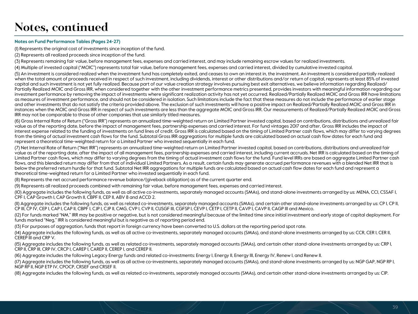 R-14 7 G-19 5 B-19 7 R-88 G-15 9 B-16 5 R-13 6 G-18 0 B-83 R-16 3 G-14 3 B-18 7 R-0 G-74 B-13 6 R-18 5 G-21 1 B-15 3 R-11 8 G-92 B-15 0 R-22 0 G-22 1 B-23 2 R-14 0 G-14 1 B-15 2R-12 0 G-16 9 B-22 2 Old Colors R-88 G-89 B-91 58595B R-23 G-234 B-234 EAEAEA R-208 G-232 B-247 D0E8F7 R-65 G-64 B-66 414042 R-8 G-51 B-94 08335E R-167 G-169 B-171 A7A9AB R-9 G-102 B-112 096670 R-220 G-221 B-222 DCDDDE R-97 G-161 B-224 61A1E0 R-237 G-217 B-157 EDD99D R-147 G-195 B-197 93C3C5 Notes, continued Notes on Fund Performance Tables (Pages 24-27) (1) Represents the original cost of investments since inception of the fund. (2) Represents all realized proceeds since inception of the fund. (3) Represents remaining fair value, before management fees, expenses and carried interest, and may include remaining escrow values for realized investments. (4) Multiple of invested capital (“MOIC”) represents total fair value, before management fees, expenses and carried interest, divided by cumulative invested capital. (5) An investment is considered realized when the investment fund has completely exited, and ceases to own an interest in, the investment. An investment is considered partially realized when the total amount of proceeds received in respect of such investment, including dividends, interest or other distributions and/or return of capital, represents at least 85% of invested capital and such investment is not yet fully realized. Because part of our value creation strategy involves pursuing best exit alternatives, we believe information regarding Realized/ Partially Realized MOIC and Gross IRR, when considered together with the other investment performance metrics presented, provides investors with meaningful information regarding our investment performance by removing the impact of investments where significant realization activity has not yet occurred. Realized/Partially Realized MOIC and Gross IRR have limitations as measures of investment performance, and should not be considered in isolation. Such limitations include the fact that these measures do not include the performance of earlier stage and other investments that do not satisfy the criteria provided above. The exclusion of such investments will have a positive impact on Realized/Partially Realized MOIC and Gross IRR in instances when the MOIC and Gross IRR in respect of such investments are less than the aggregate MOIC and Gross IRR. Our measurements of Realized/Partially Realized MOIC and Gross IRR may not be comparable to those of other companies that use similarly titled measures. (6) Gross Internal Rate of Return (“Gross IRR”) represents an annualized time-weighted return on Limited Partner invested capital, based on contributions, distributions and unrealized fair value as of the reporting date, before the impact of management fees, partnership expenses and carried interest. For fund vintages 2017 and after, Gross IRR includes the impact of interest expense related to the funding of investments on fund lines of credit. Gross IRR is calculated based on the timing of Limited Partner cash flows, which may differ to varying degrees from the timing of actual investment cash flows for the fund. Subtotal Gross IRR aggregations for multiple funds are calculated based on actual cash flow dates for each fund and represent a theoretical time-weighted return for a Limited Partner who invested sequentially in each fund. (7) Net Internal Rate of Return (“Net IRR”) represents an annualized time-weighted return on Limited Partner invested capital, based on contributions, distributions and unrealized fair value as of the reporting date, after the impact of all management fees, partnership expenses and carried interest, including current accruals. Net IRR is calculated based on the timing of Limited Partner cash flows, which may differ to varying degrees from the timing of actual investment cash flows for the fund. Fund level IRRs are based on aggregate Limited Partner cash flows, and this blended return may differ from that of individual Limited Partners. As a result, certain funds may generate accrued performance revenues with a blended Net IRR that is below the preferred return hurdle for that fund. Subtotal Net IRR aggregations for multiple funds are calculated based on actual cash flow dates for each fund and represent a theoretical time-weighted return for a Limited Partner who invested sequentially in each fund. (8) Represents the net accrued performance revenue balance/(giveback obligation) as of the current quarter end. (9) Represents all realized proceeds combined with remaining fair value, before management fees, expenses and carried interest. (10) Aggregate includes the following funds, as well as all active co-investments, separately managed accounts (SMAs), and stand-alone investments arranged by us: MENA, CCI, CSSAF I, CPF I, CAP Growth I, CAP Growth II, CBPF II, CEP II, ABV 8 and ACCD 2. (11) Aggregate includes the following funds, as well as related co-investments, separately managed accounts (SMAs), and certain other stand-alone investments arranged by us: CP I, CP II, CP III, CP IV, CEP I, CAP I, CAP II, CBPF I, CJP I, CJP II, CMG, CVP I, CVP II, CUSGF III, CGFSP I, CEVP I, CETP I, CETP II, CAVP I, CAVP II, CAGP III and Mexico. (12) For funds marked “NM,” IRR may be positive or negative, but is not considered meaningful because of the limited time since initial investment and early stage of capital deployment. For funds marked “Neg,” IRR is considered meaningful but is negative as of reporting period end. (13) For purposes of aggregation, funds that report in foreign currency have been converted to U.S. dollars at the reporting period spot rate. (14) Aggregate includes the following funds, as well as all active co-investments, separately managed accounts (SMAs), and stand-alone investments arranged by us: CCR, CER I, CER II, CEREP III and CRP V. (15) Aggregate includes the following funds, as well as related co-investments,